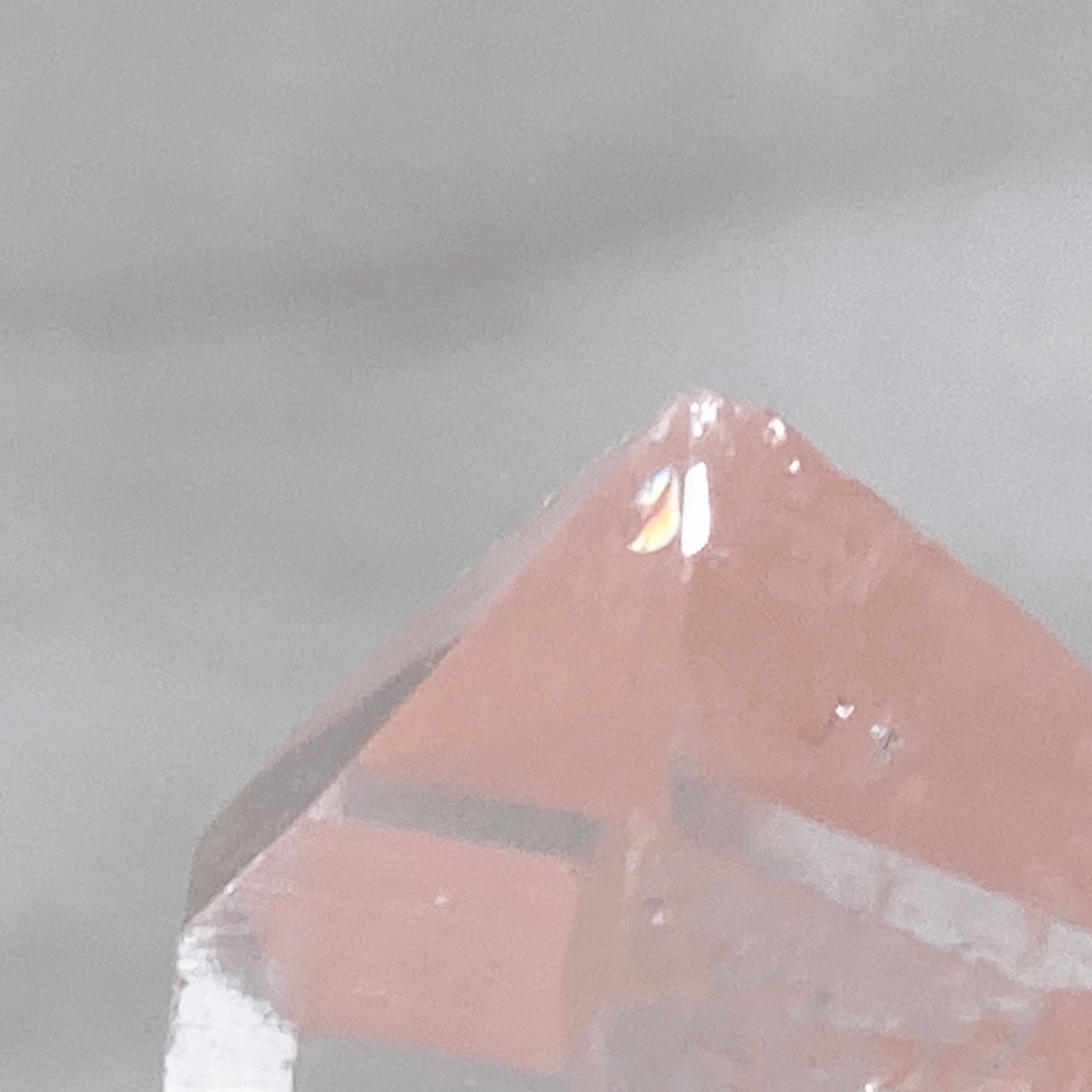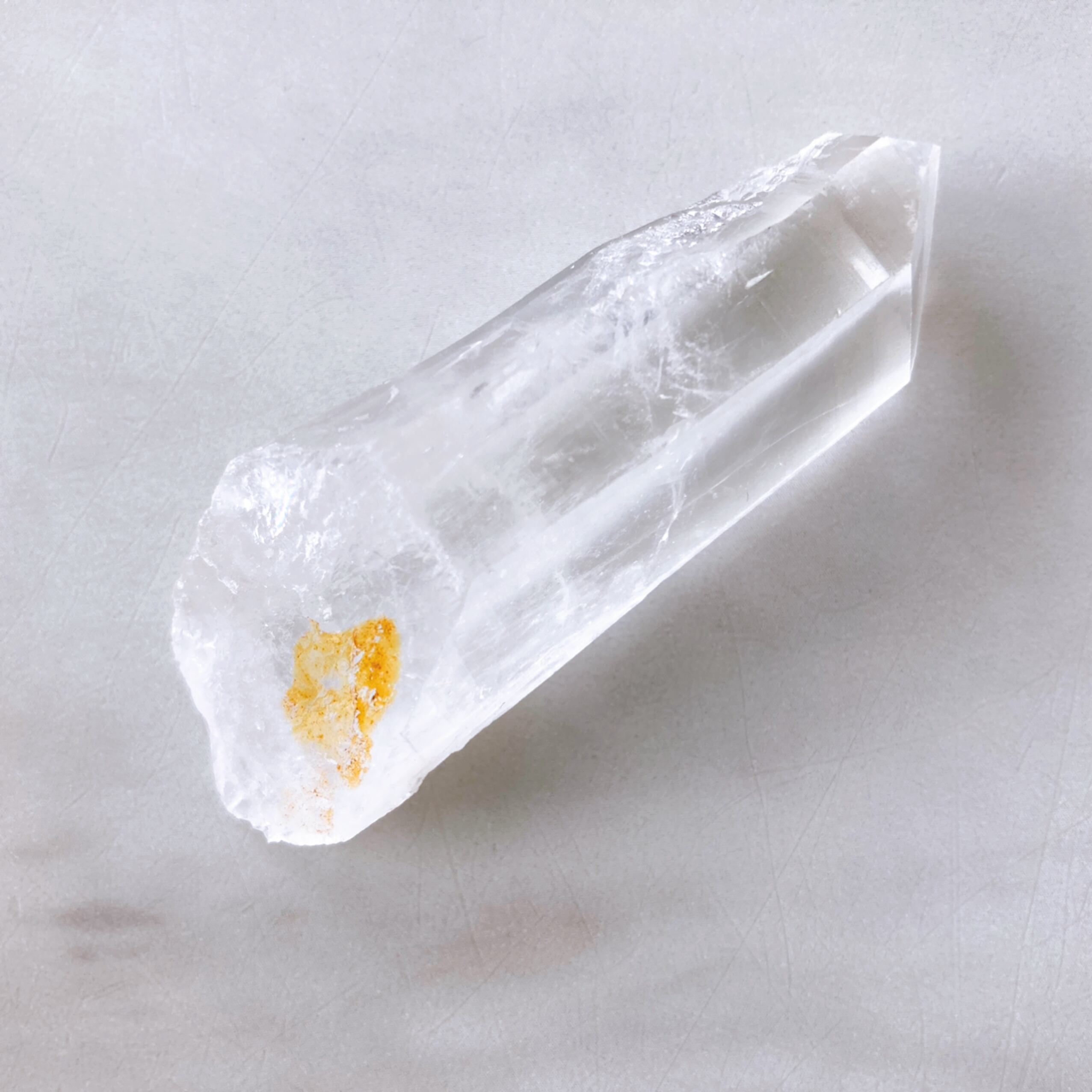 こちらのクリスタルは、底面に鉄分が付着しており、ゴールデンヒーラーの要素が見られます。また、願いを叶える力が強力だと言われるレインボーも見られます。