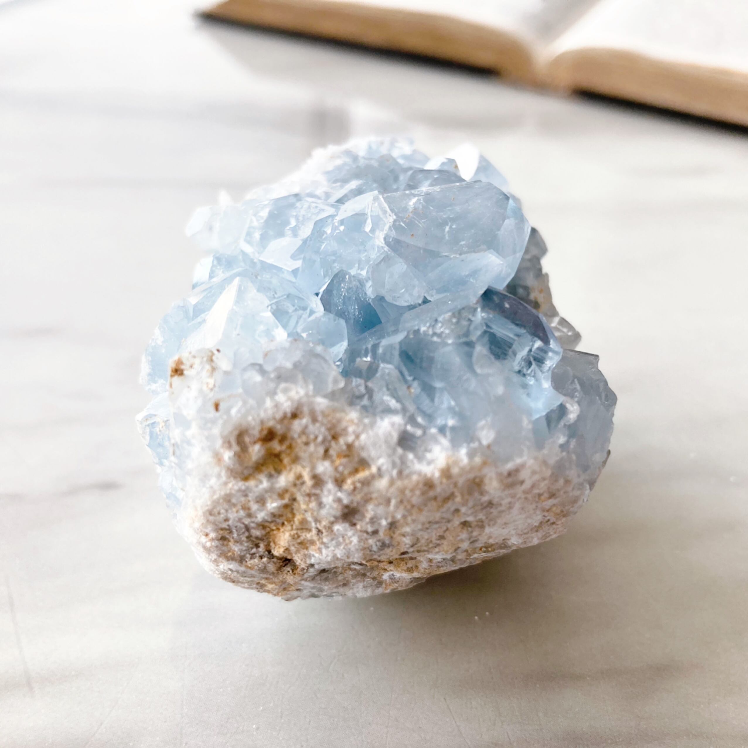 天青石という、青く晴れた空を連想させる和名を持つ、美しいスカイブルーのセレスタイト。ラテン語で「天国のような」という意味も持っています。