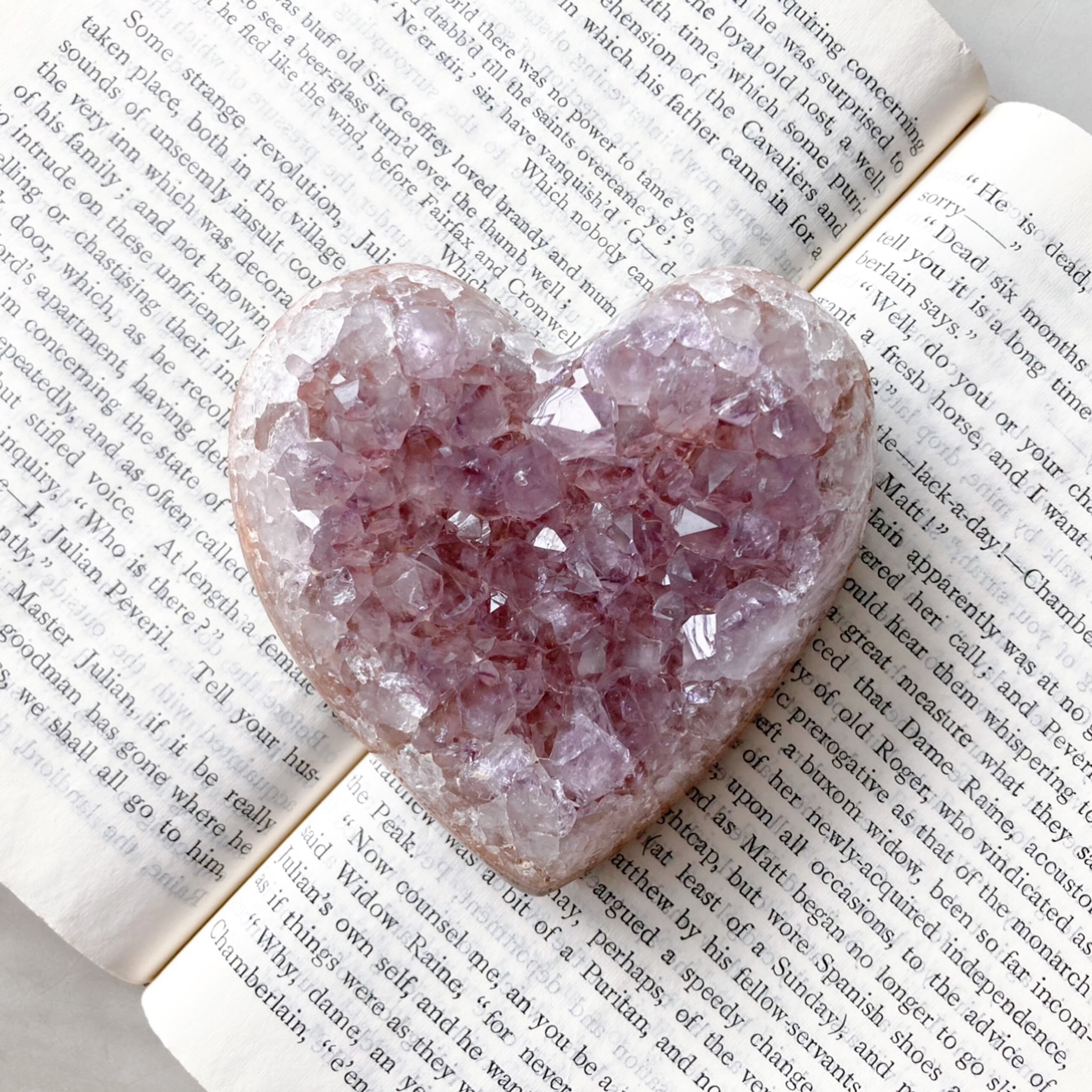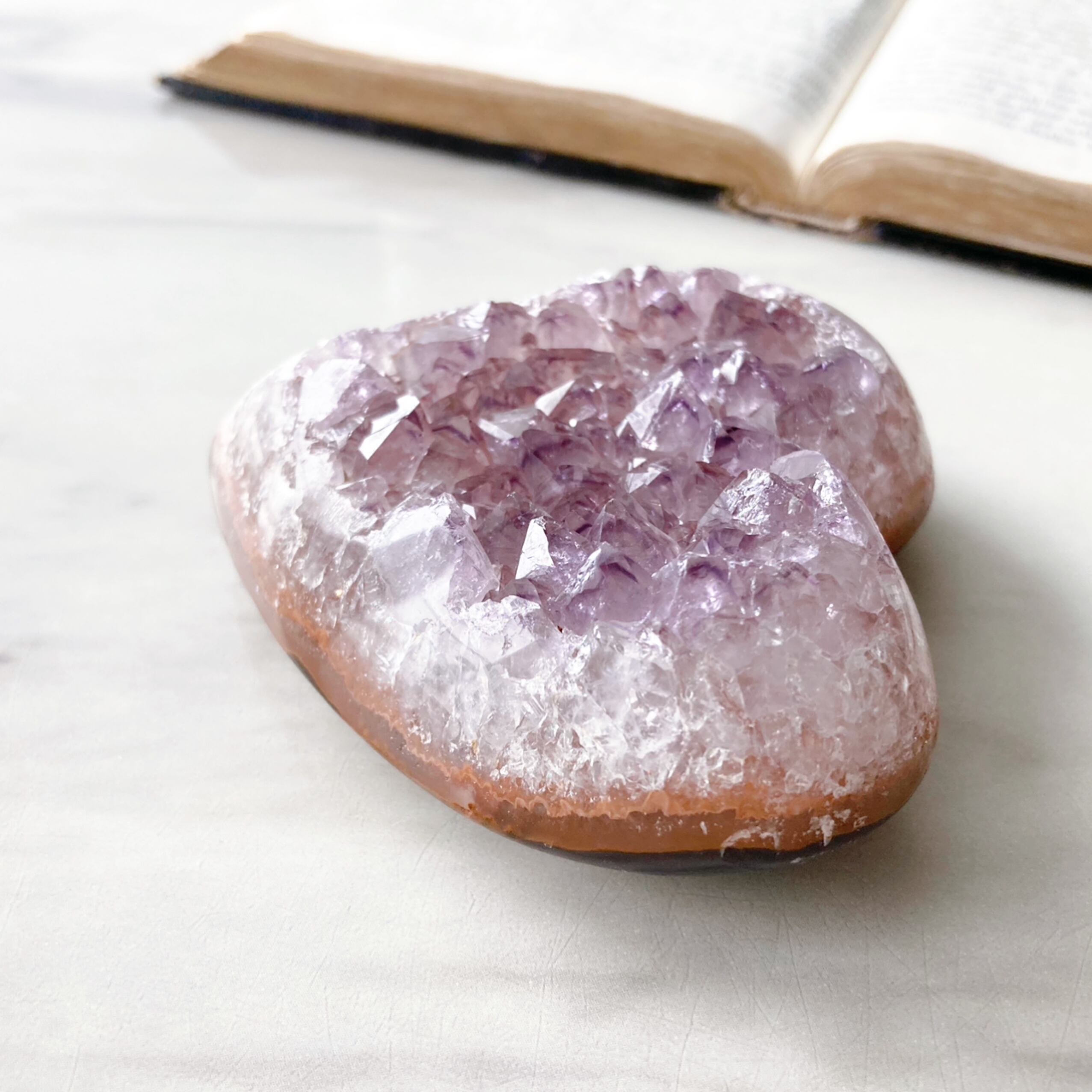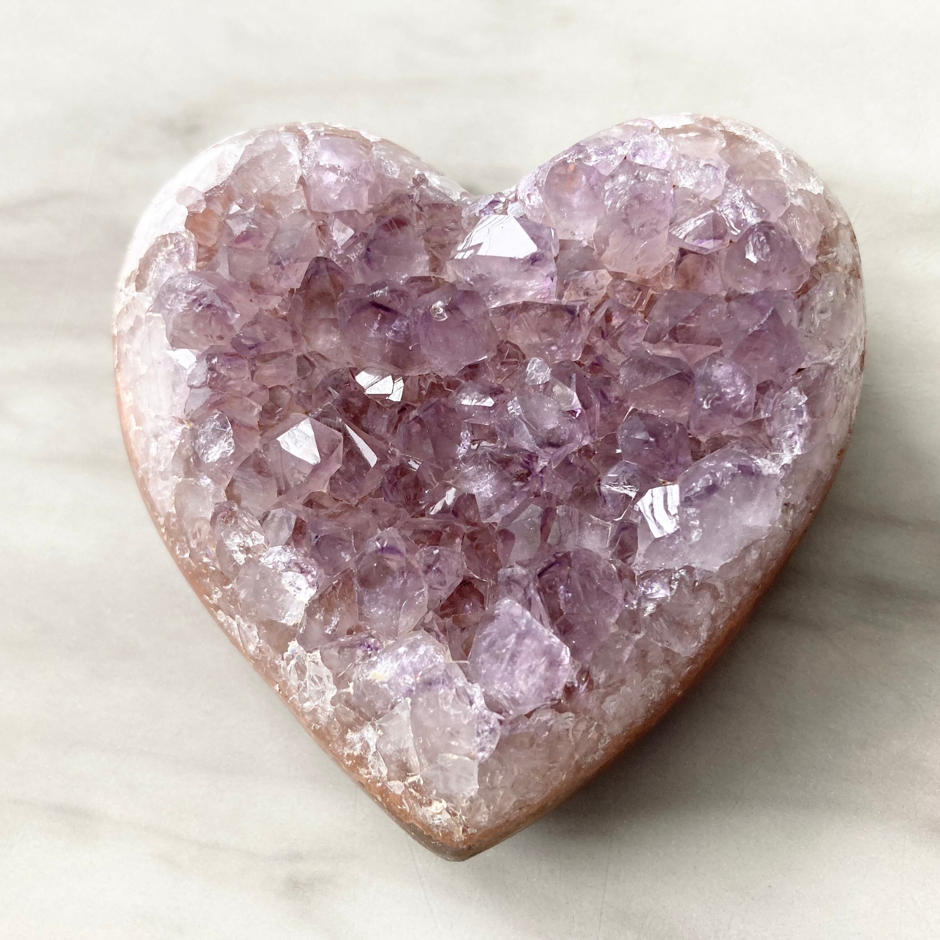 ハート形のアメジストクラスターです。ほんのりピンクがかった色味と側面の縞模様が素敵です。レインボーも見られます。
