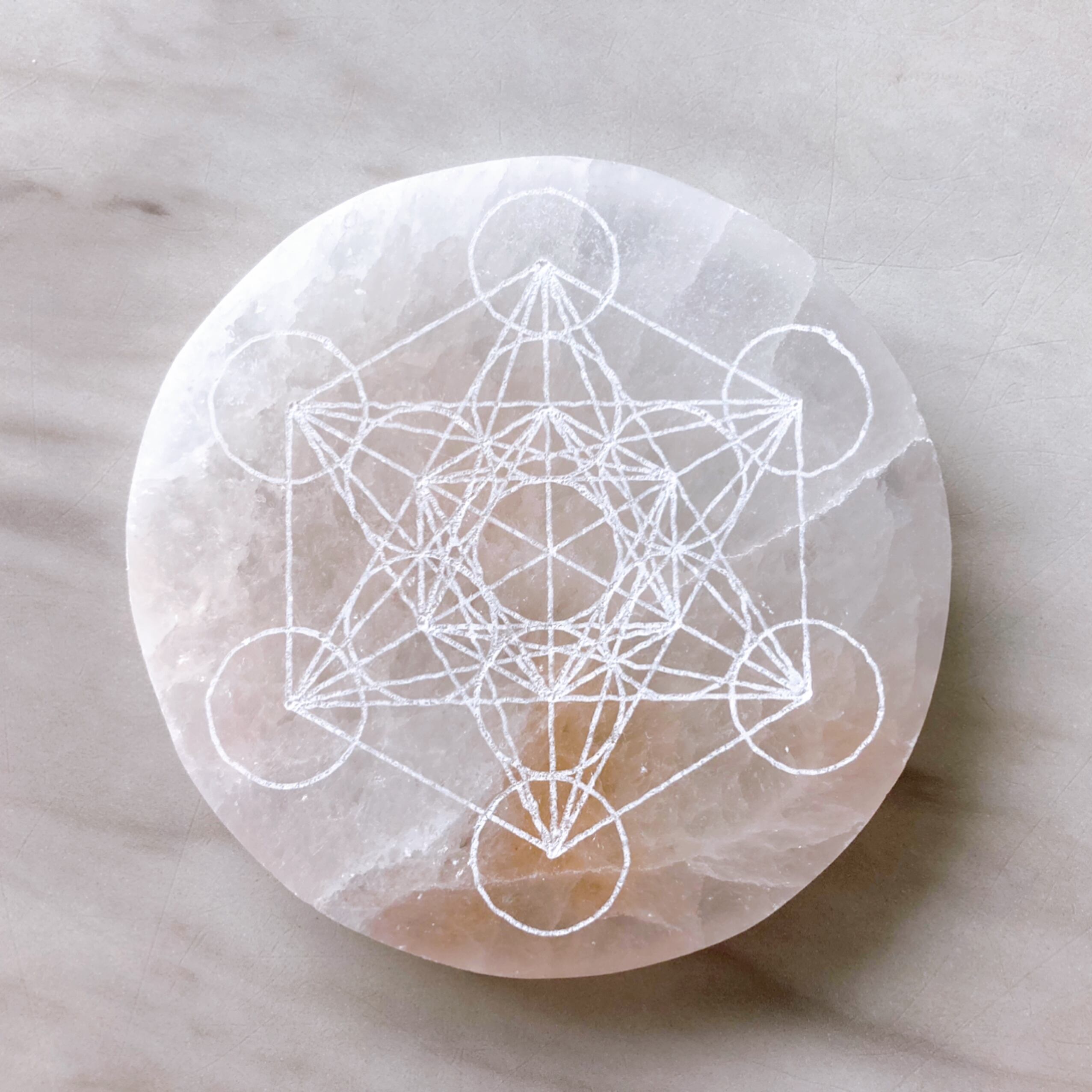 セレナイトの神聖幾何学プレートです。クリスタルグリッドや、天然石のディスプレイなど、自由な発想でお使いください。こちらは、オレンジの色味がかかっているオレンジセレナイトです。