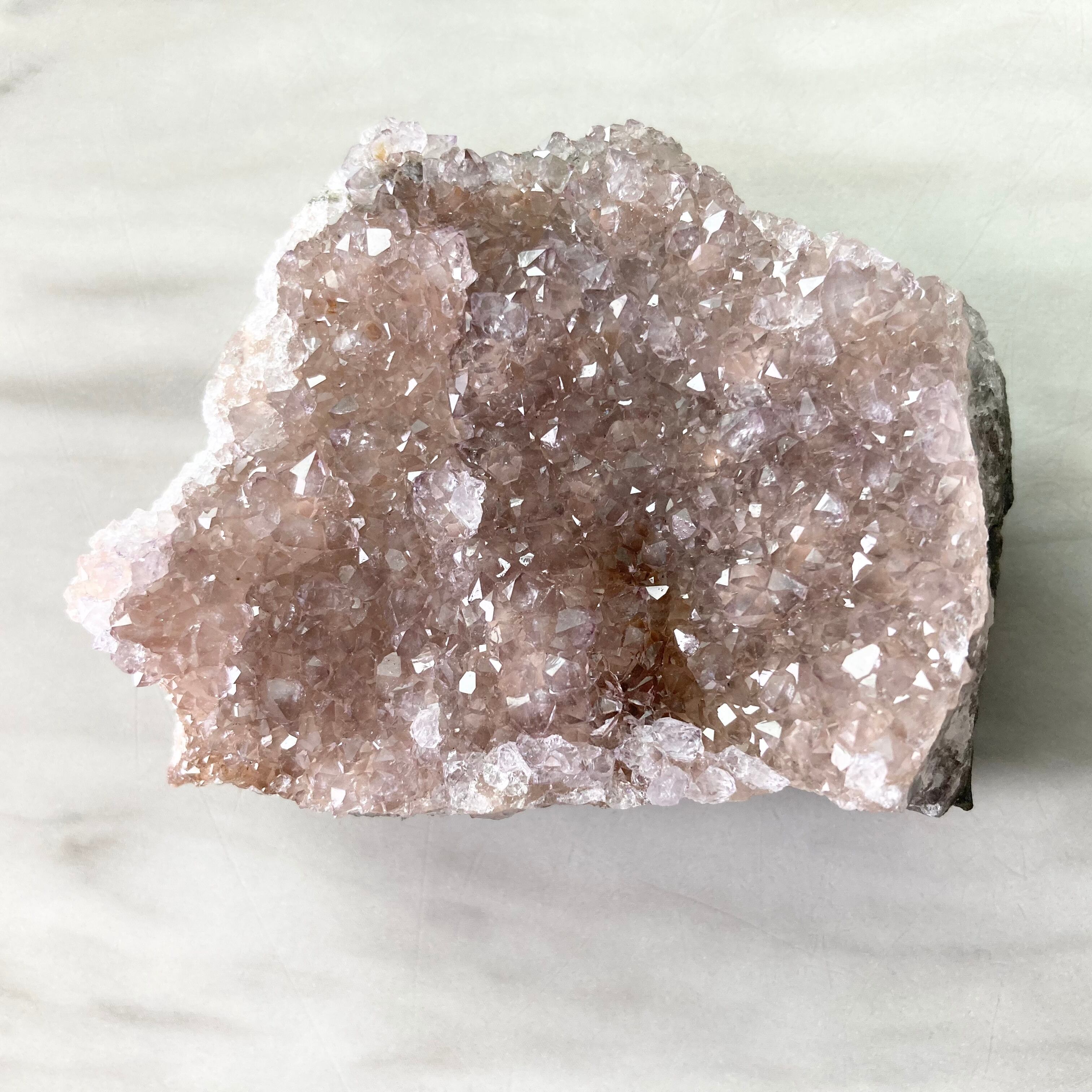 スモーキーなピンクパープルのドゥルージーが美しいアメジストクラスターです。