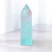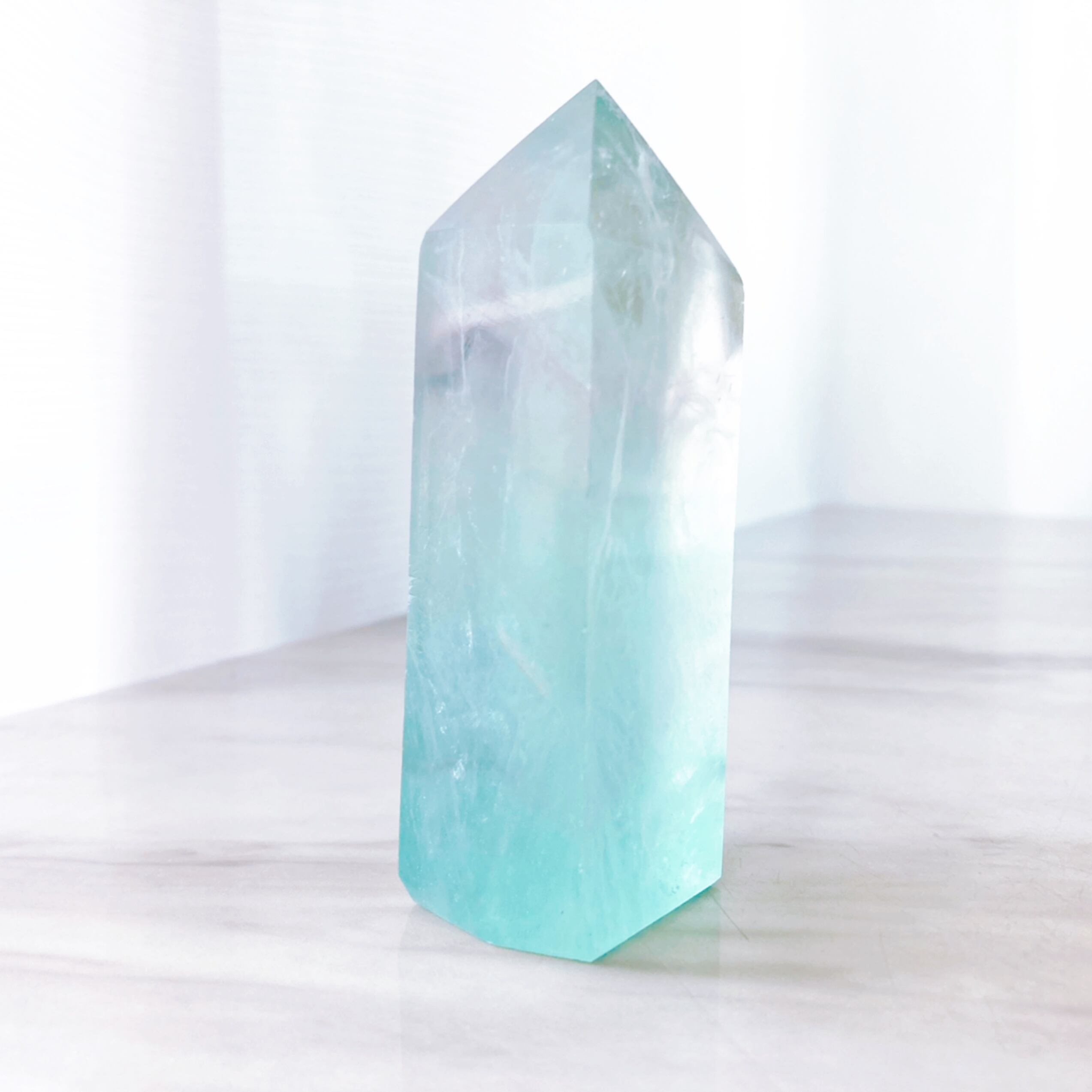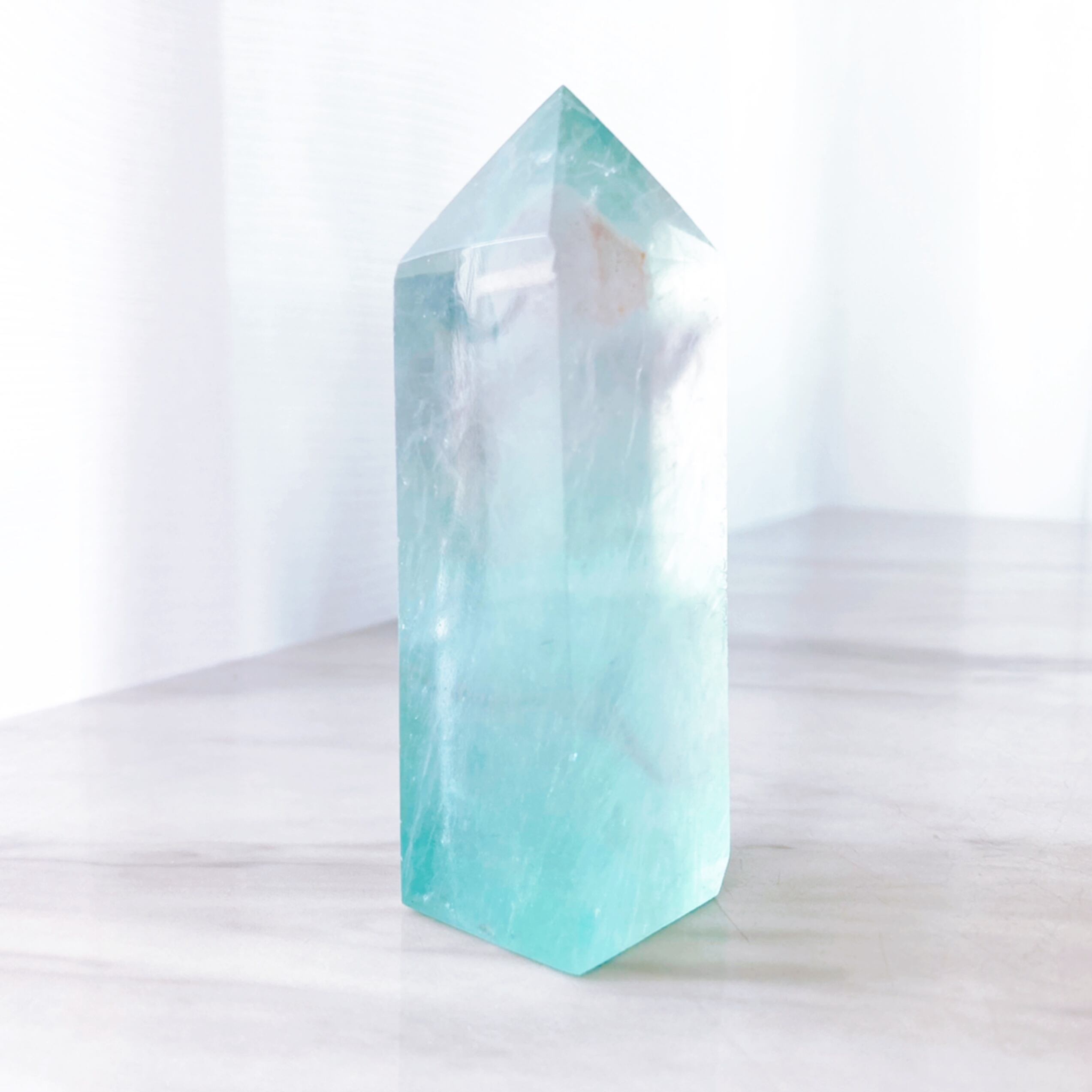爽やかなミントグリーンのフローライトタワーです。底面の角が2か所カットされているデザインです。