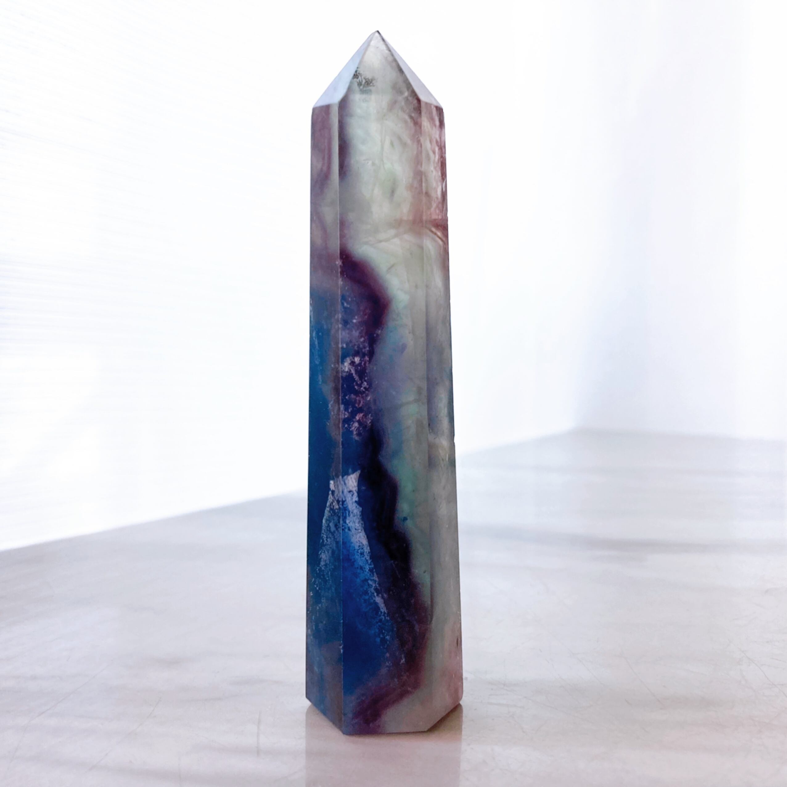 淡いグリーン、濃いめのパープルとブルーの色合いと躍動感のある模様がキレイなレインボーフローライトのタワーです。レインボーも見られます。