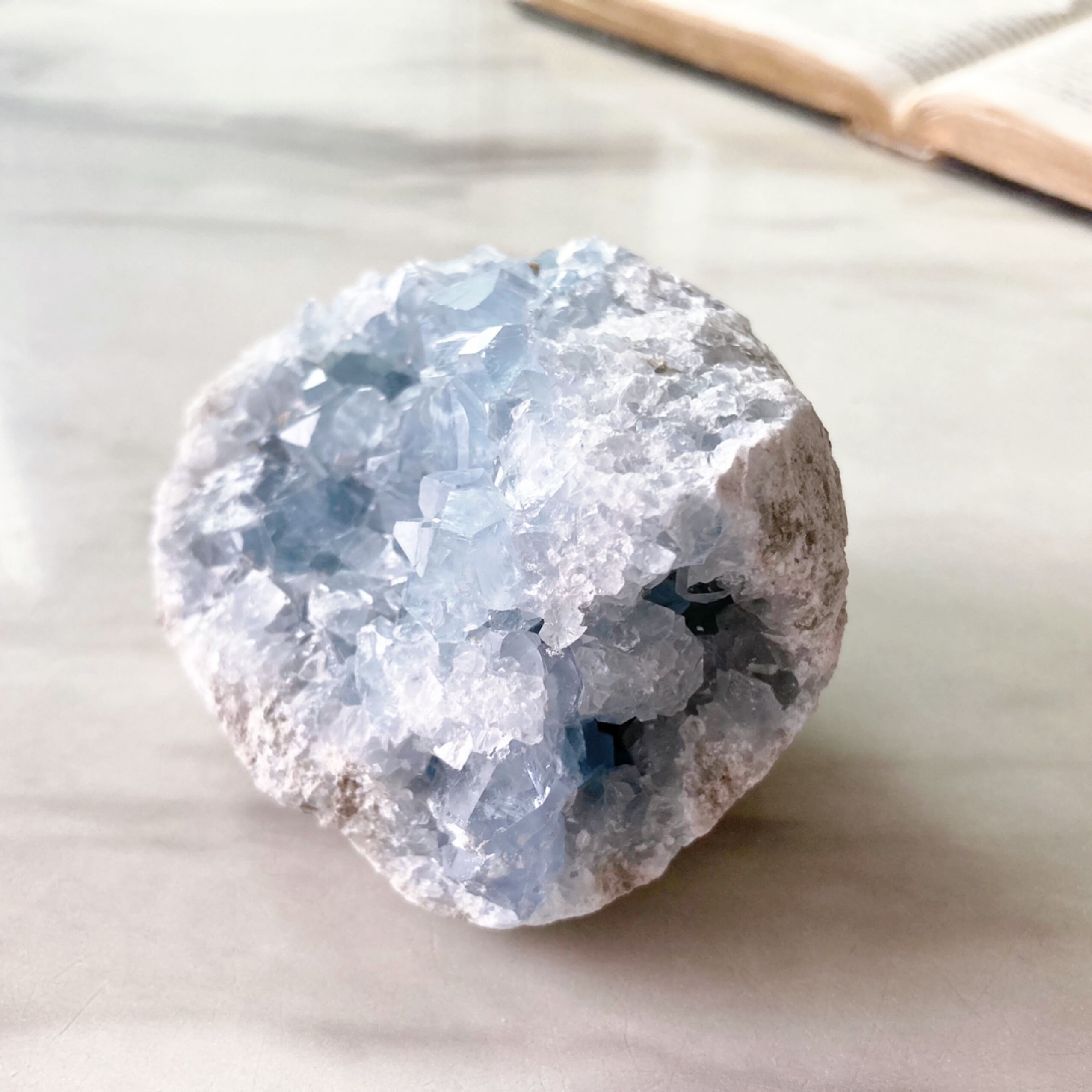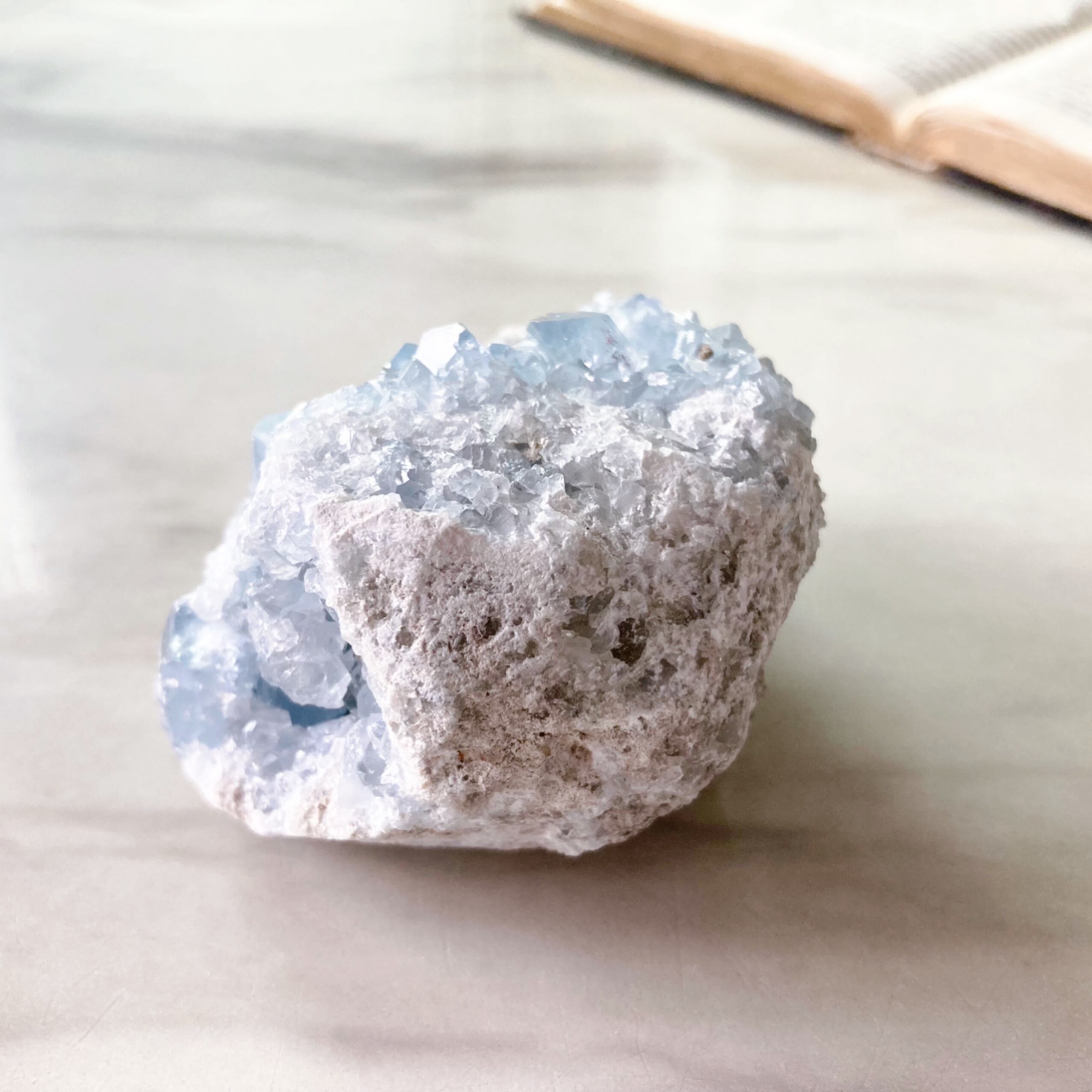 天青石という、青く晴れた空を連想させる和名を持つ、美しいスカイブルーのセレスタイト。ラテン語で「天国のような」という意味も持っています。