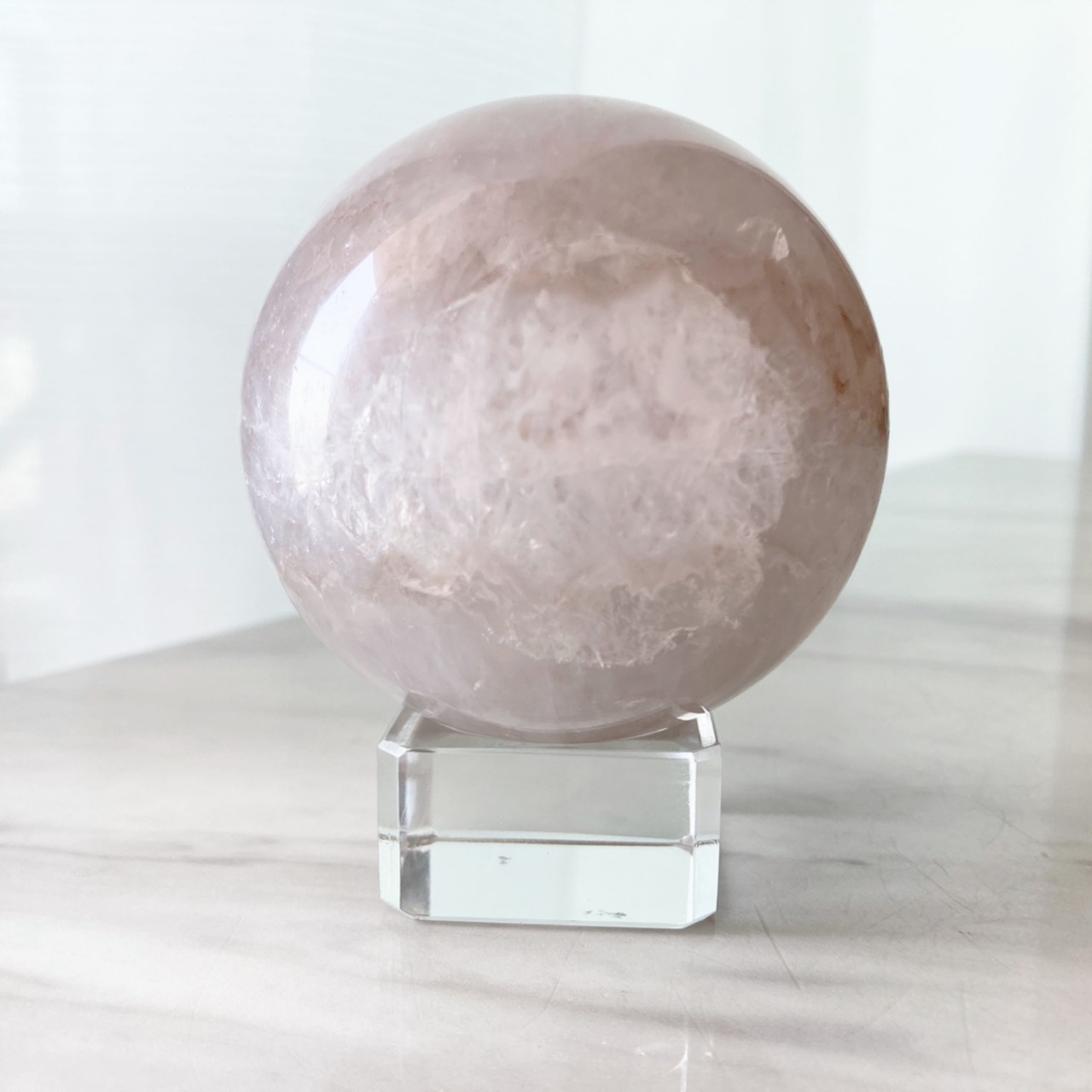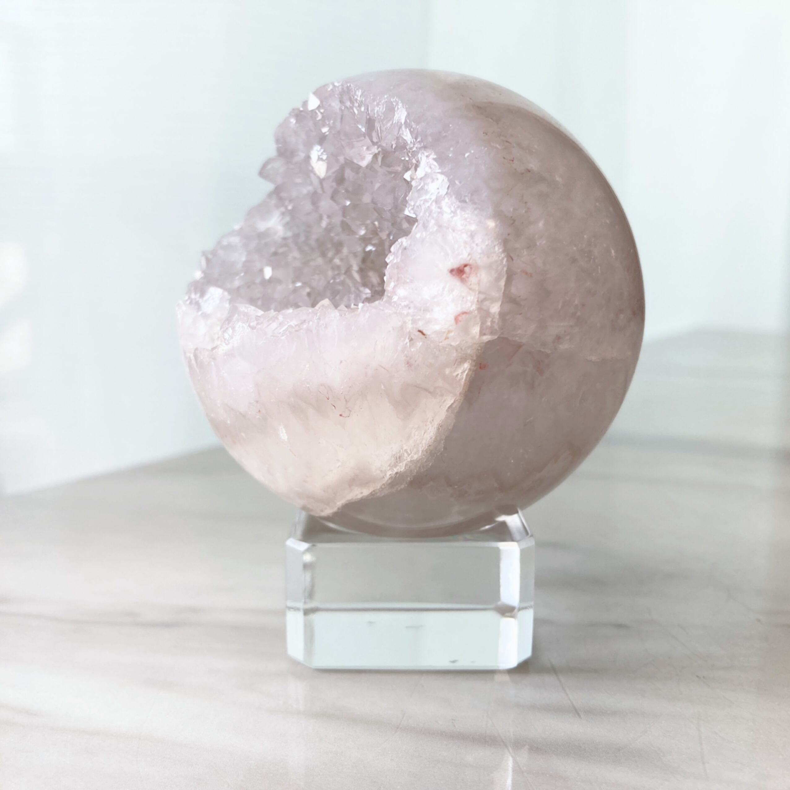 ホワイトアメジストの笑い口スフィアです。外側がライトグレー、中の結晶は透明感とテリ艶のあるクリアカラー。大変レアなクリスタルです。