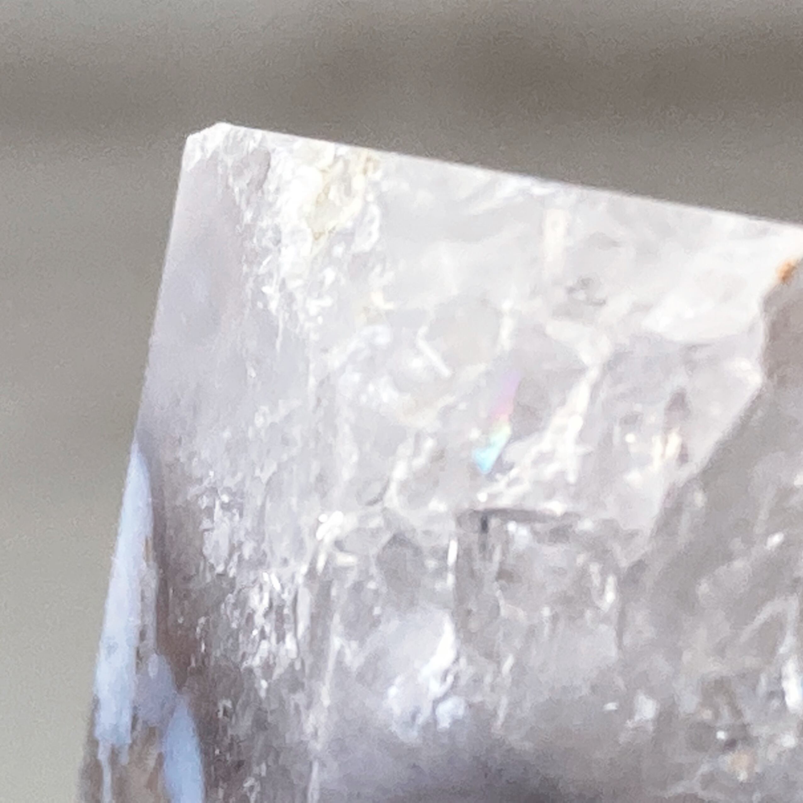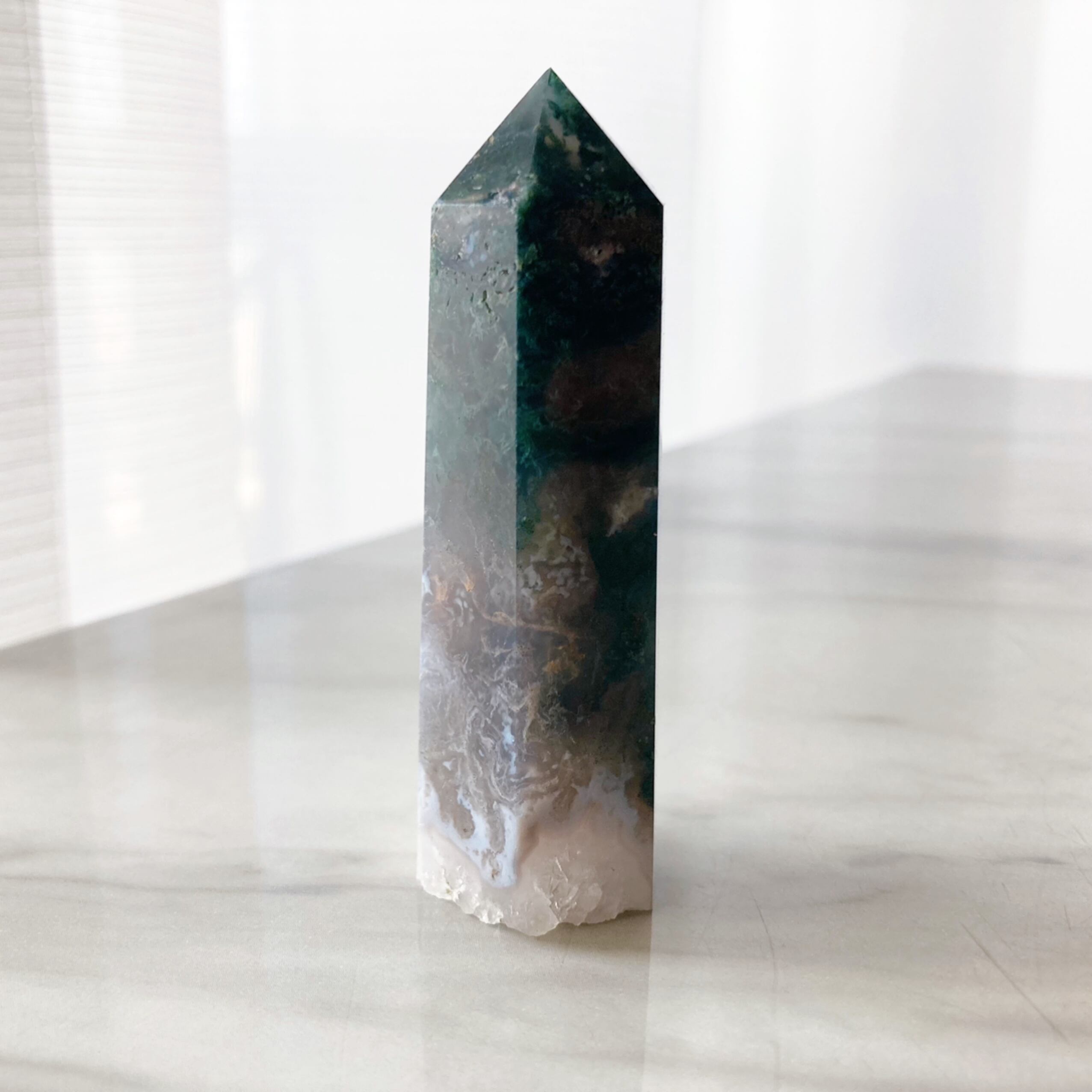 深いグリーンに淡いブルーの模様がキレイなモスアゲートタワーです。クォーツ部分には虹も見られます。