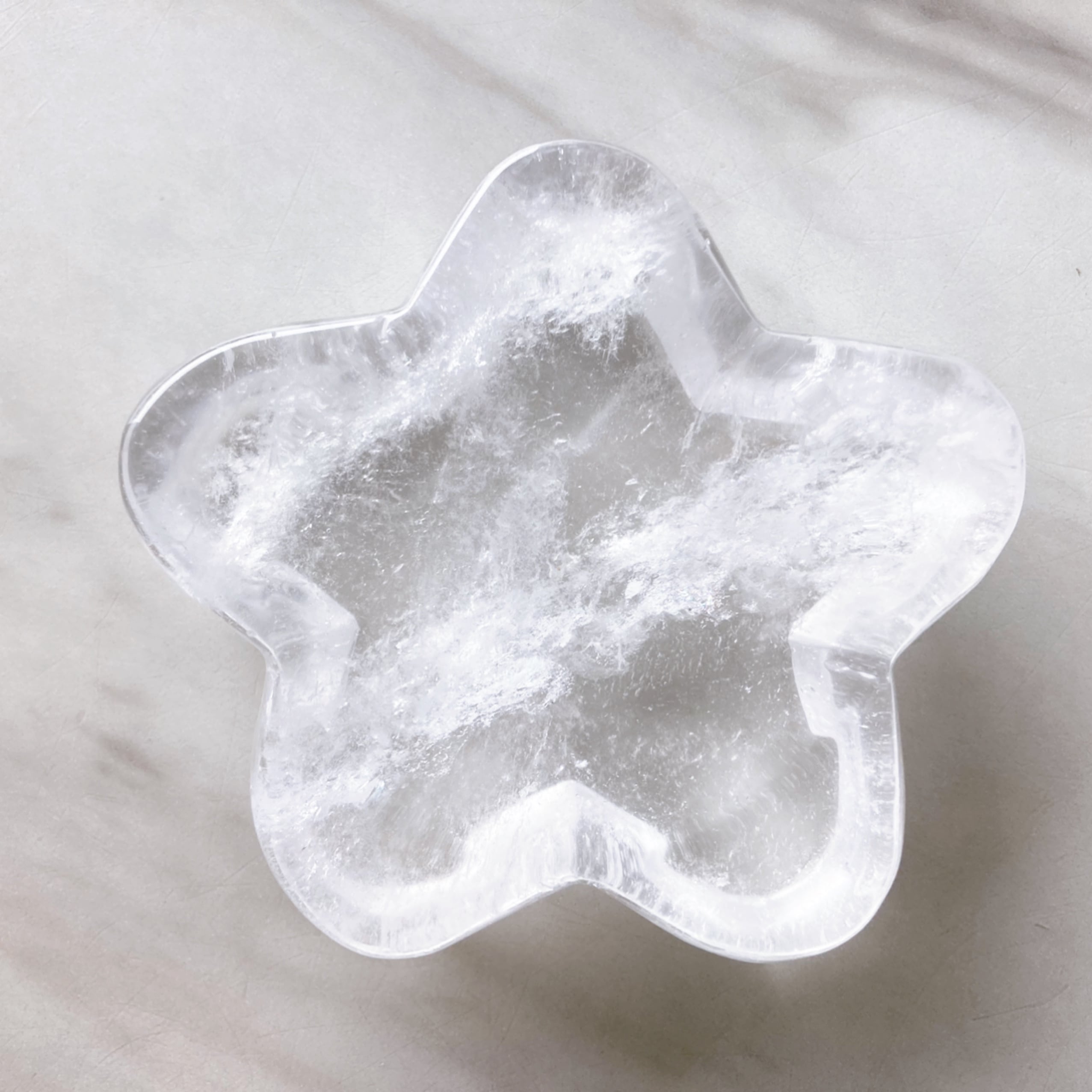 クリアクォーツのフラワー型トレイです。アクセサリーや天然石の浄化など、使い方は自由自在です。