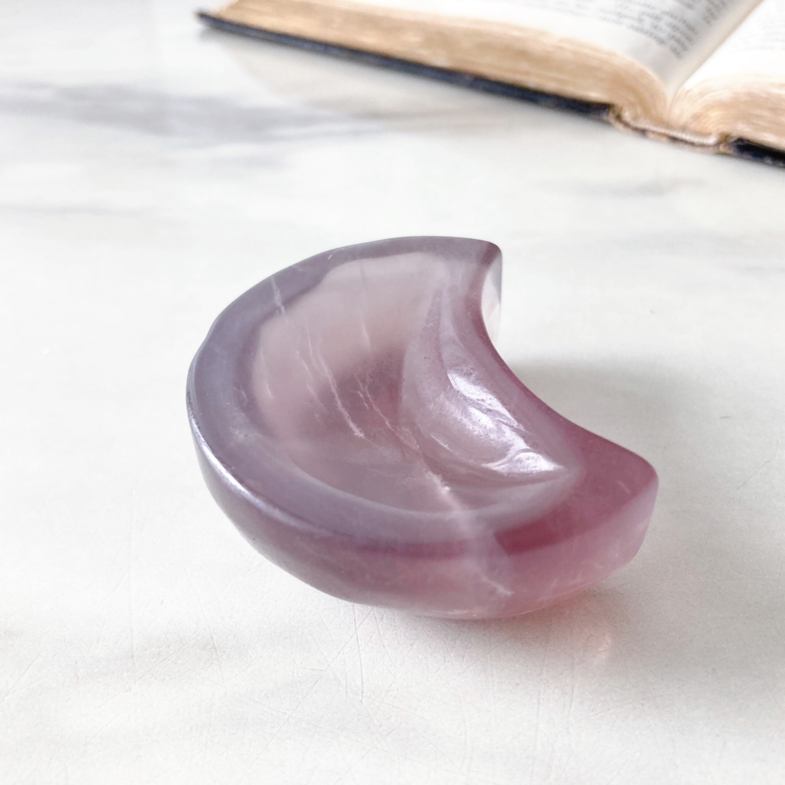 赤みのあるレッドパープルの色味が素敵な、フローライトのムーン型トレイです。リングやピアスを置けるくらいの小さめサイズです。