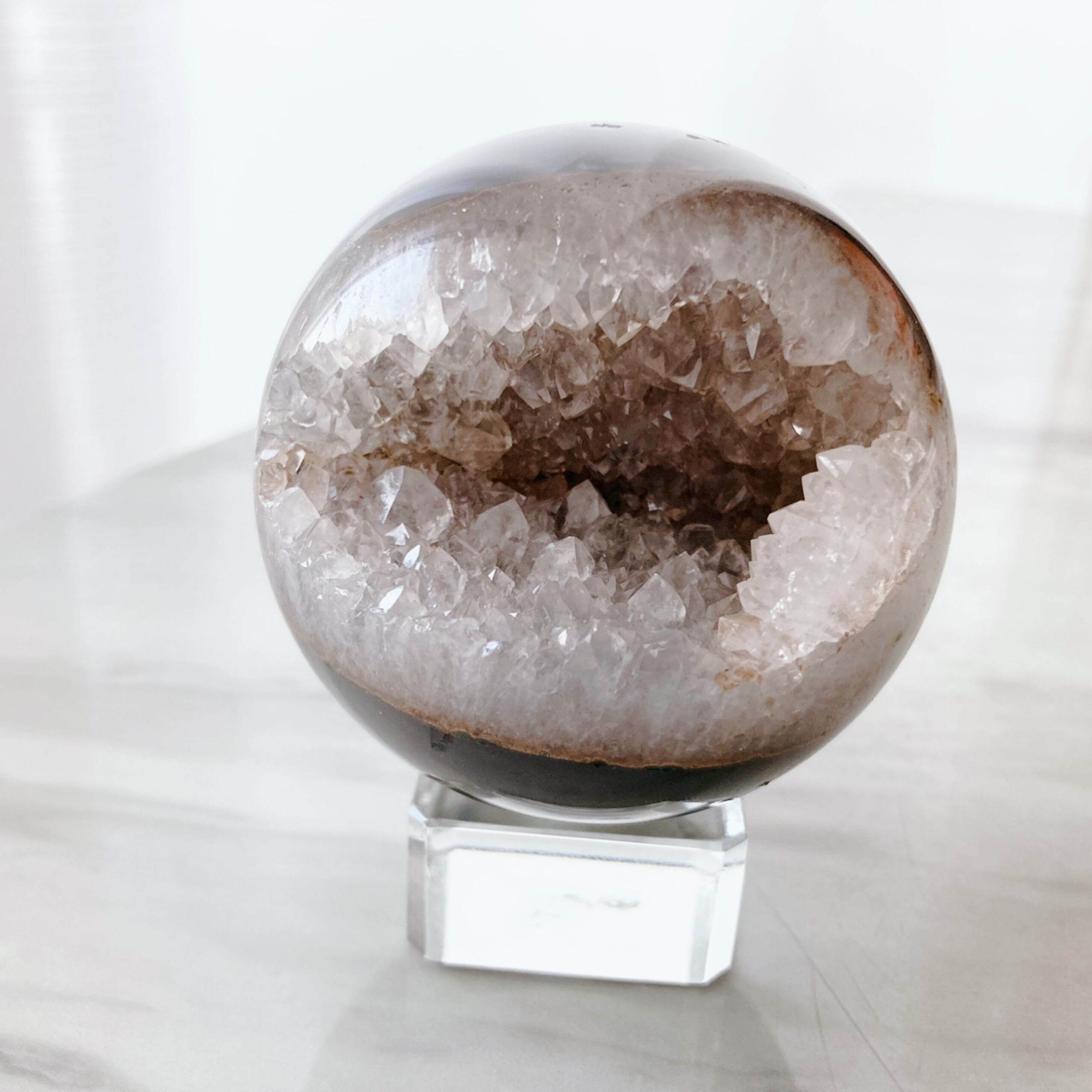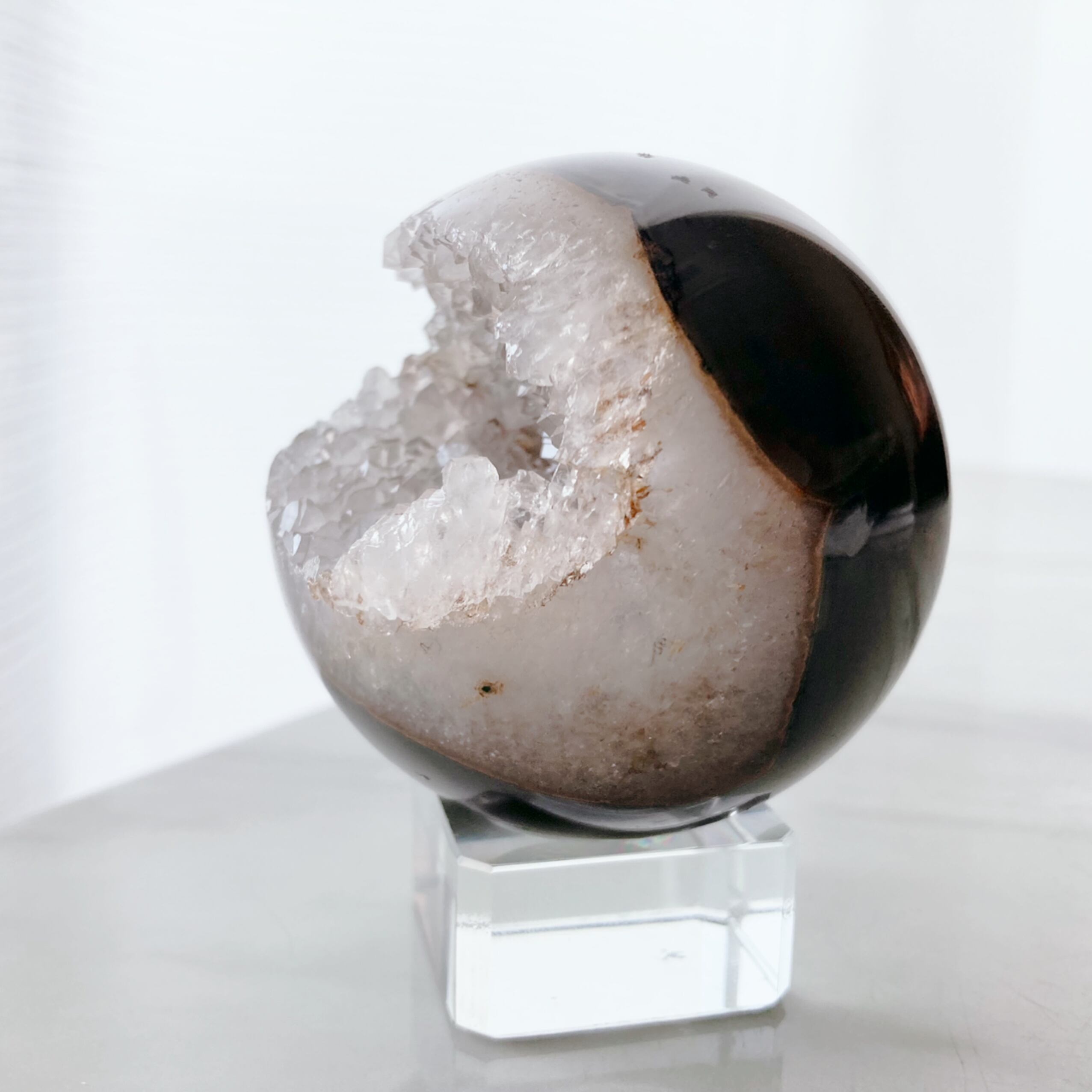 ホワイトアメジストの笑い口スフィアです。外側がブラックのアゲート、中の結晶は透明感とテリ艶のあるクリアカラー。大変レアなクリスタルです。