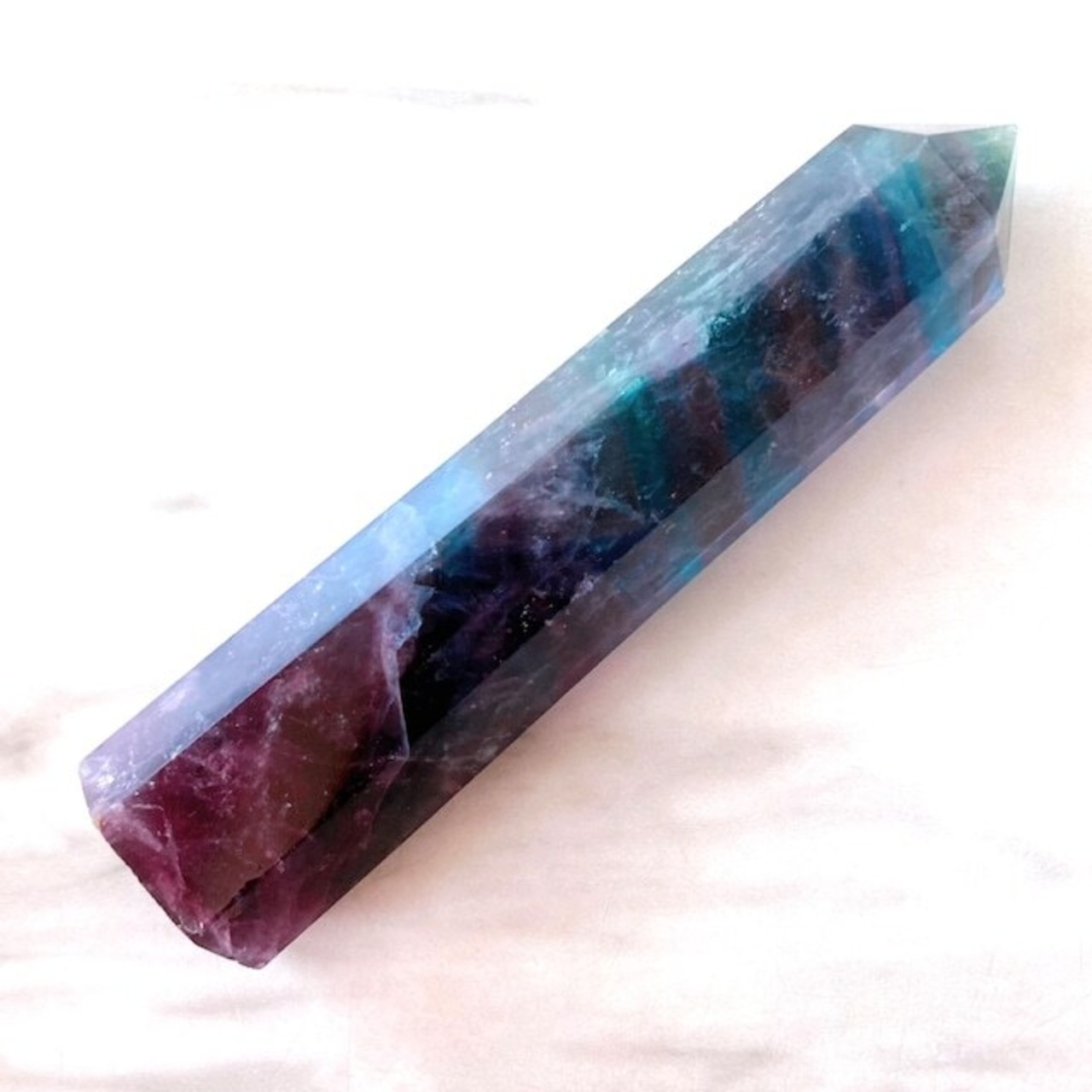 深いブルーとパープルのグラデーションがキレイなフローライトタワーです。底部が1ヶ所カットされたデザインで、レインボーも見らます。こちらも先端にやや欠けがあります。
