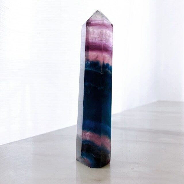 濃いめのパープルとブルーの層が美しいフローライトのタワーです。レインボーも見られます。先端にほんの少しの欠けがあります。