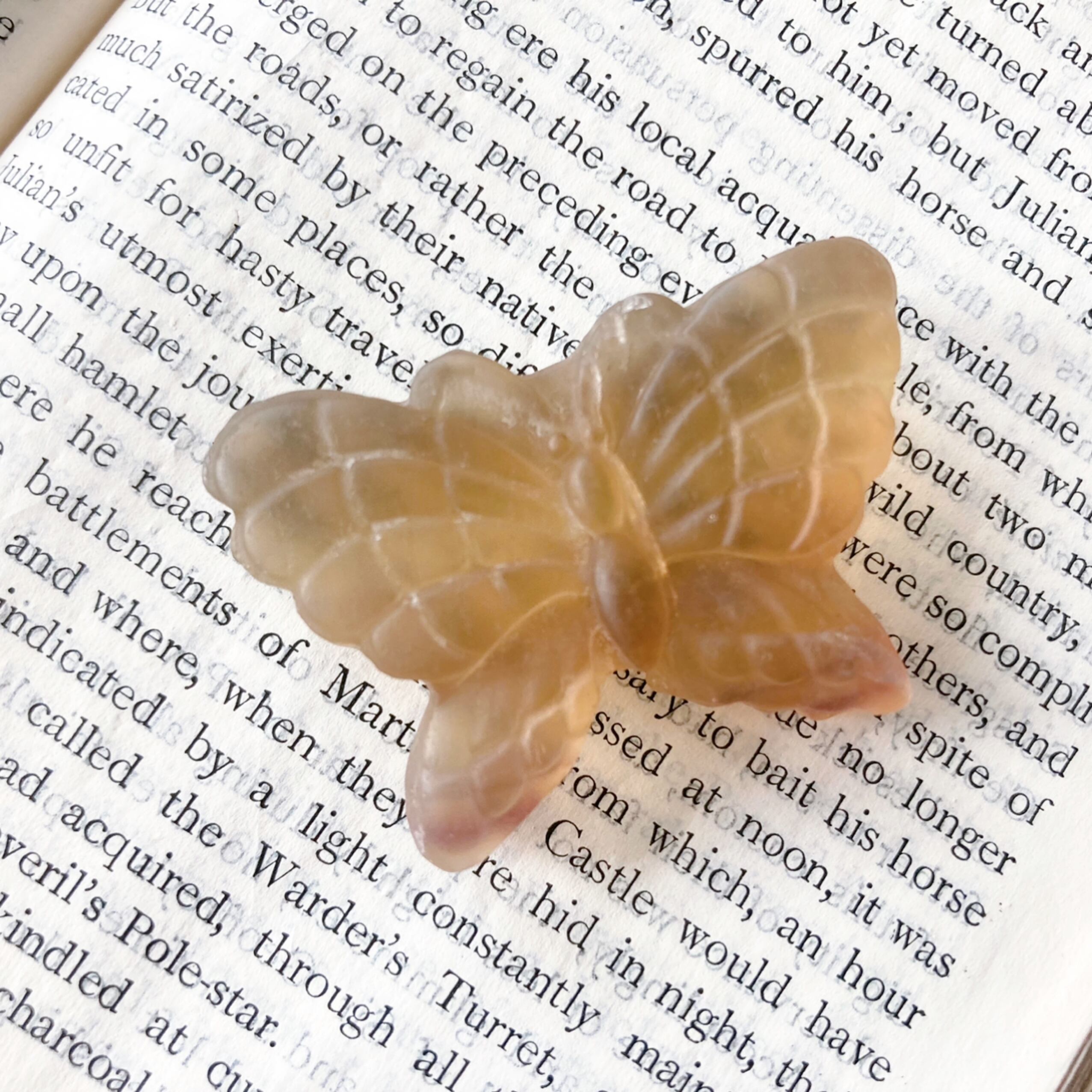 蝶の形のフローライトです。イエローにパープルの縞模様が素敵です。
