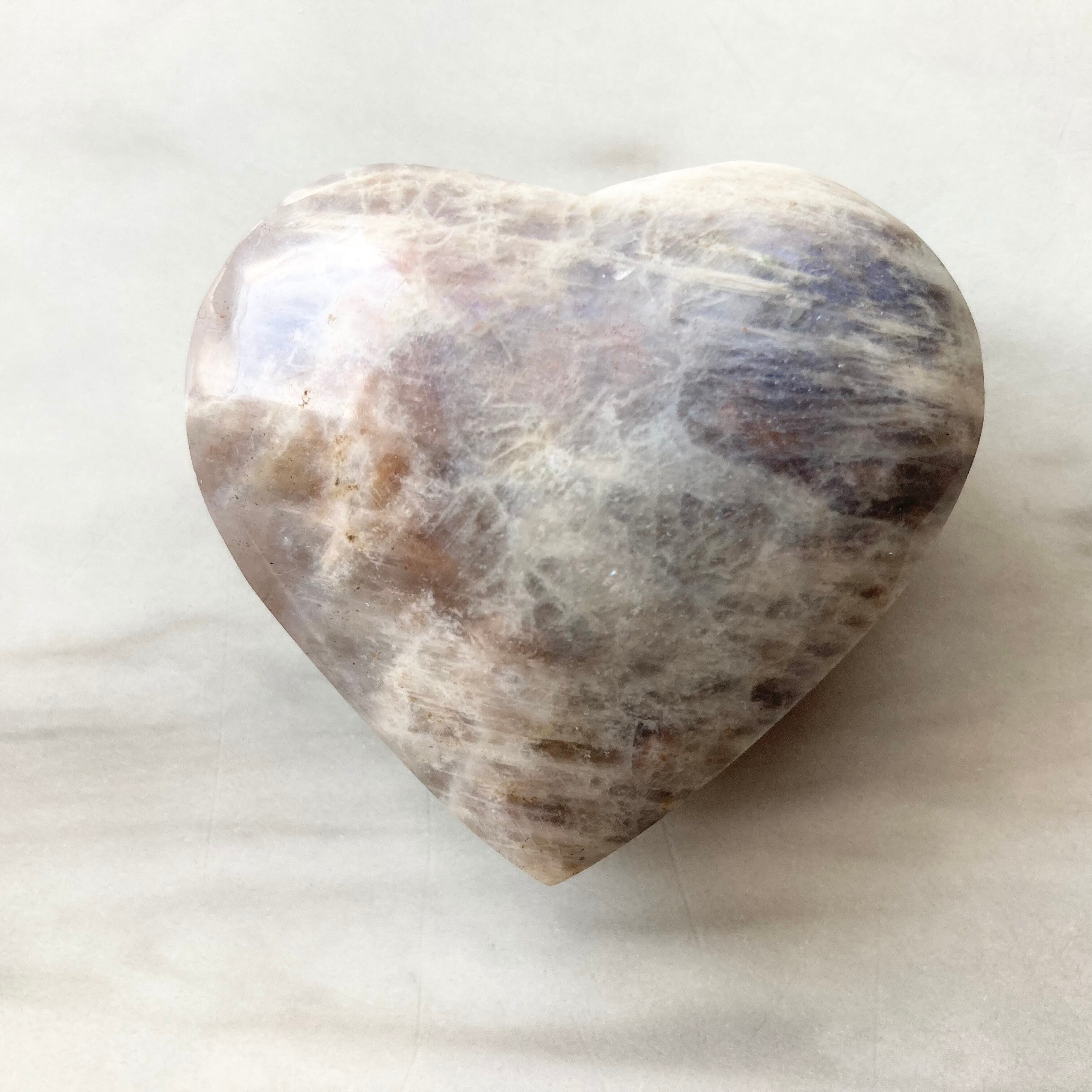 サンムーンストーンのハート型パームストーンです。ブルーのシラーと虹色のラメのような輝きが神秘的です。
