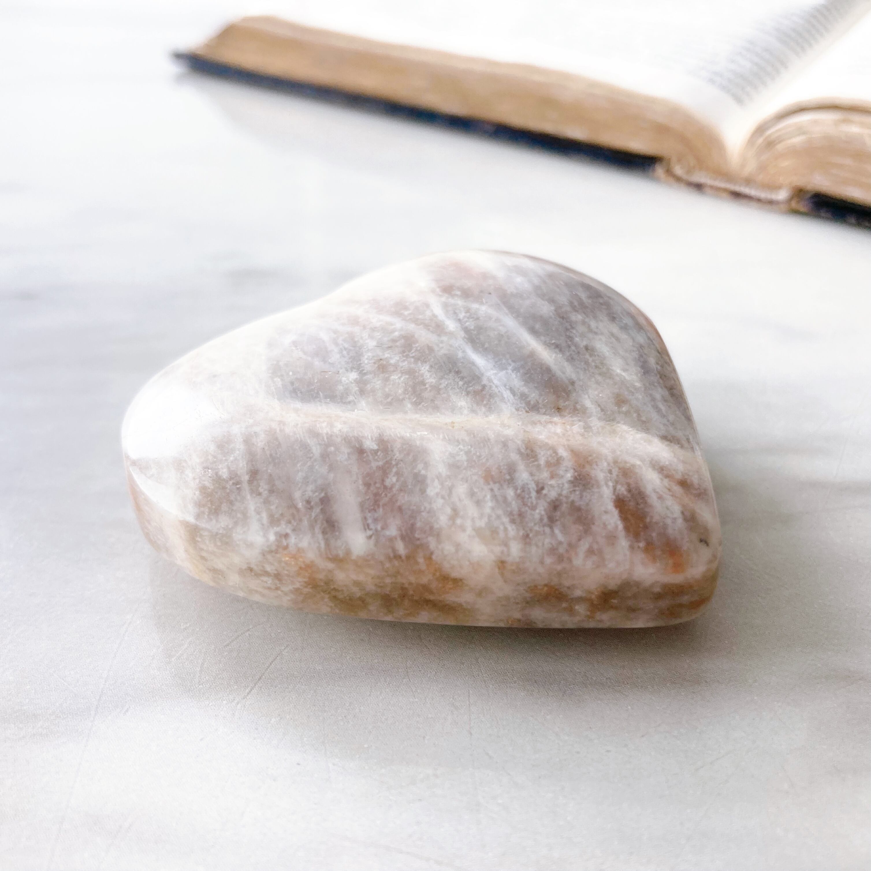 サンムーンストーンのハート型パームストーンです。ブルーのシラーと虹色のラメのような輝きが神秘的です。