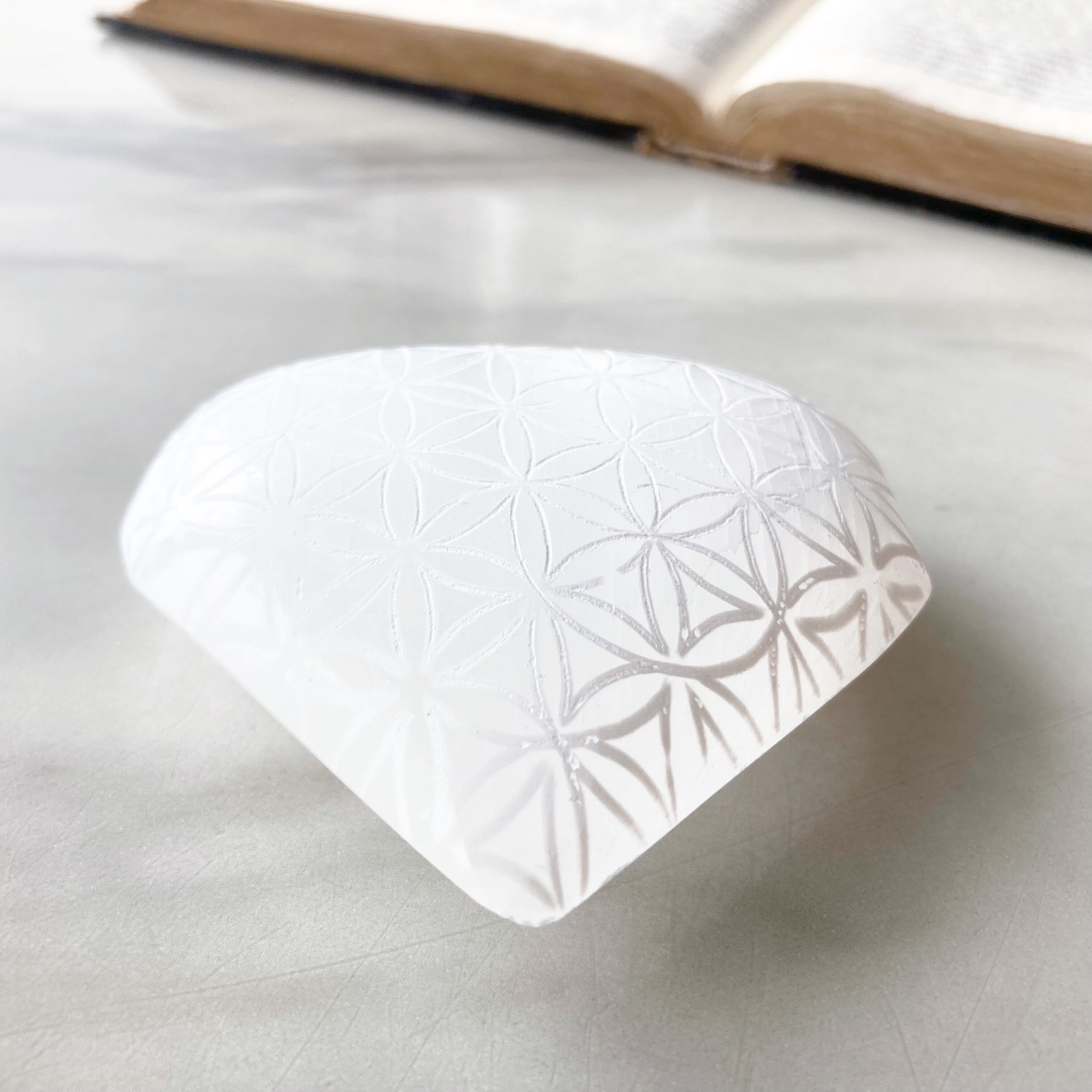 神聖幾何学・フラワーオブライフの模様が入った、セレナイトのハート型パームストーンです。