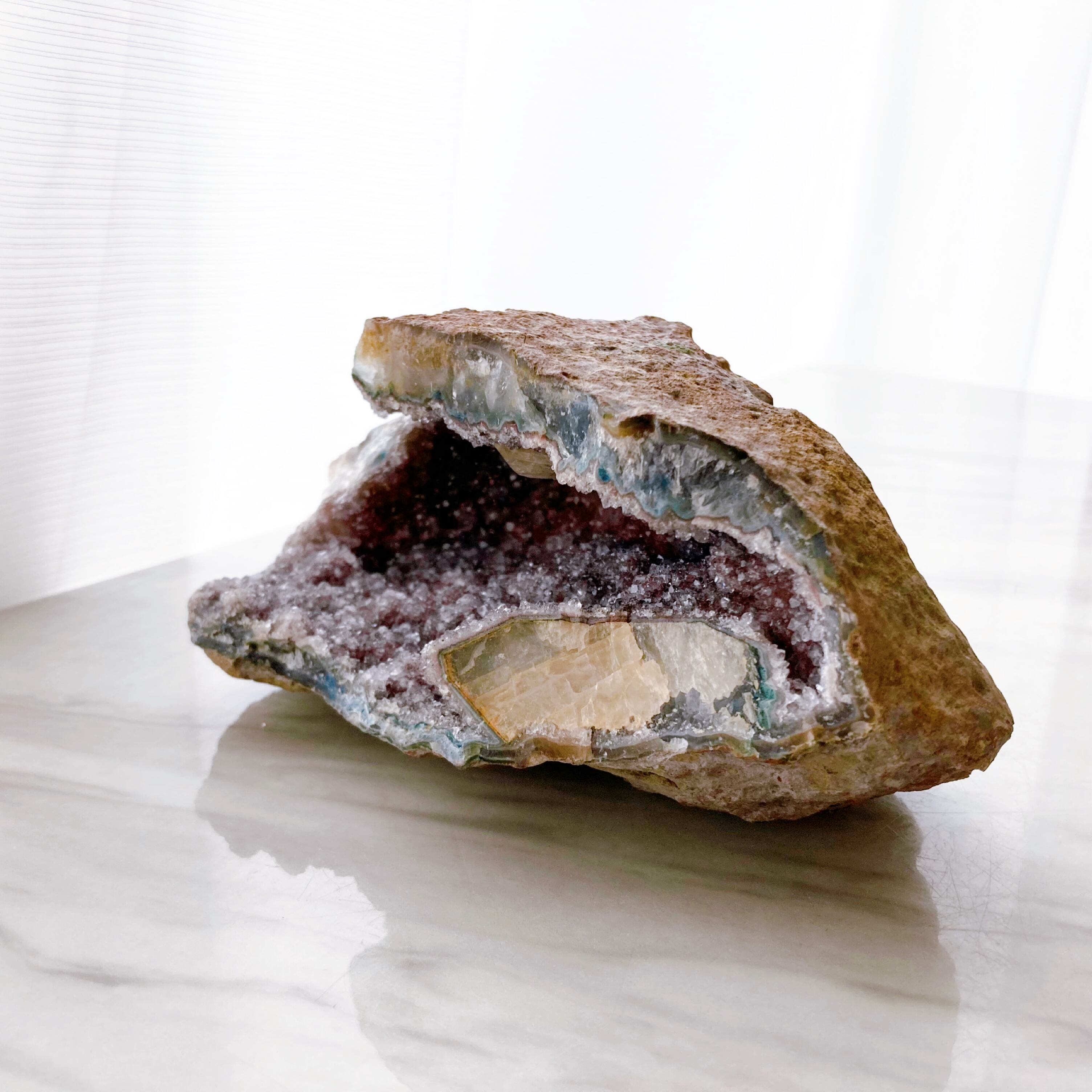 ウルグアイ産アメジストジオードの笑い口です。開運アイテムとしてよく知られています。水晶玉を入れておくと龍神様が住み着き、開運をもたらすと言われています。カルサイトも共生しています。