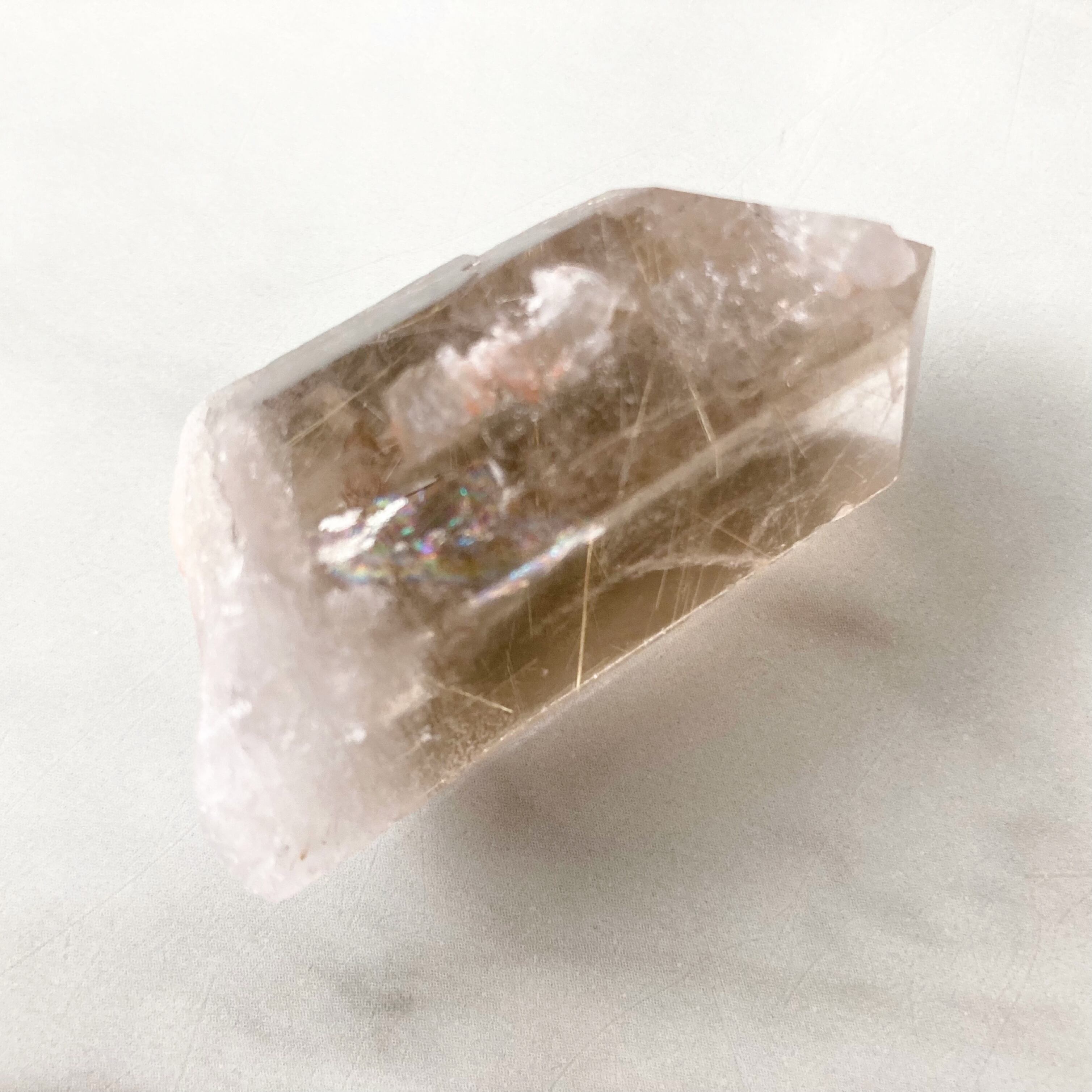 スモーキークォーツの中にゴールデンルチルが入っています。願いを叶える力が強いとされるレインボーも見られます。