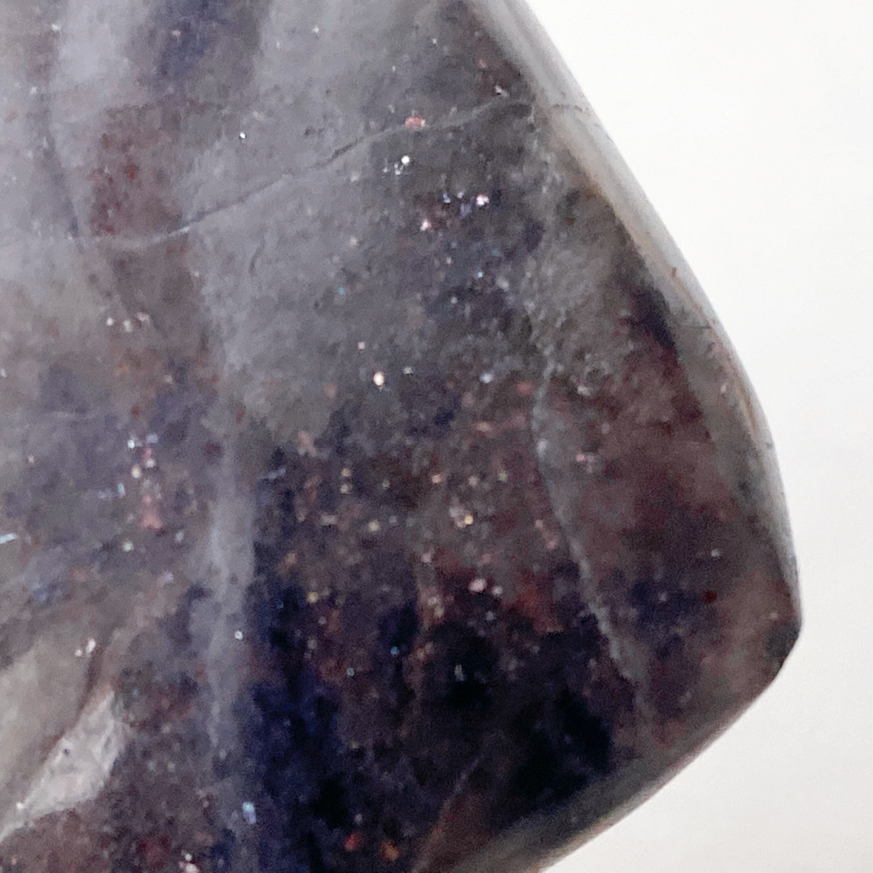 ぷっくりした形が可愛い、アイオライトサンストーンのハート型パームストーンです。アイオライトにキラキラ輝くアベンチュレッセンスが見られます。鉱物名はコーディエライトです。