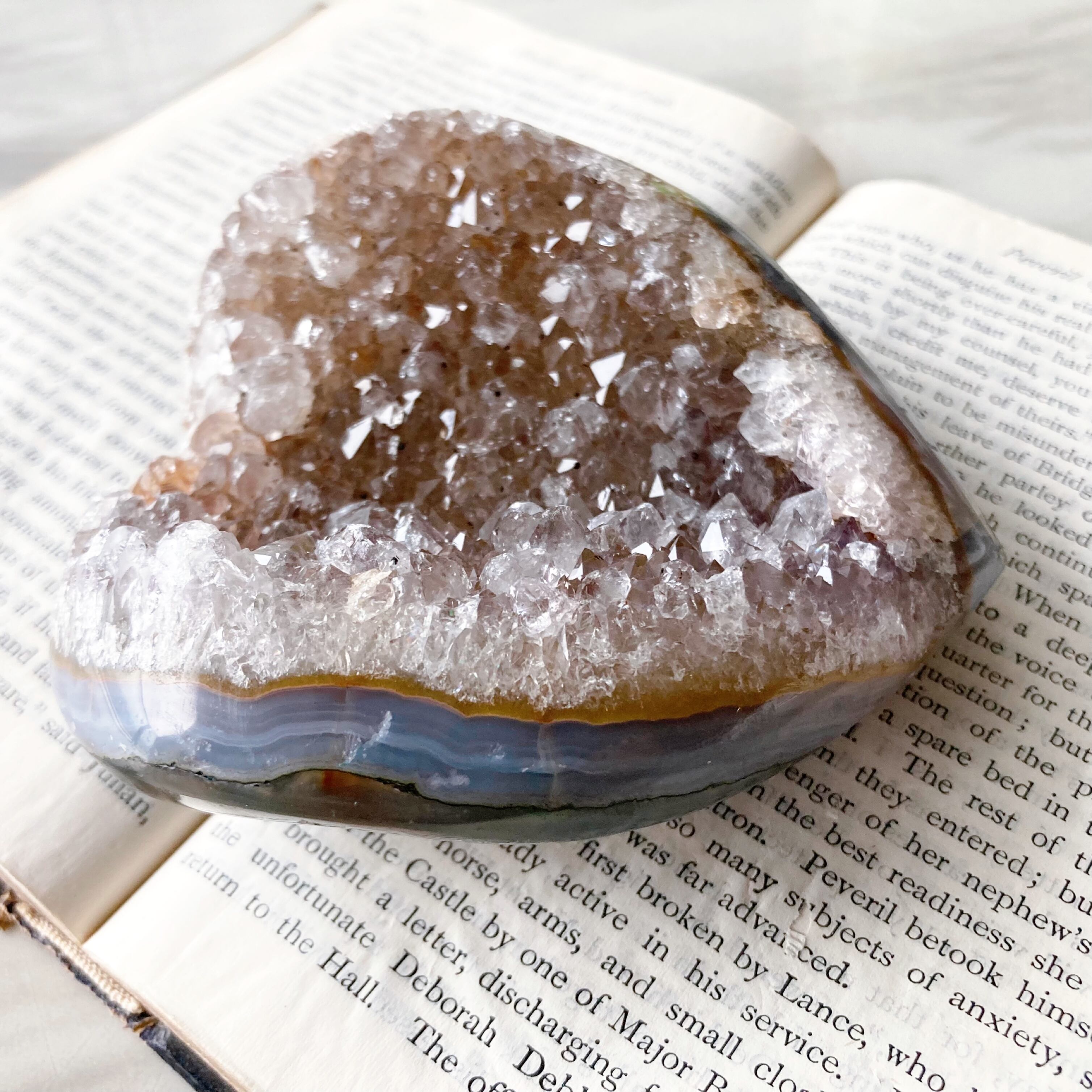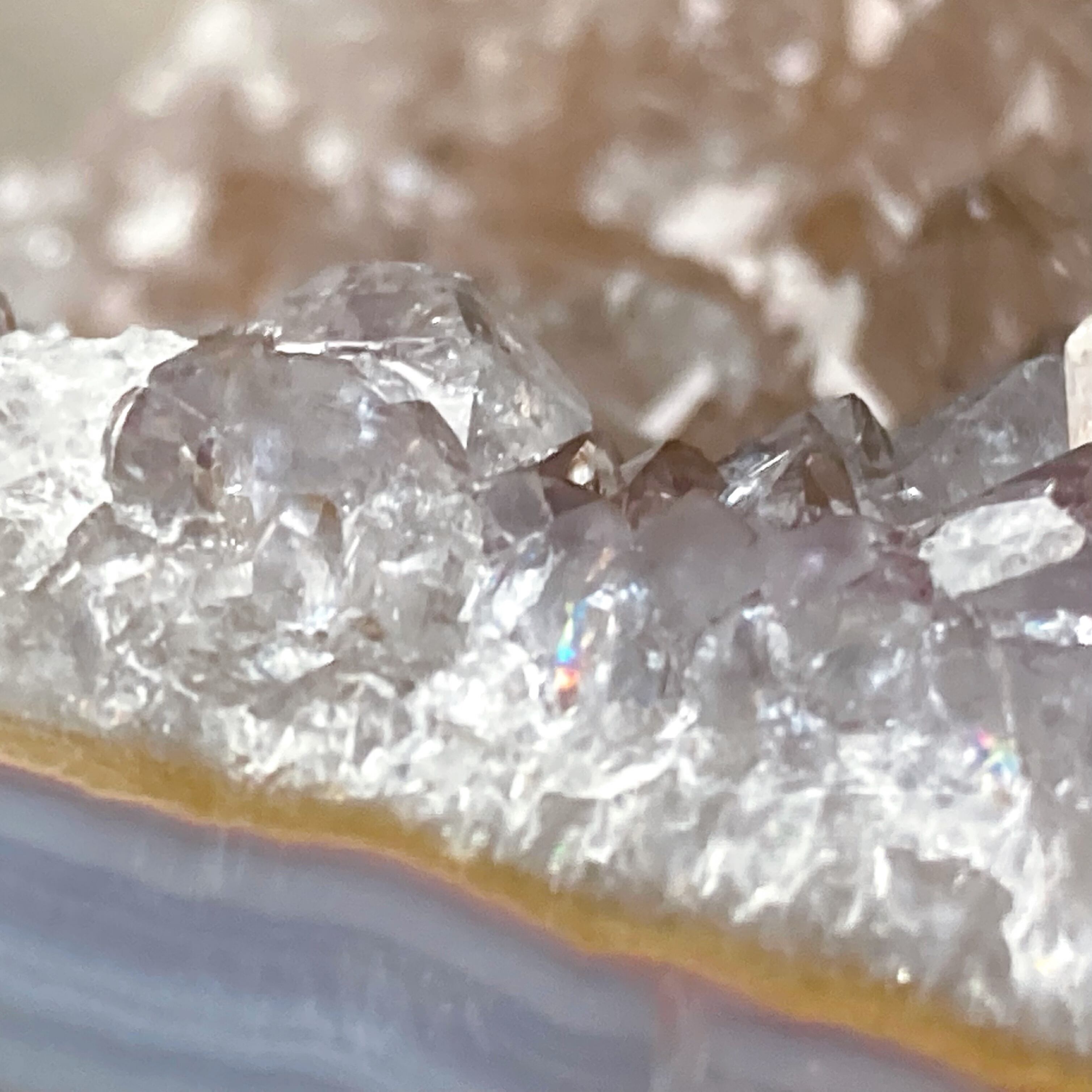 ハート形のアメジスト・アゲートジオードです。ブルーグレーのアゲートと淡いブラウンのアメジストとの色合いが素敵です。クォーツ部分にはレインボーも見られます。