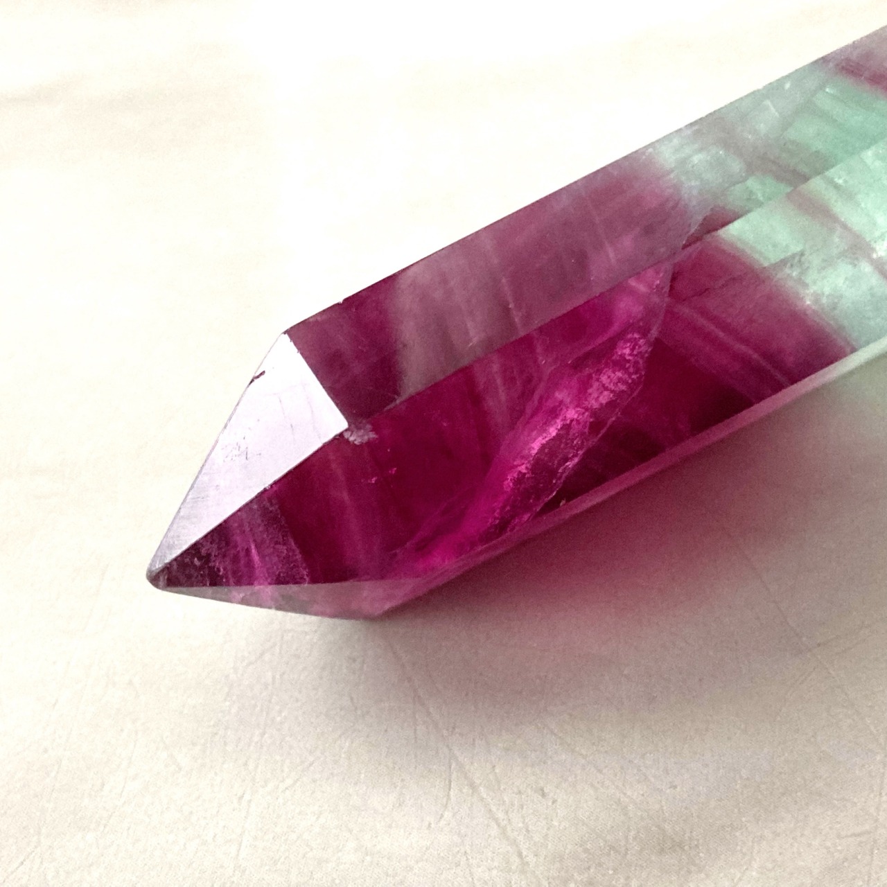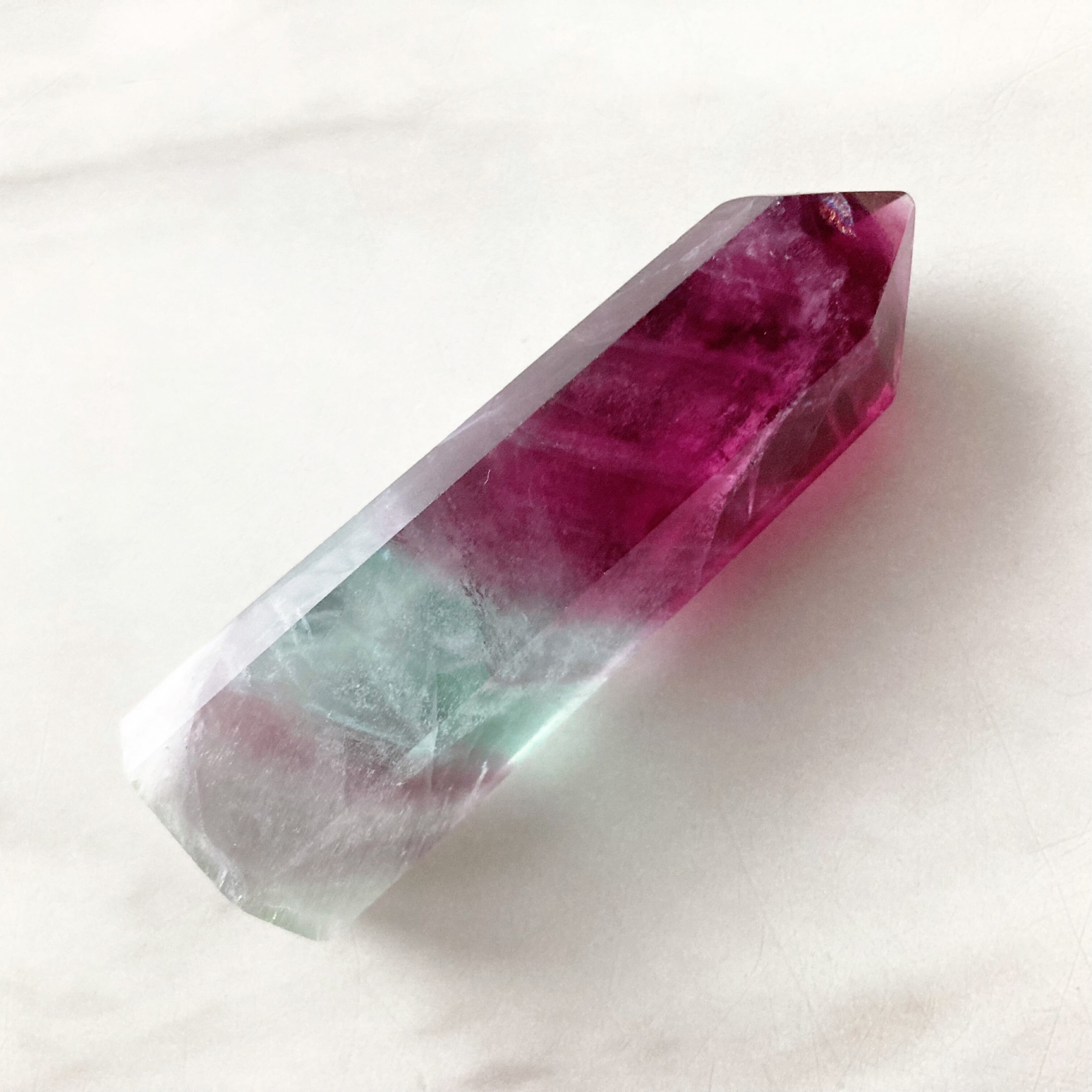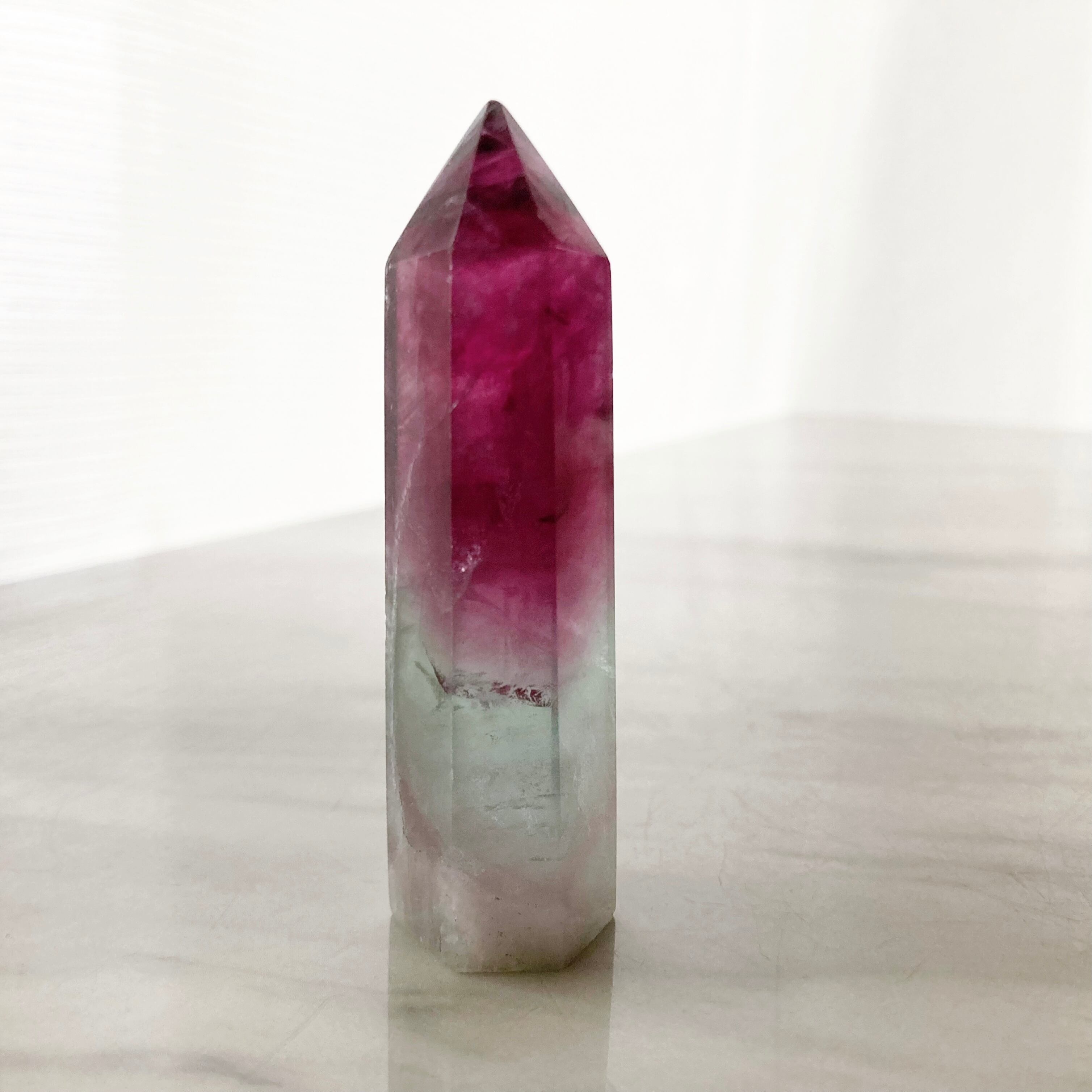 マゼンダパープルとミントグリーンのバイカラーが美しいフローライトポイント。レインボーも綺麗です。ウォーターメロンフローライトと呼ばれています。