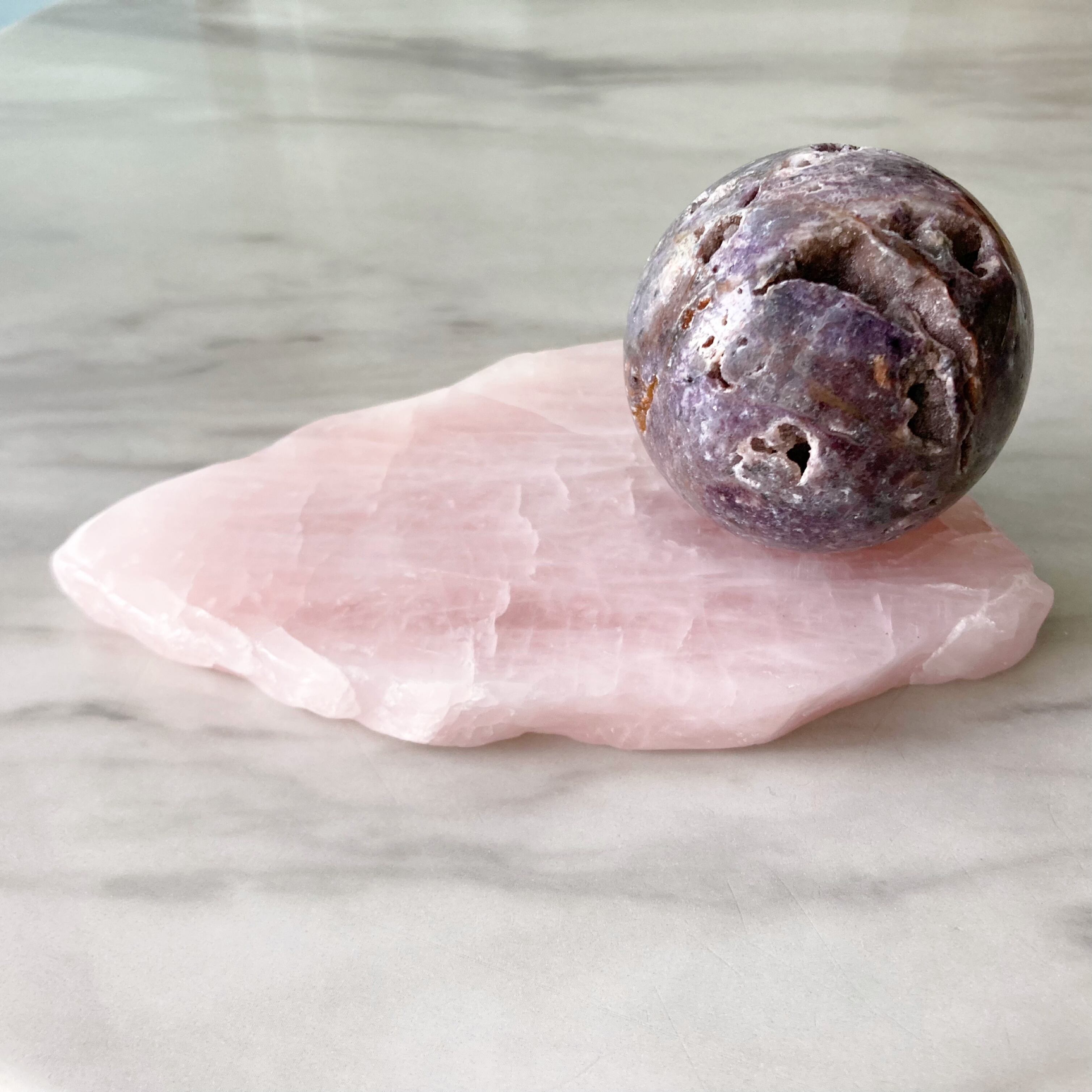 ローズクォーツのスフィアスタンド付きプレートです。片面のみスフィアを置けるくぼみがあります。画像は、直径2.8cmと5.2cmのスフィアを置いています。