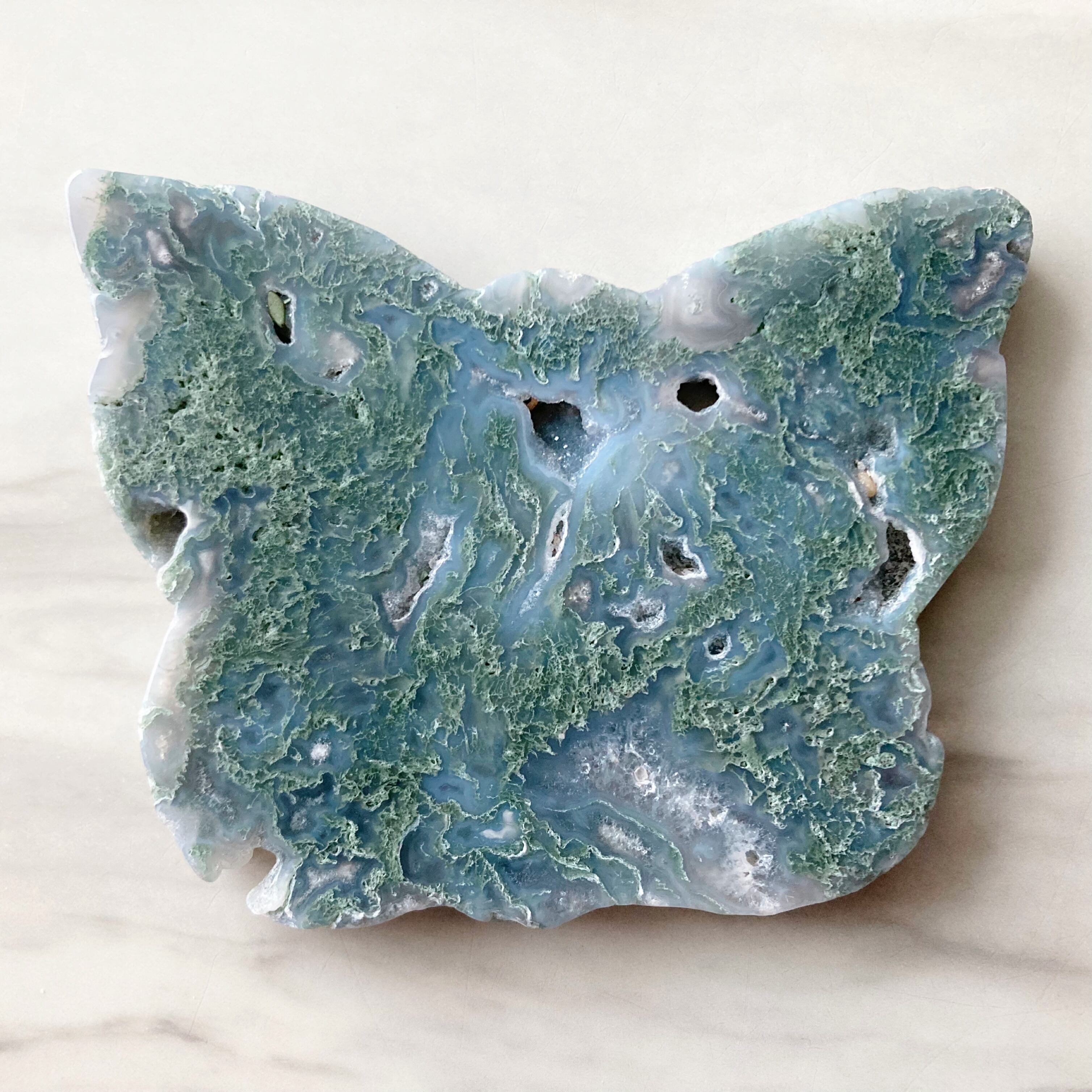 蝶の形が可愛い、モスアゲートのプレートです。アクセサリーや天然石の浄化など、自由な発想でお使いください。水色を混ぜたような明るめのグリーンです。