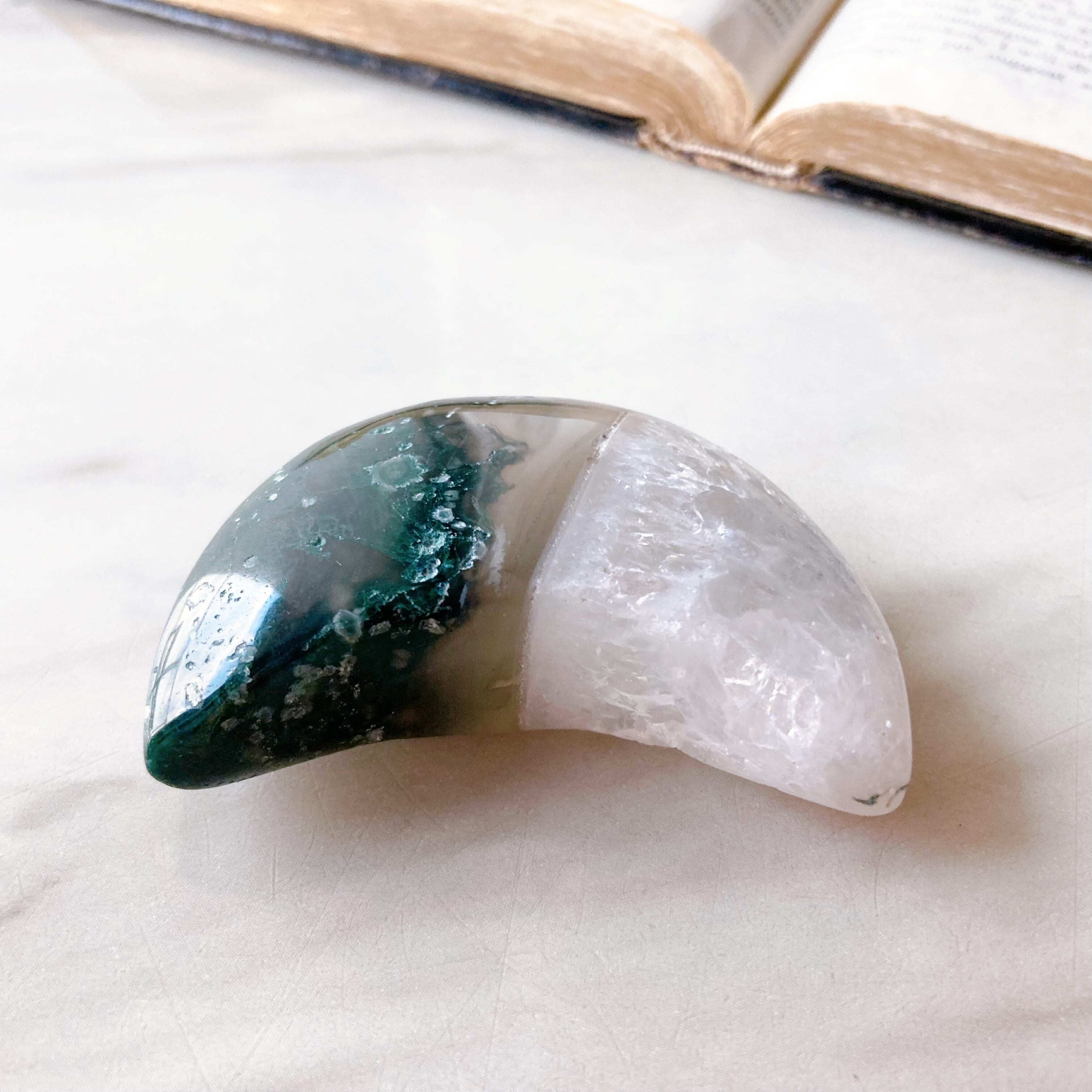 クリアなホワイトと深いグリーンのバイカラーがステキなモスアゲートのムーン型パームストーンです。