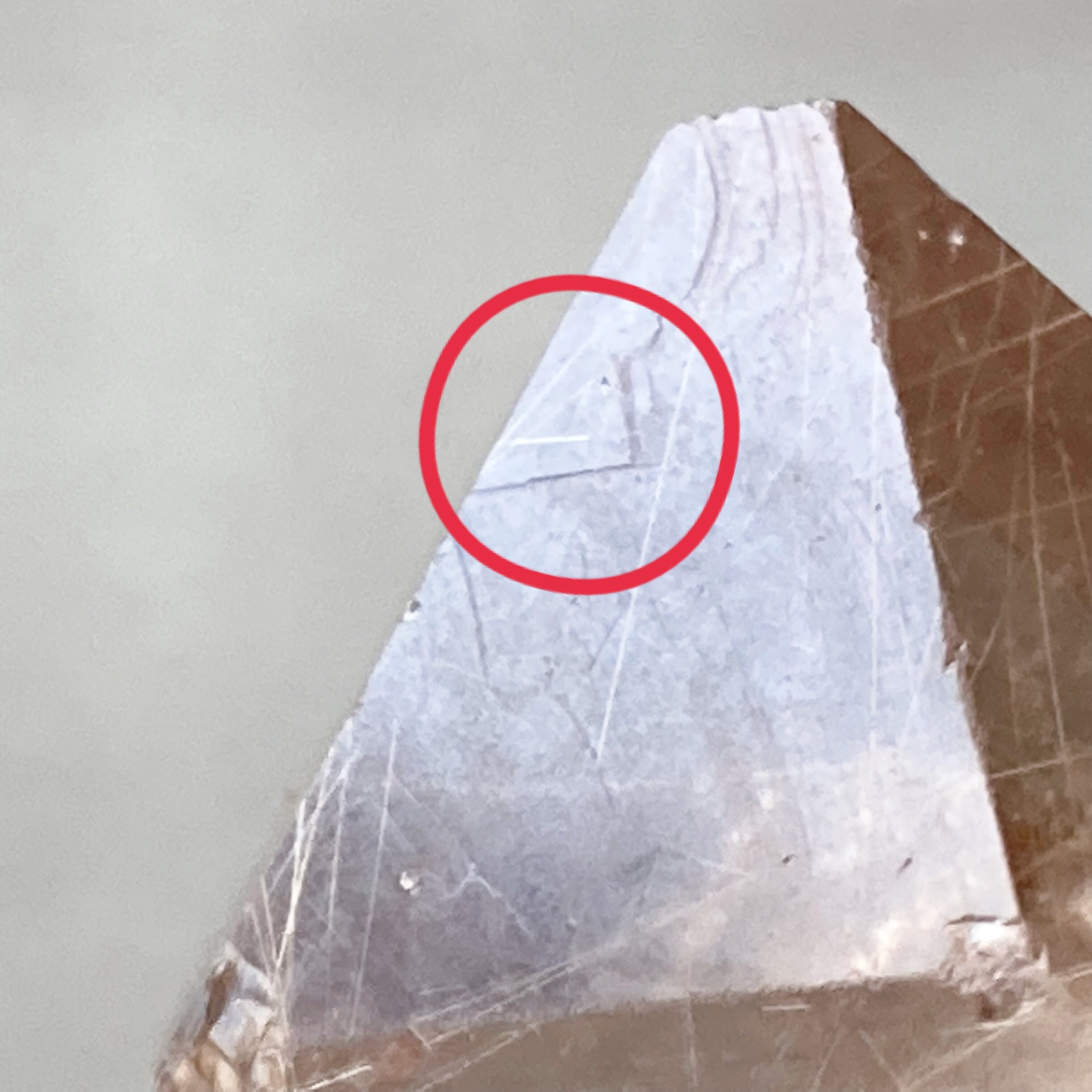 スモーキークォーツの中にゴールデンルチルが入っています。三角形のレコードキーパー、平行四辺形のパストタイムリンク、レインボーがあちこちに見られるマスタークリスタルです。