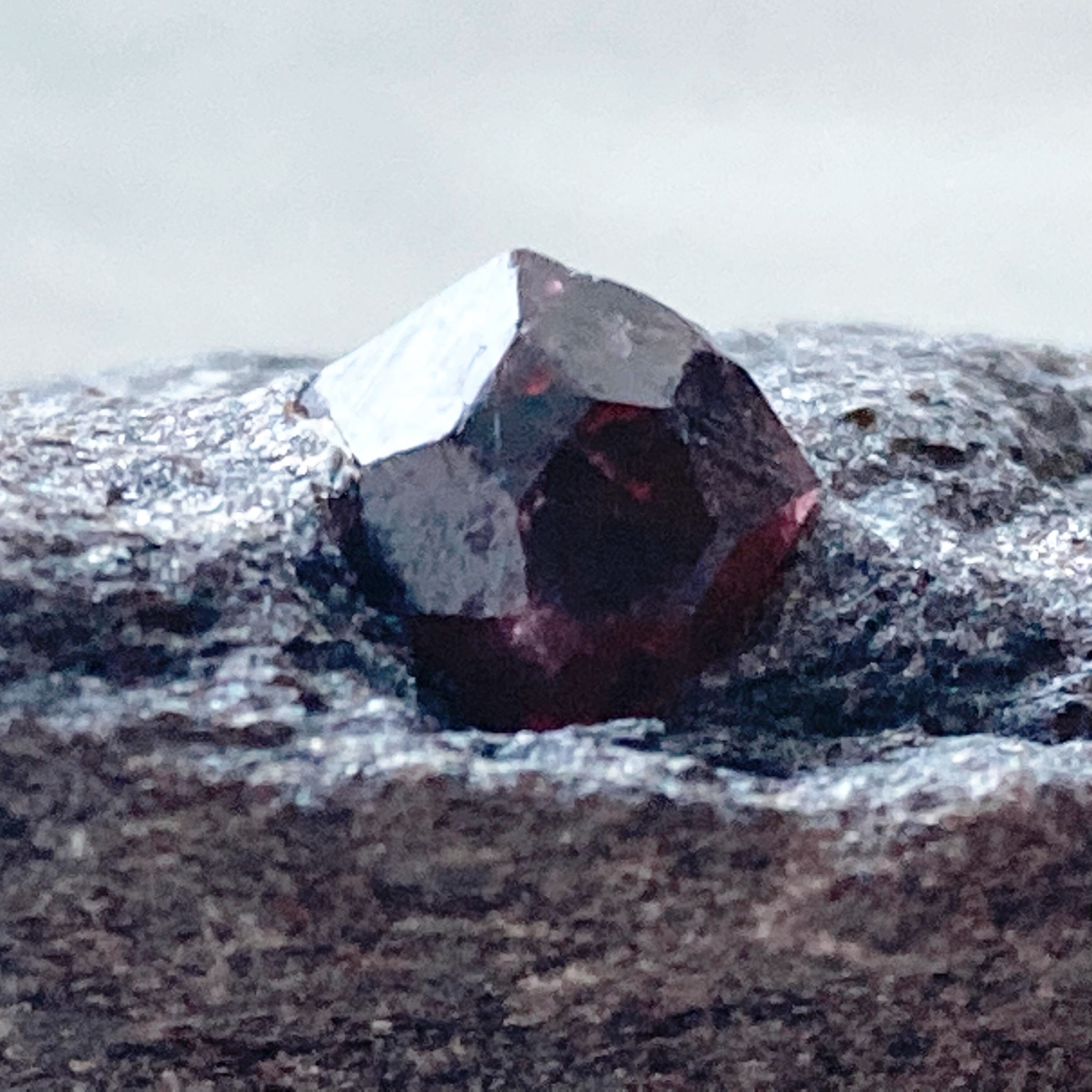 アメリカ マサチューセッツ州 レッドエンバーズ鉱山でしか採掘されない、レアな母岩付きのガーネットです。ライトを当てると、美しいレッドに輝きます。結晶の形もキレイです。