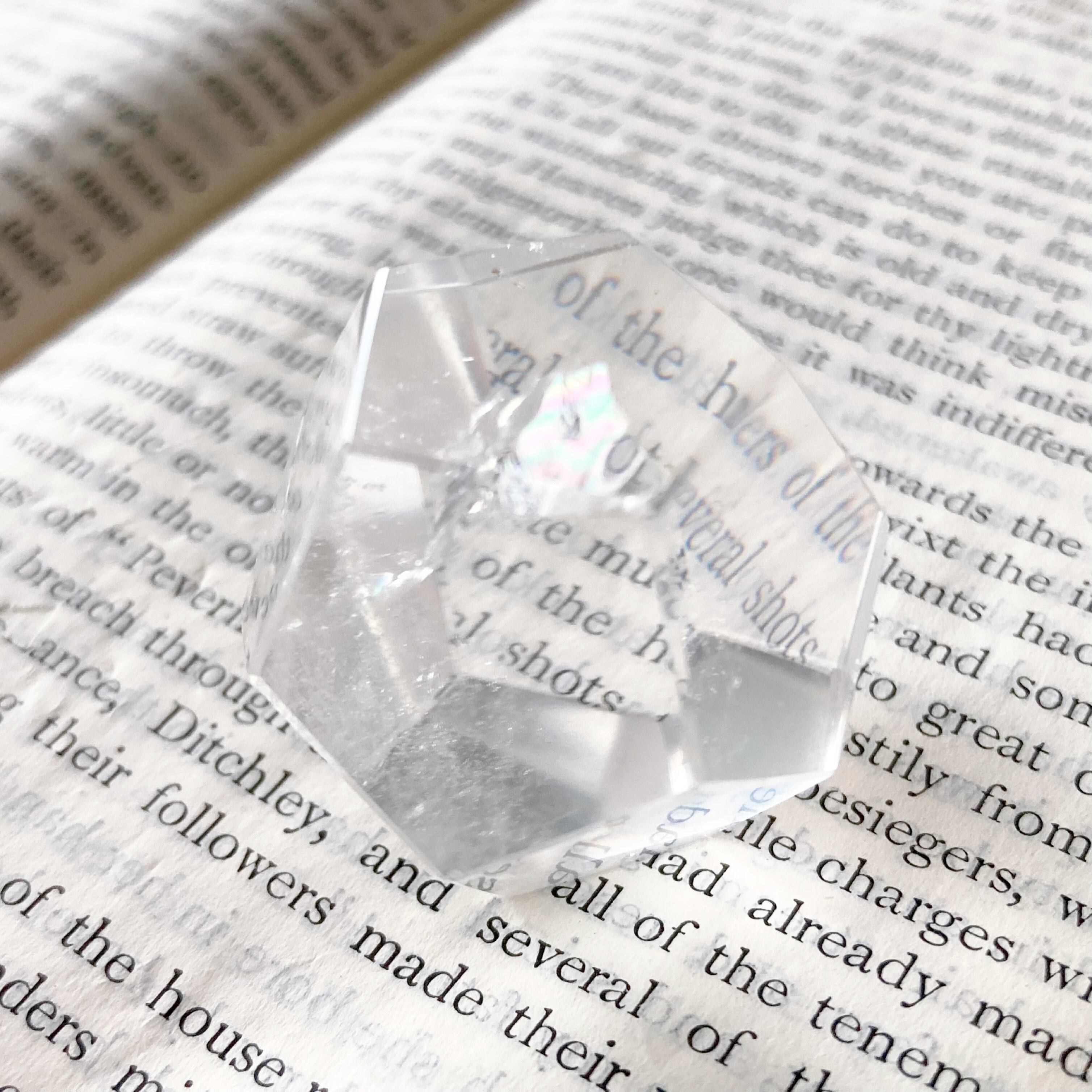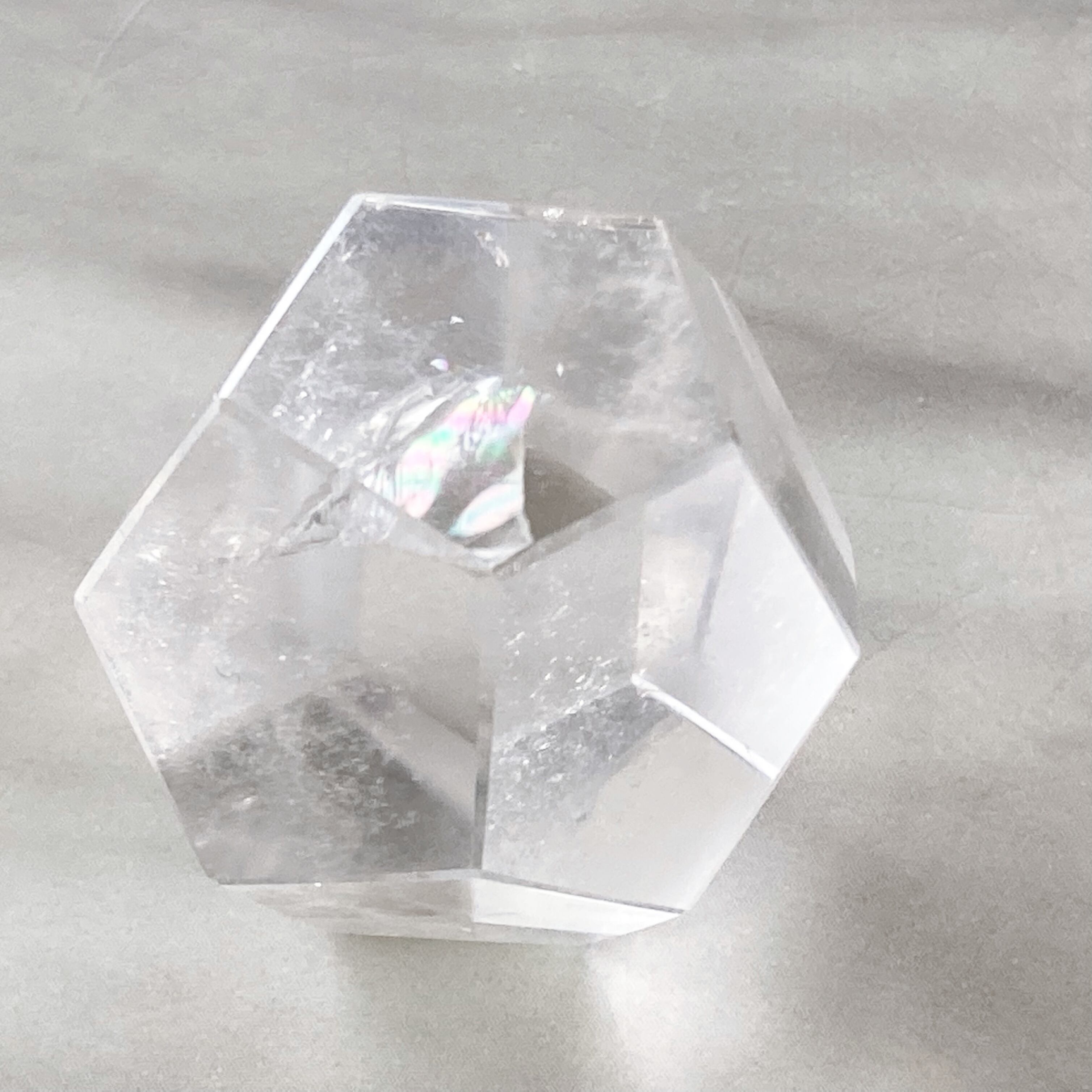 正十二面体のクリアクォーツです。願いごとを叶える力が強いと言われるレインボーが見られます。