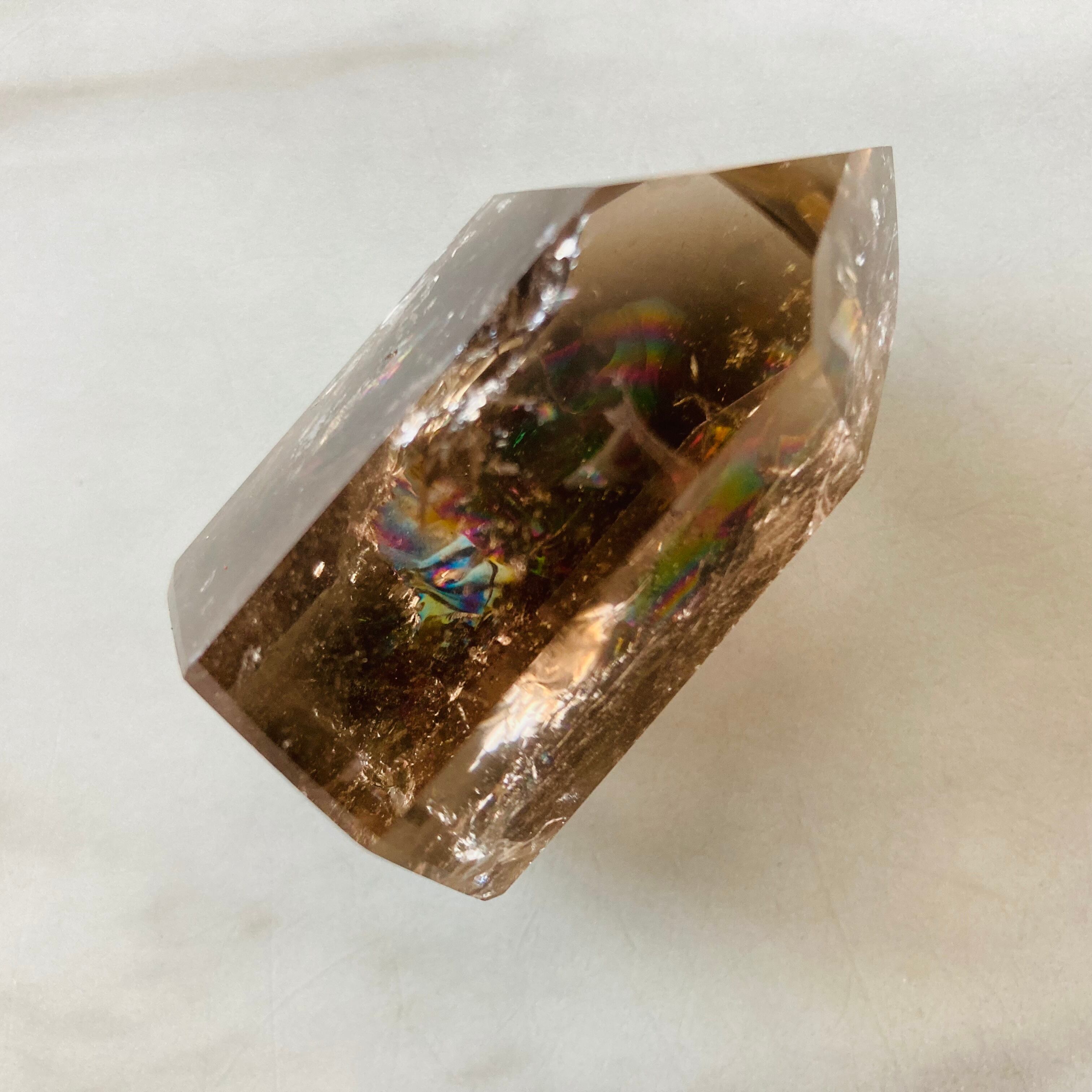レインボーが美しいスモーキーアイリスクォーツのタワーです。