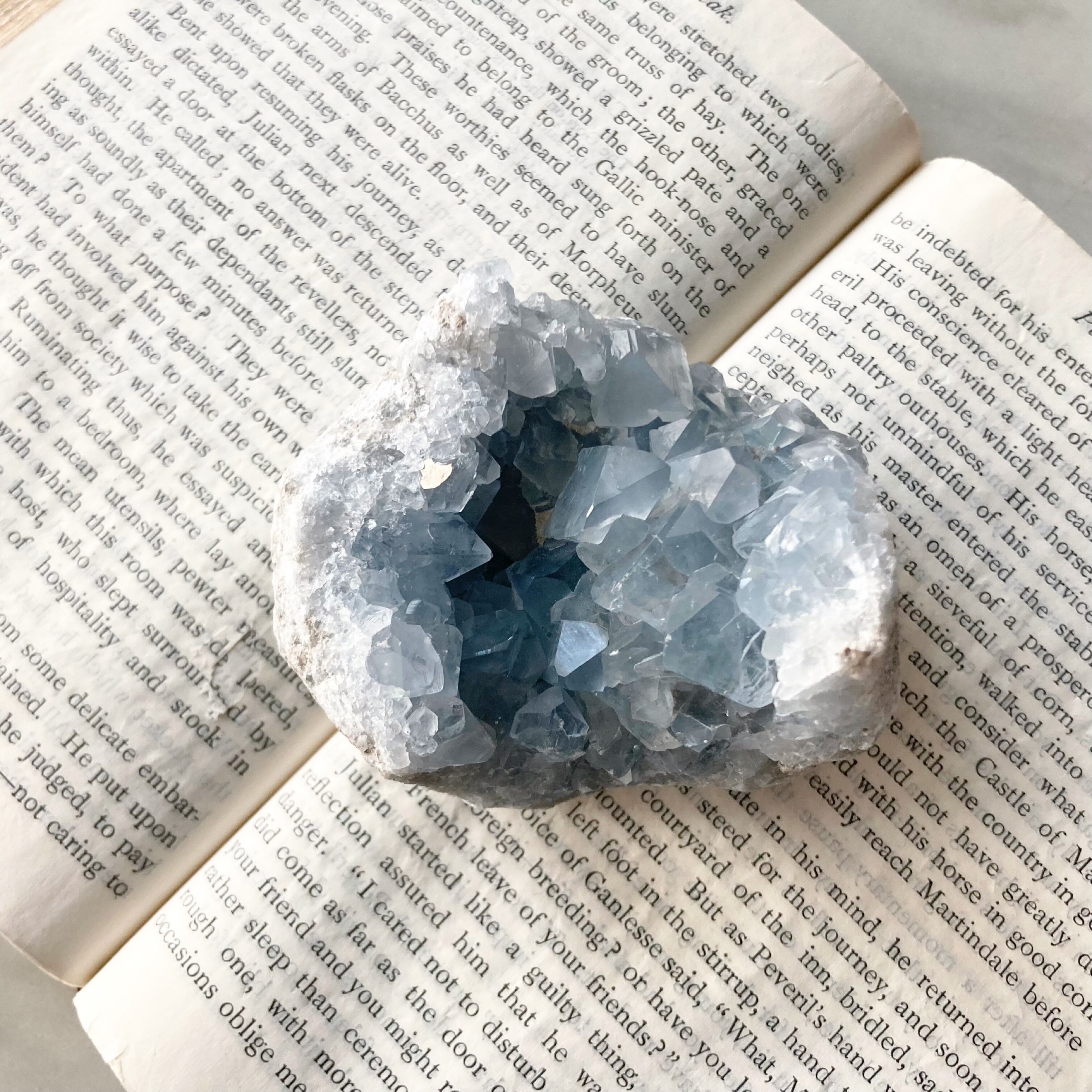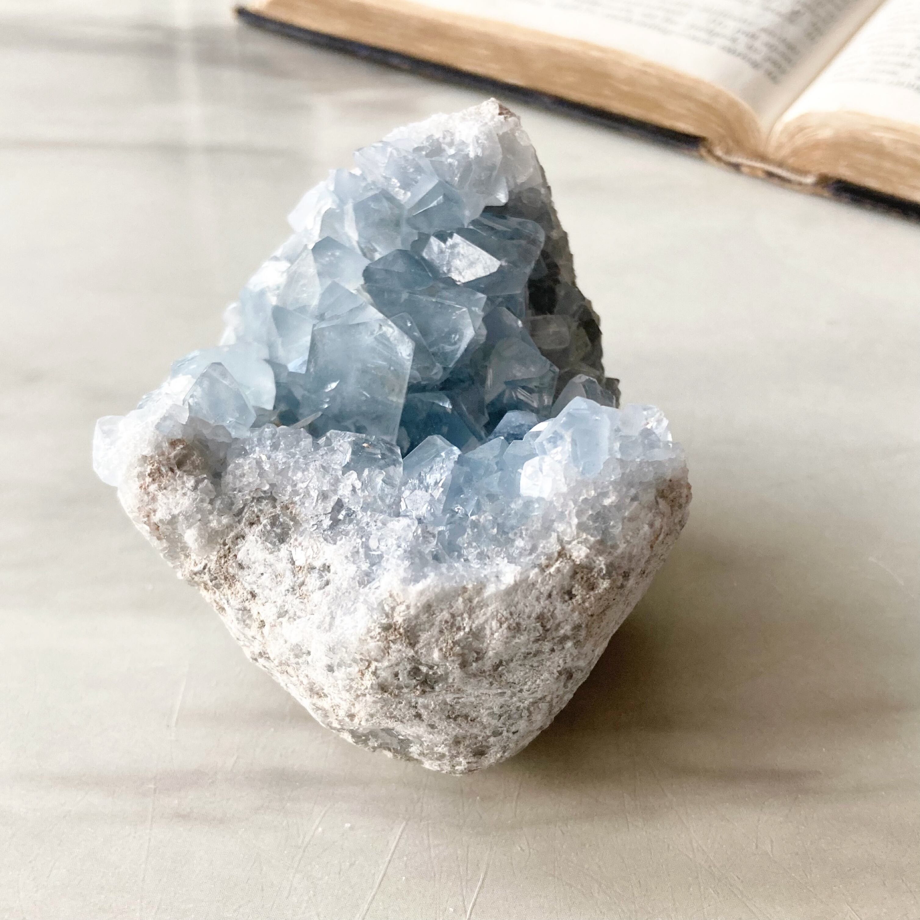 天青石という、青く晴れた空を連想させる和名を持つ、美しいスカイブルーのセレスタイト。ラテン語で「天国のような」という意味も持っています。