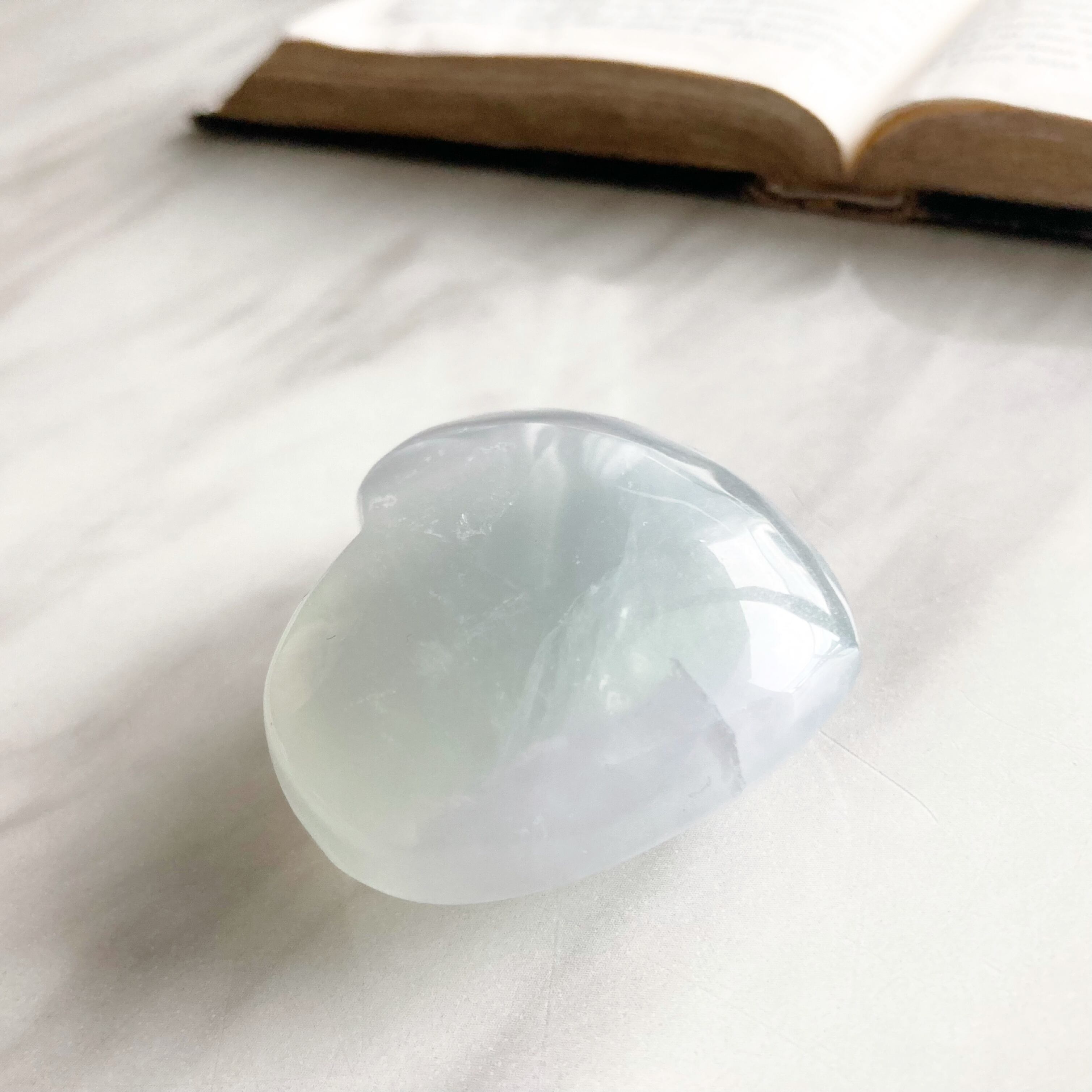 淡いグリーンに、ほんのりパープルのラインが入ったフローライトのハート型パームストーンです。