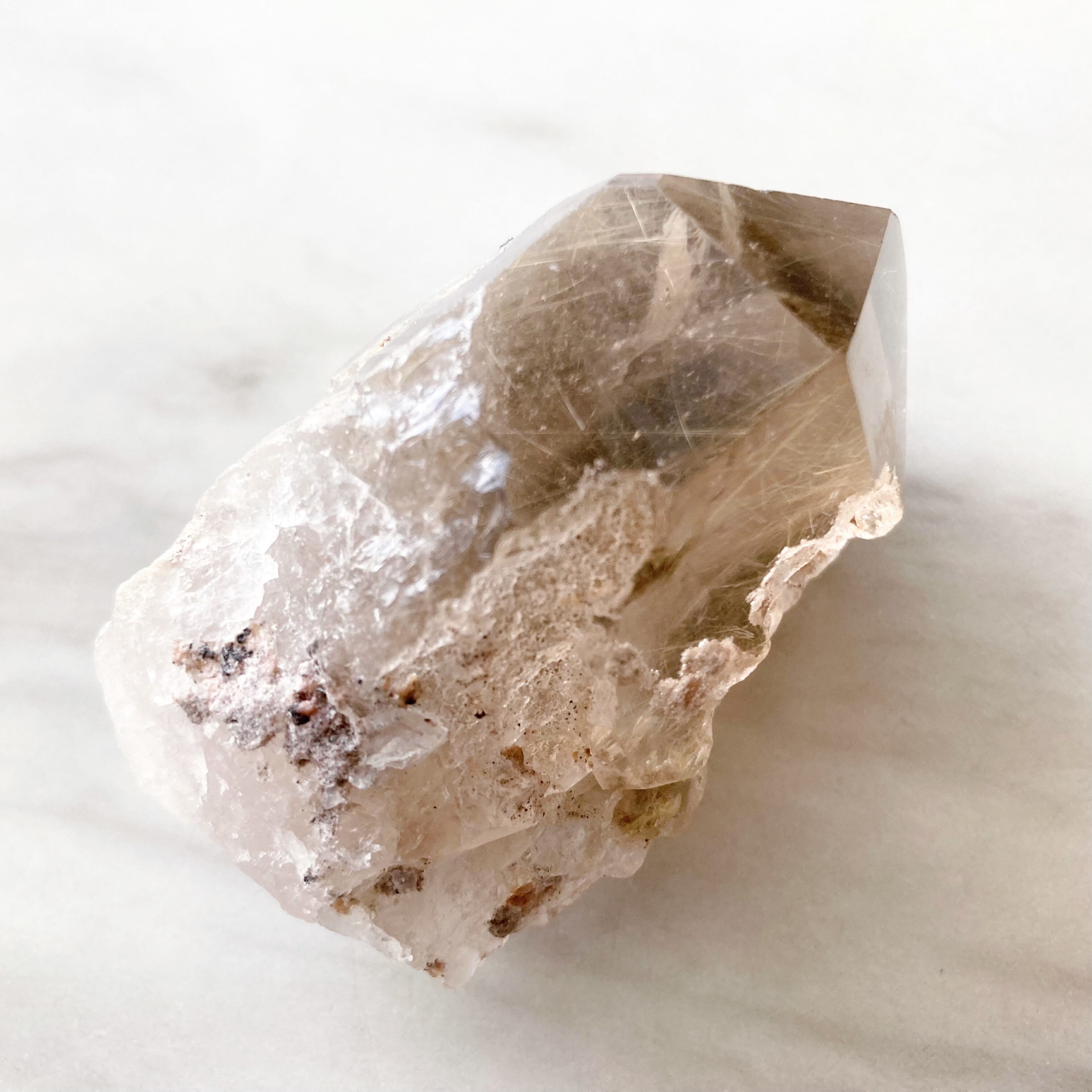 スモーキークォーツの中にゴールデンルチルが入っています。未来からのメッセージを受け取れると言われるフューチャータイムリンクと願いを叶える力が強いとされるレインボーが見られる、マスタークリスタルです。