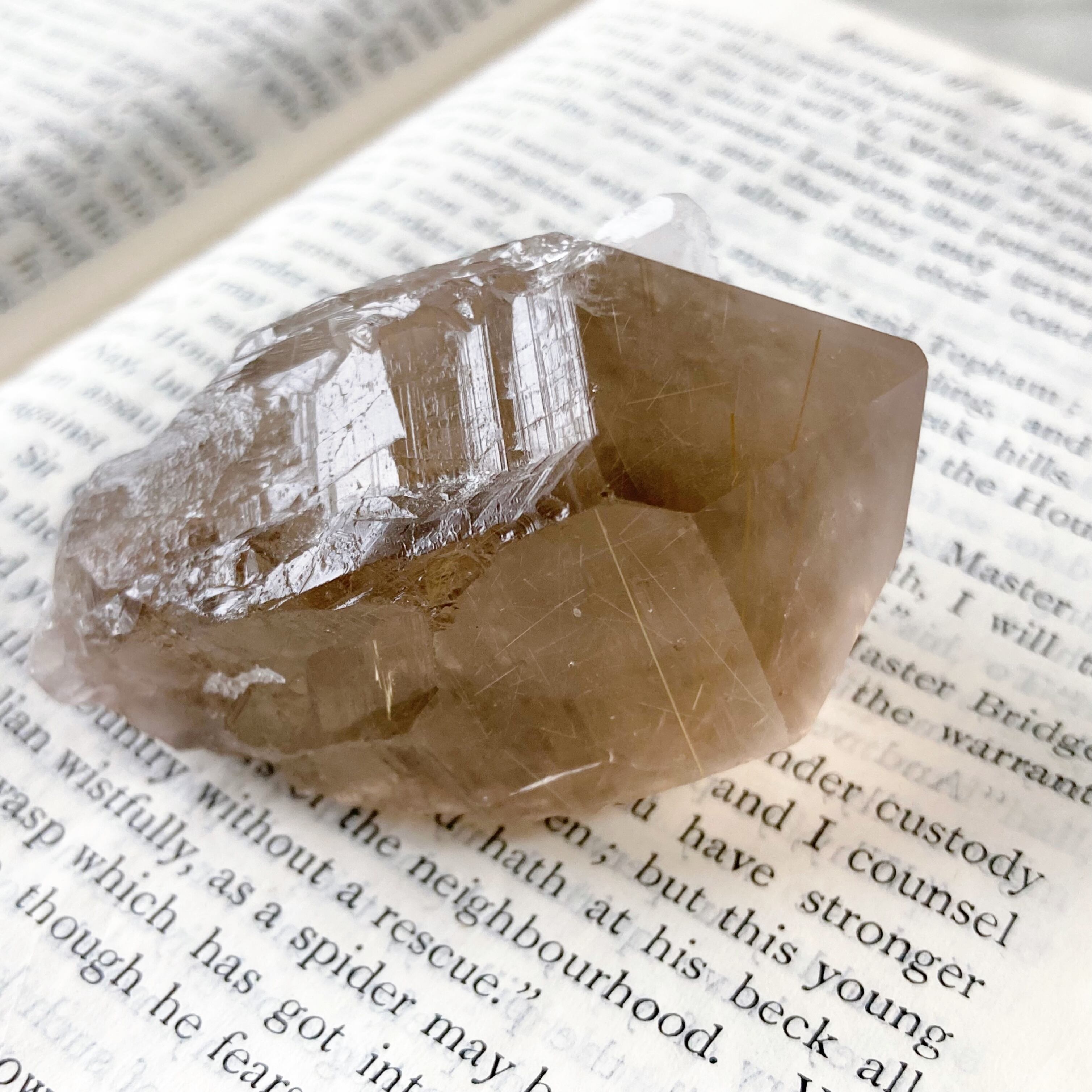 スモーキークォーツの中に太くて長いゴールデンルチルが入っています。願いを叶える力が強いとされるレインボーがあちこちに見られます。