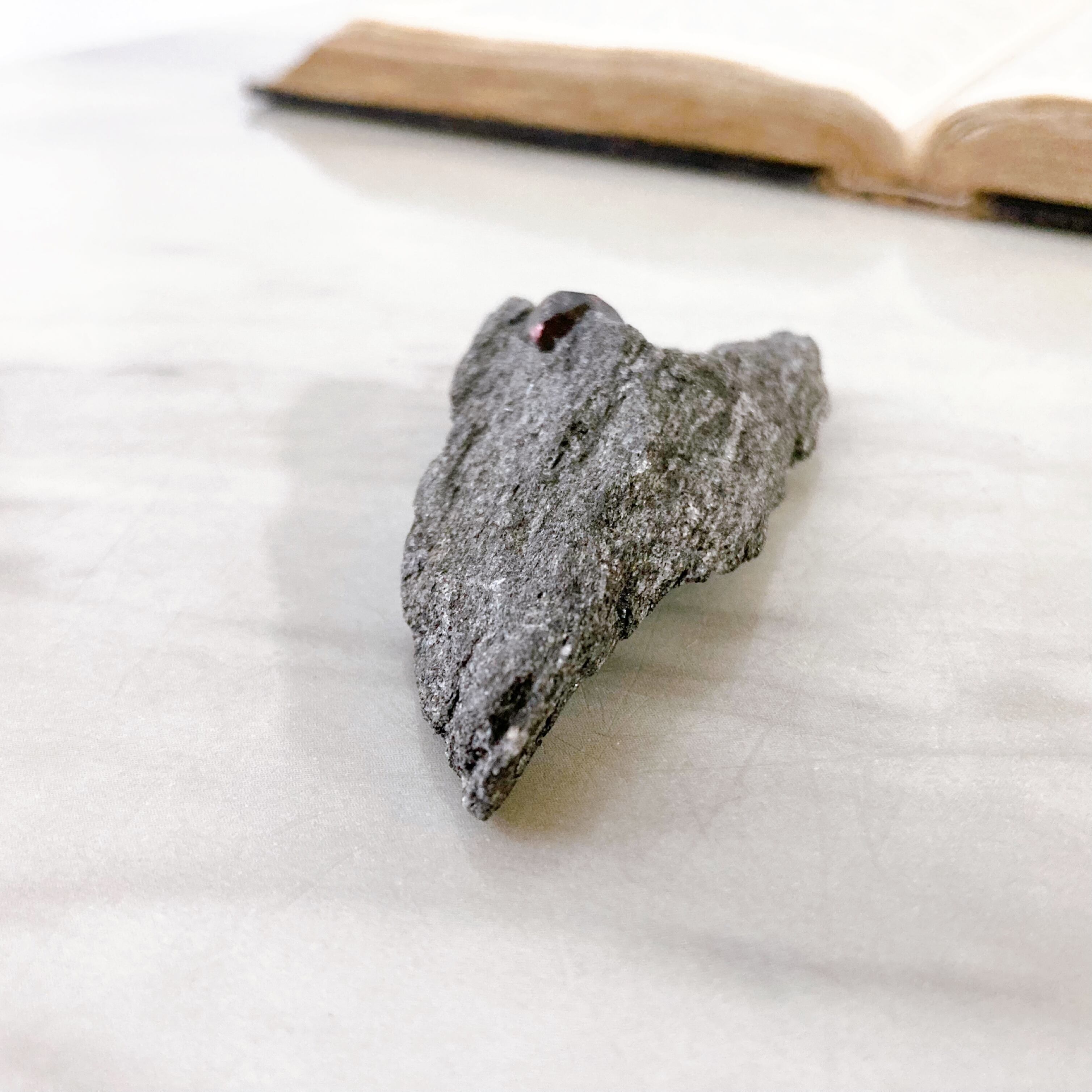 アメリカ マサチューセッツ州 レッドエンバーズ鉱山でしか採掘されない、レアな母岩付きのガーネットです。ライトを当てると、美しいレッドに輝きます。結晶の形もキレイです。