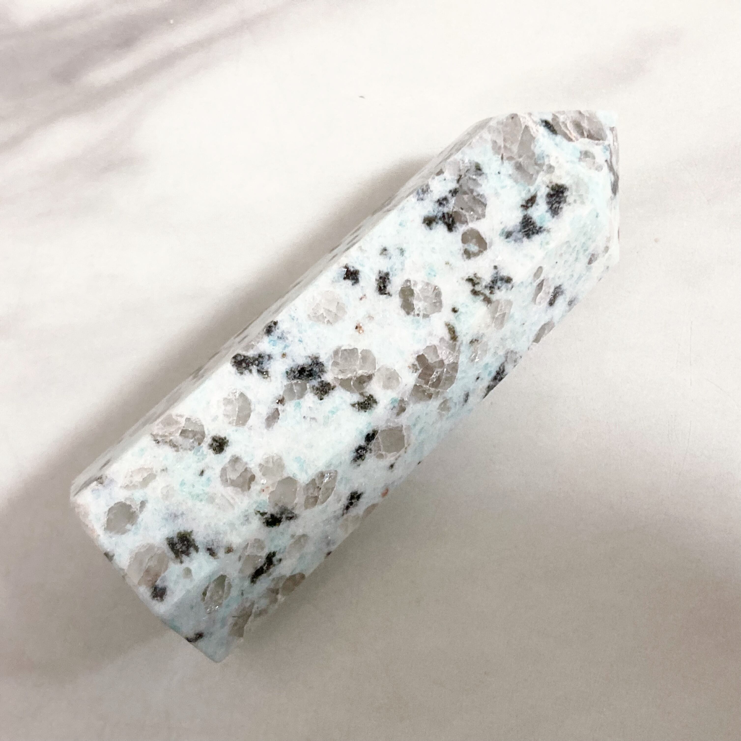 キウイクォーツは石英と長石を主とした花崗岩の一種で、淡いグリーン色の中に黒い斑点模様の、まるでキウイフルーツのような特徴的な見た目です。クォーツがラメのようにキラキラ輝きとてもキレイです。