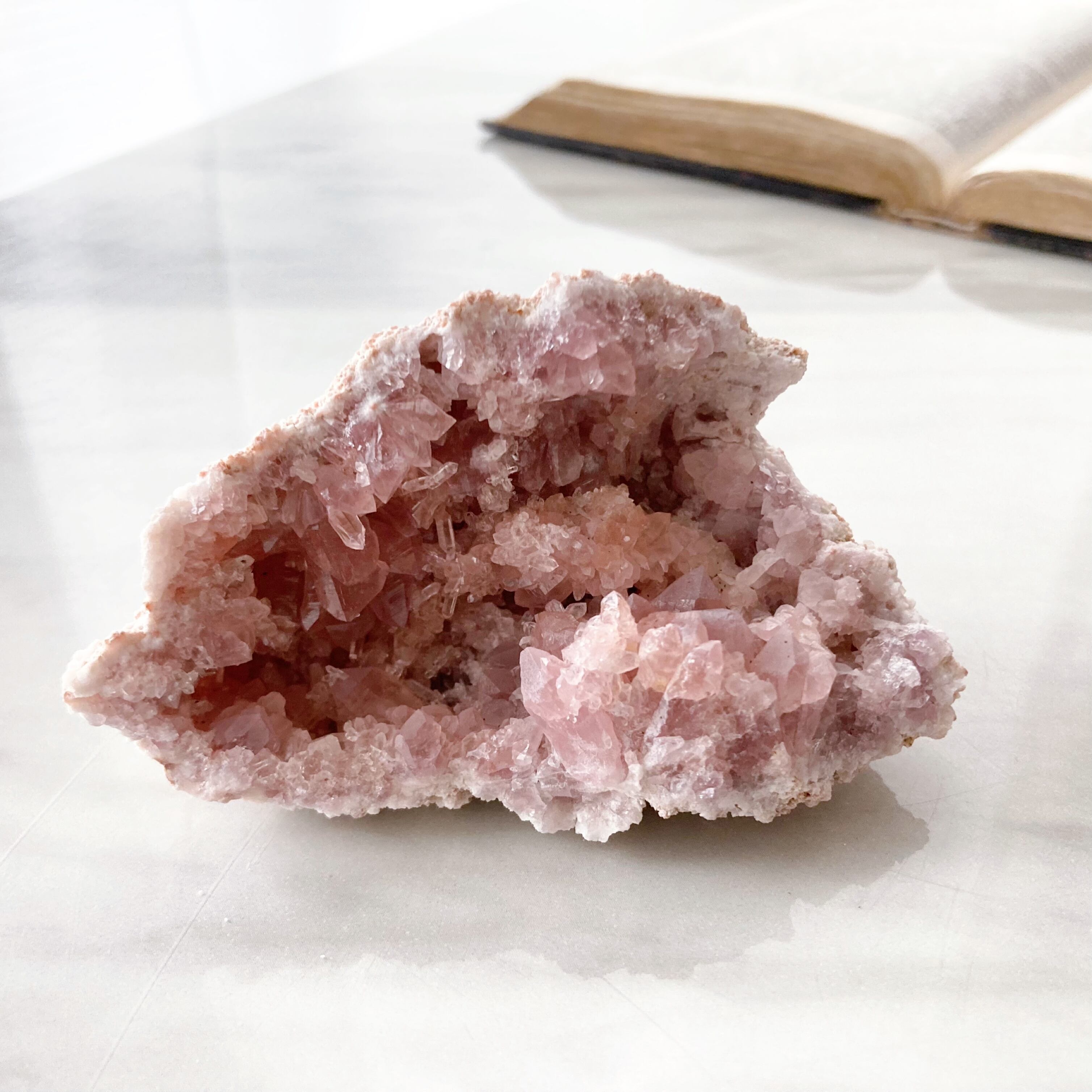 コーラルピンクの結晶がキラキラ輝くピンクアメジストジオード。山のような形も可愛いです。