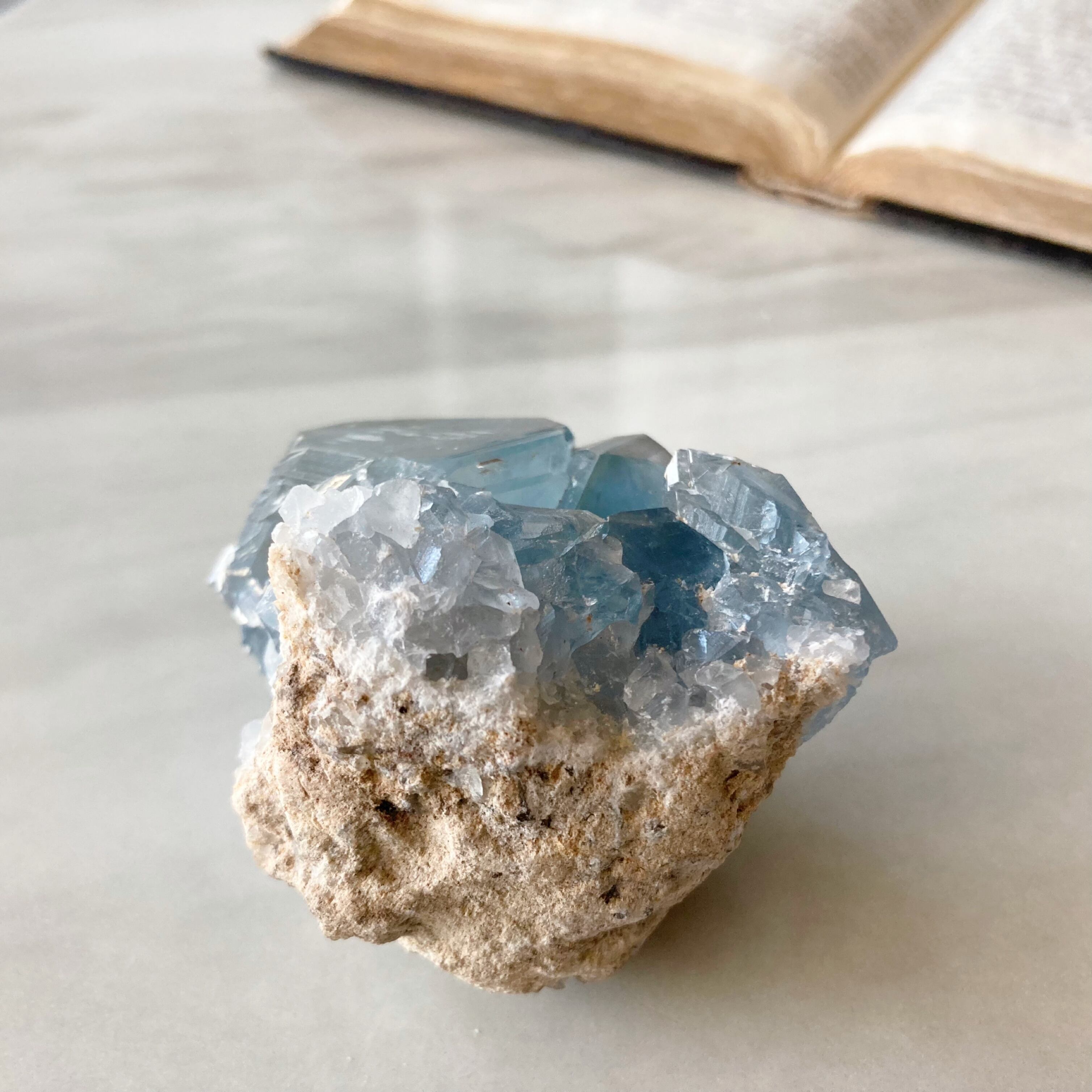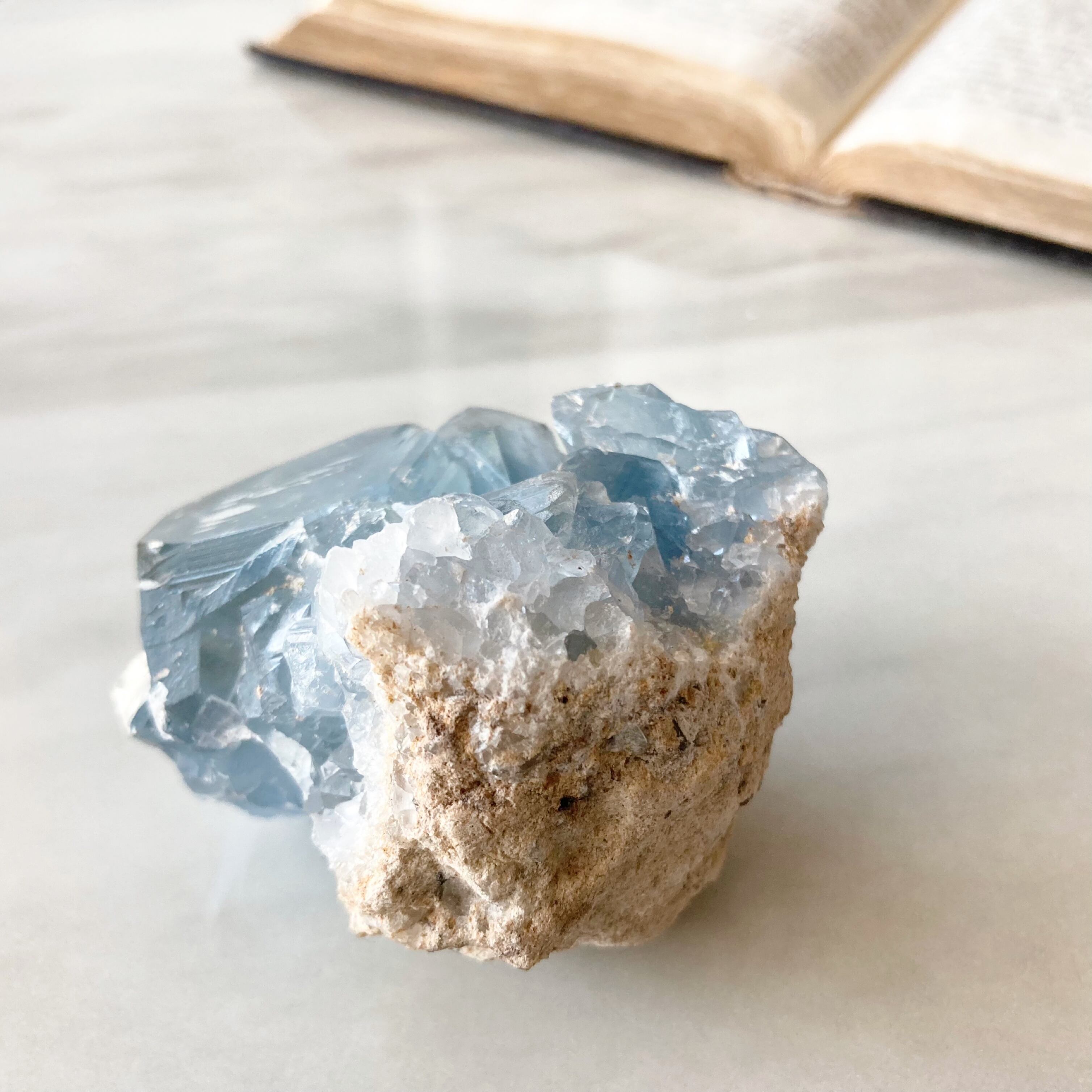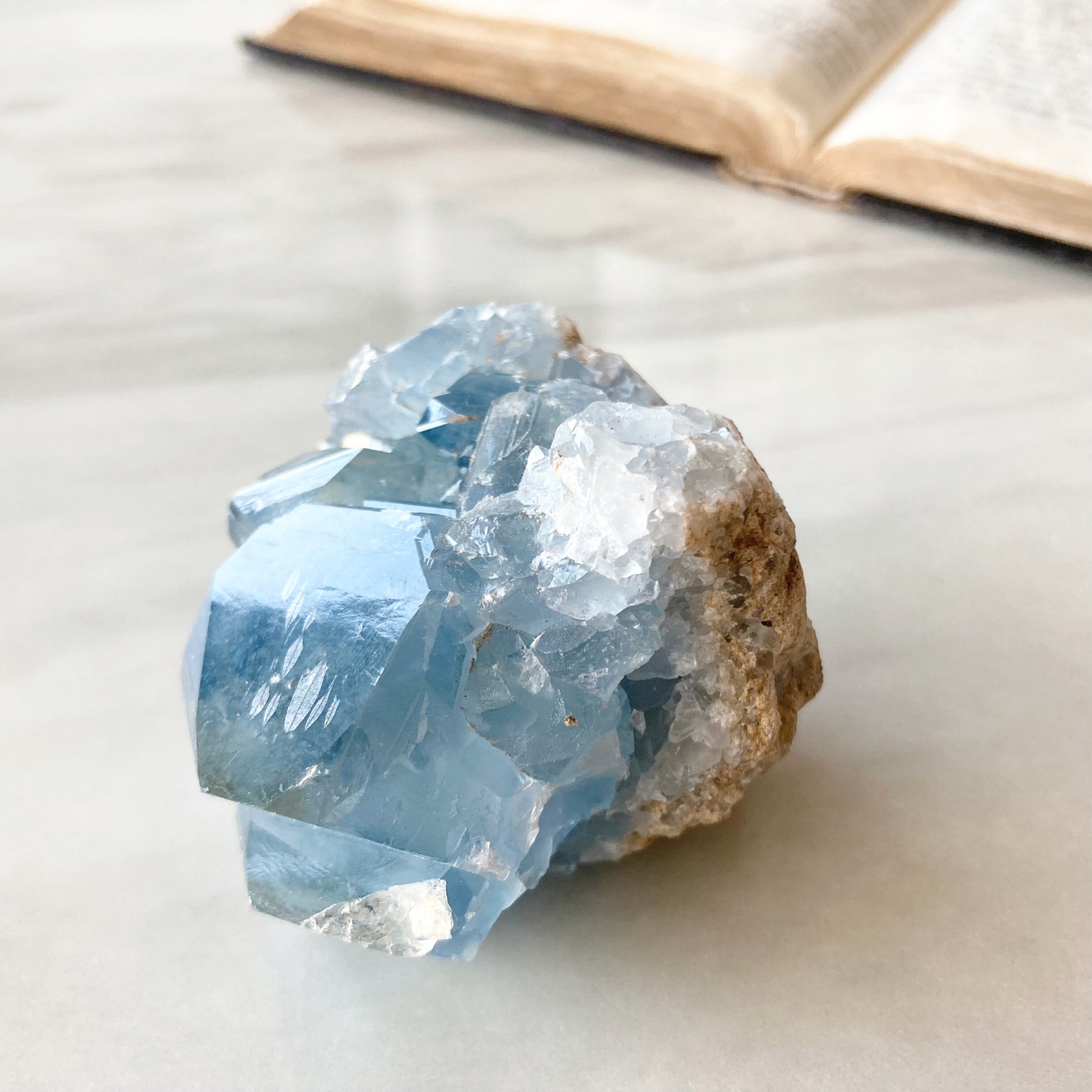 天青石という、青く晴れた空を連想させる和名を持つ、美しいスカイブルーのセレスタイト。ラテン語で「天国のような」という意味も持っています。