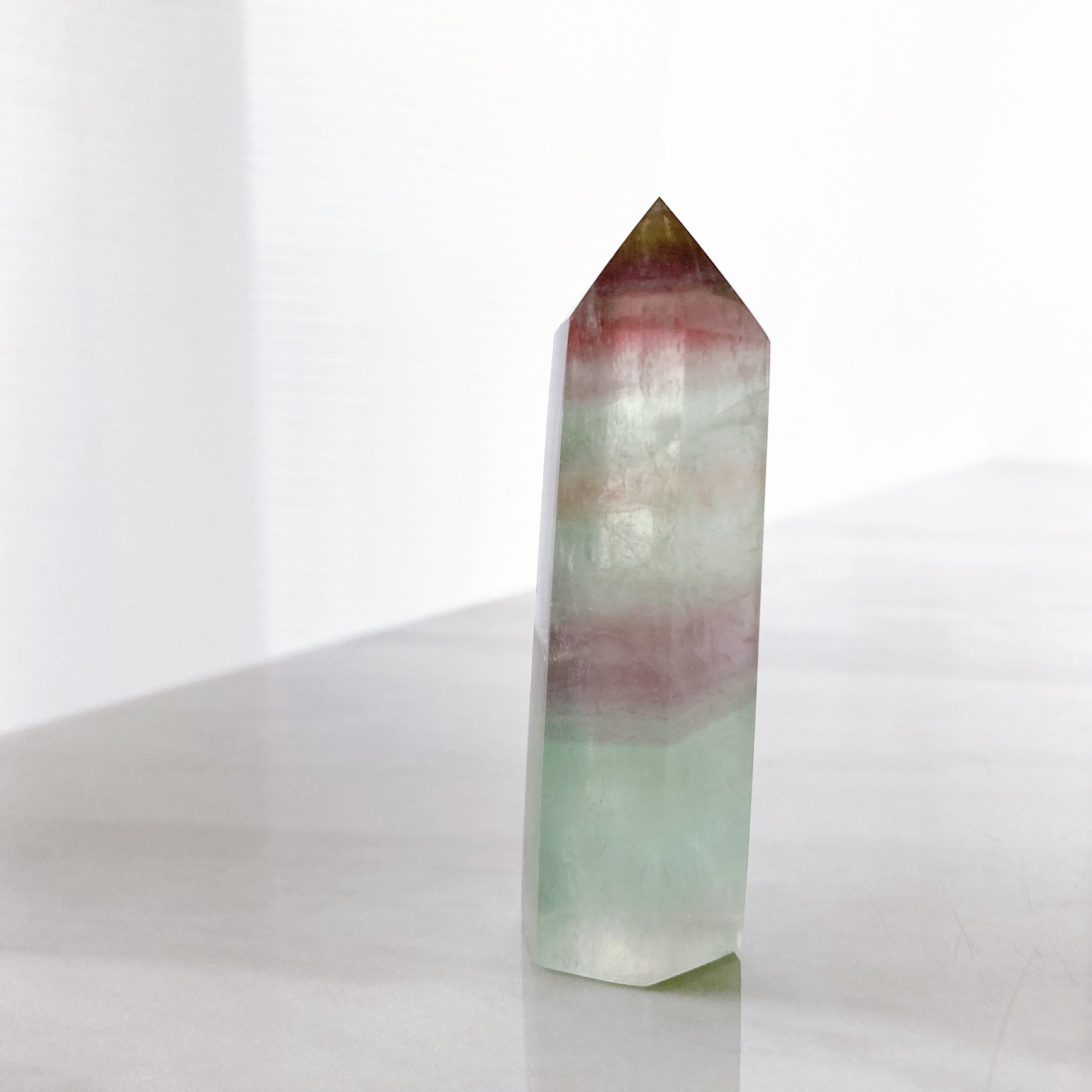 ミントグリーンとパープルの縞模様が素敵なフローライトタワーです。トップがややイエローがかっています。透明感がありとてもキレイです。