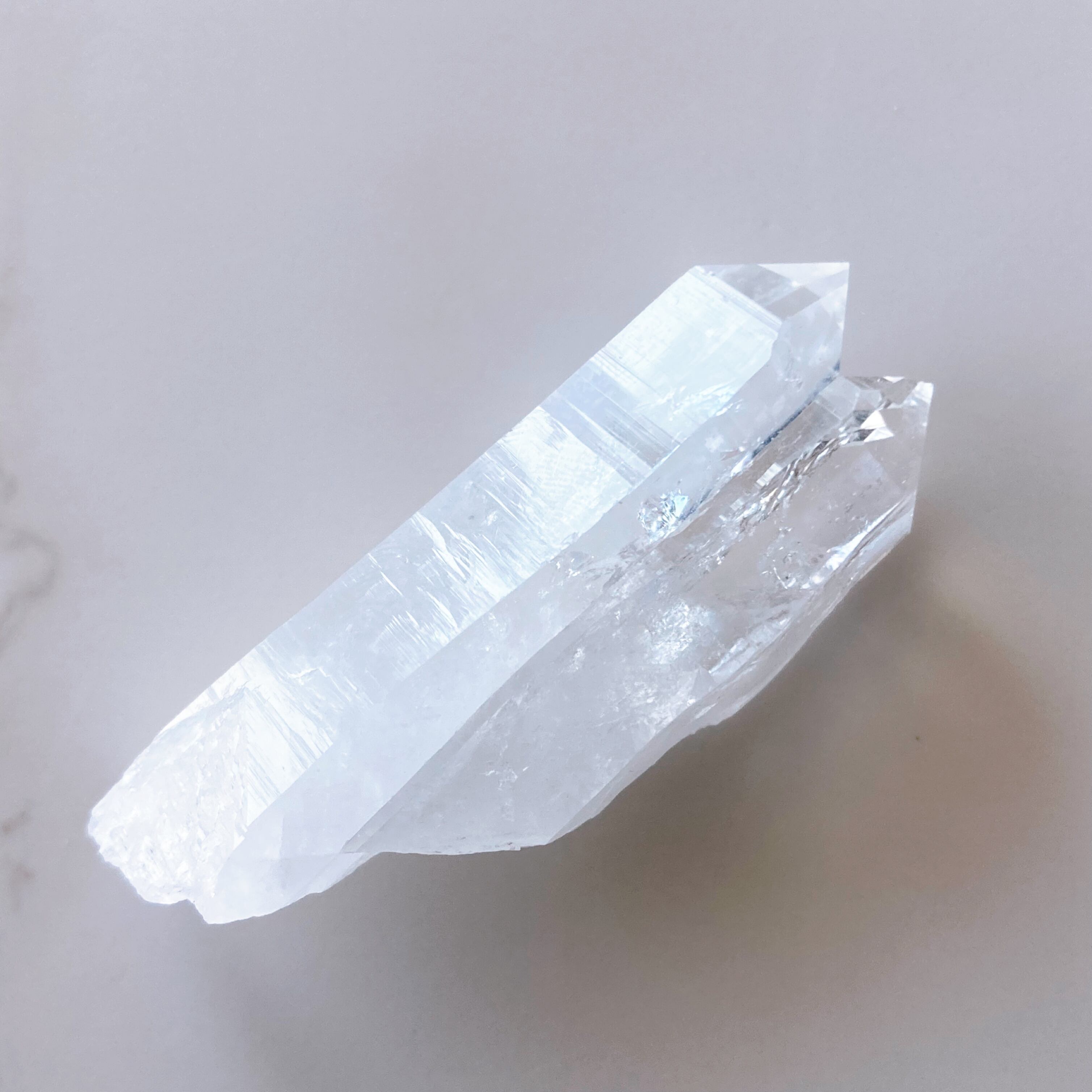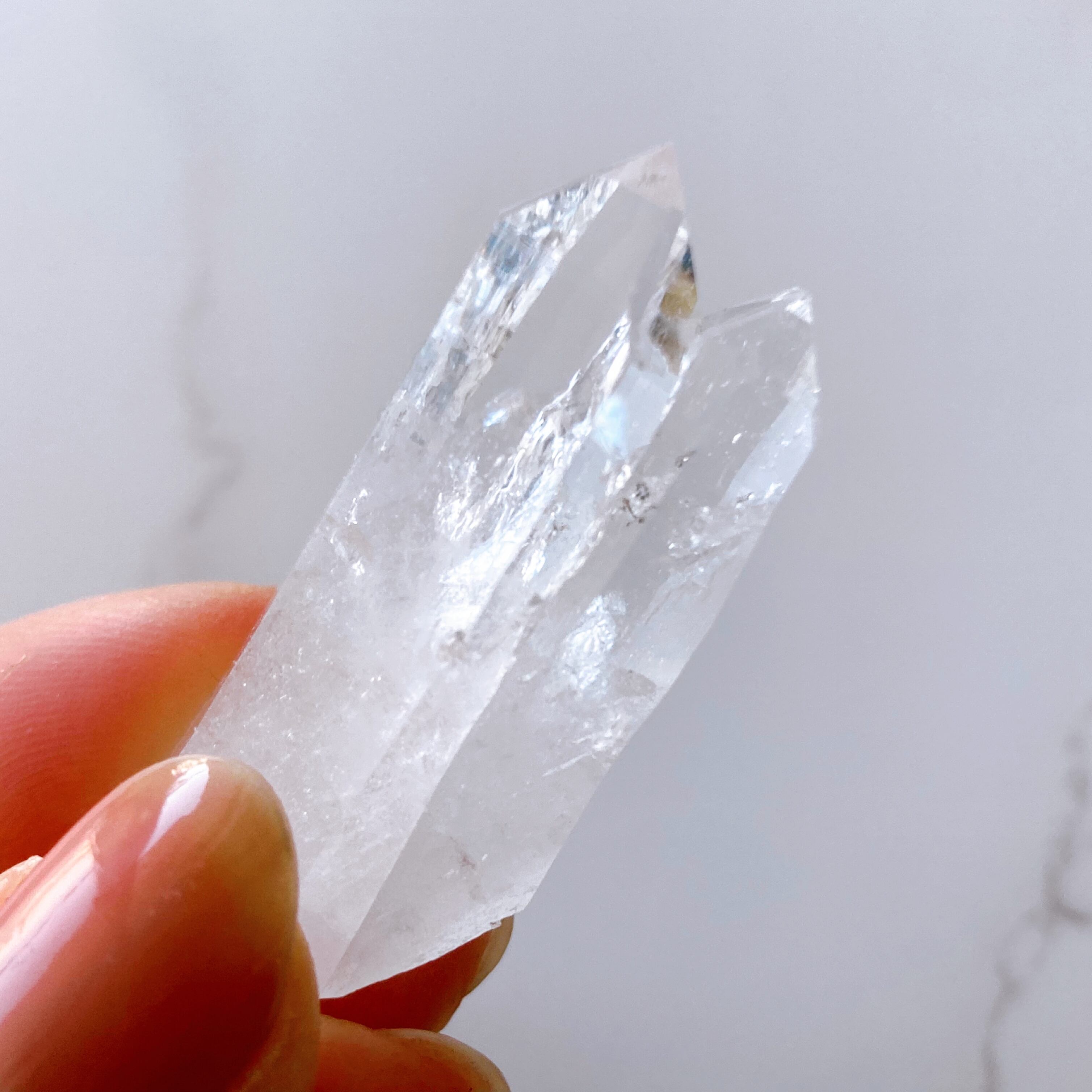 1つの結晶の根元から2つのポイントが平行に密接して形成された「ツインソウル」と呼ばれる形状で、「タントリックツイン」「ソウルメイト」とも呼ばれます。