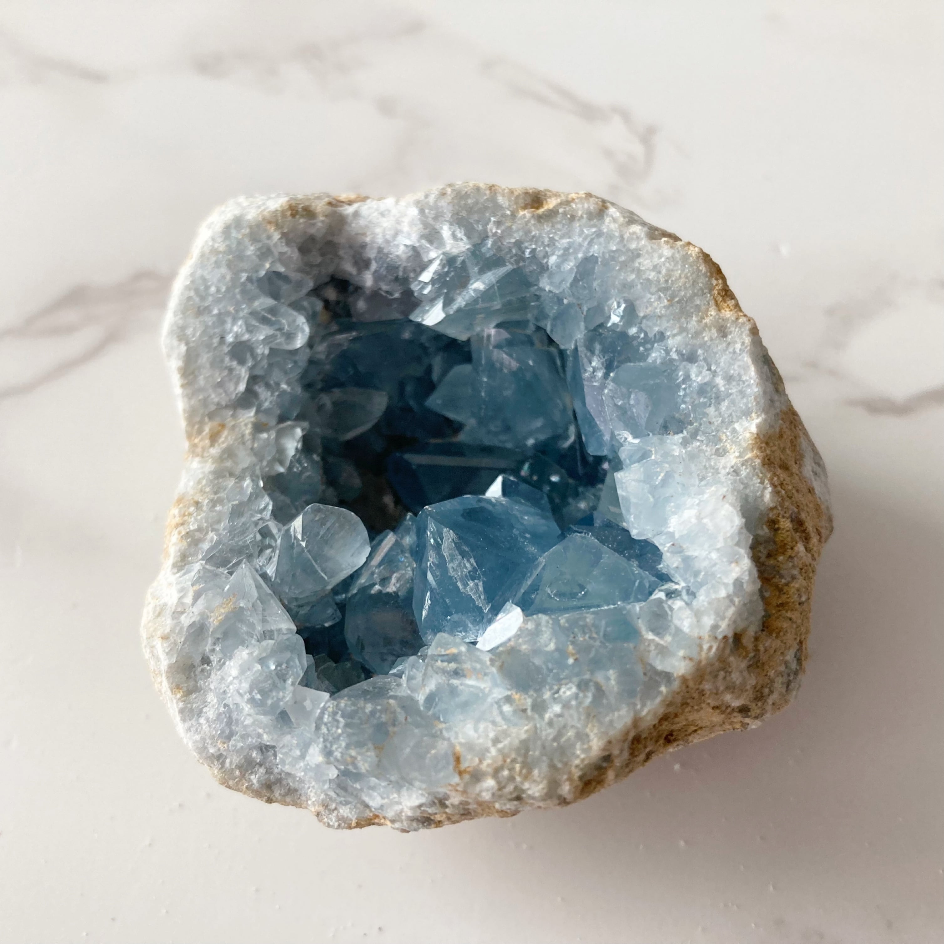 天青石という、青く晴れた空を連想させる和名を持つ、美しいスカイブルーのセレスタイト。ラテン語で「天国のような」という意味も持っています。