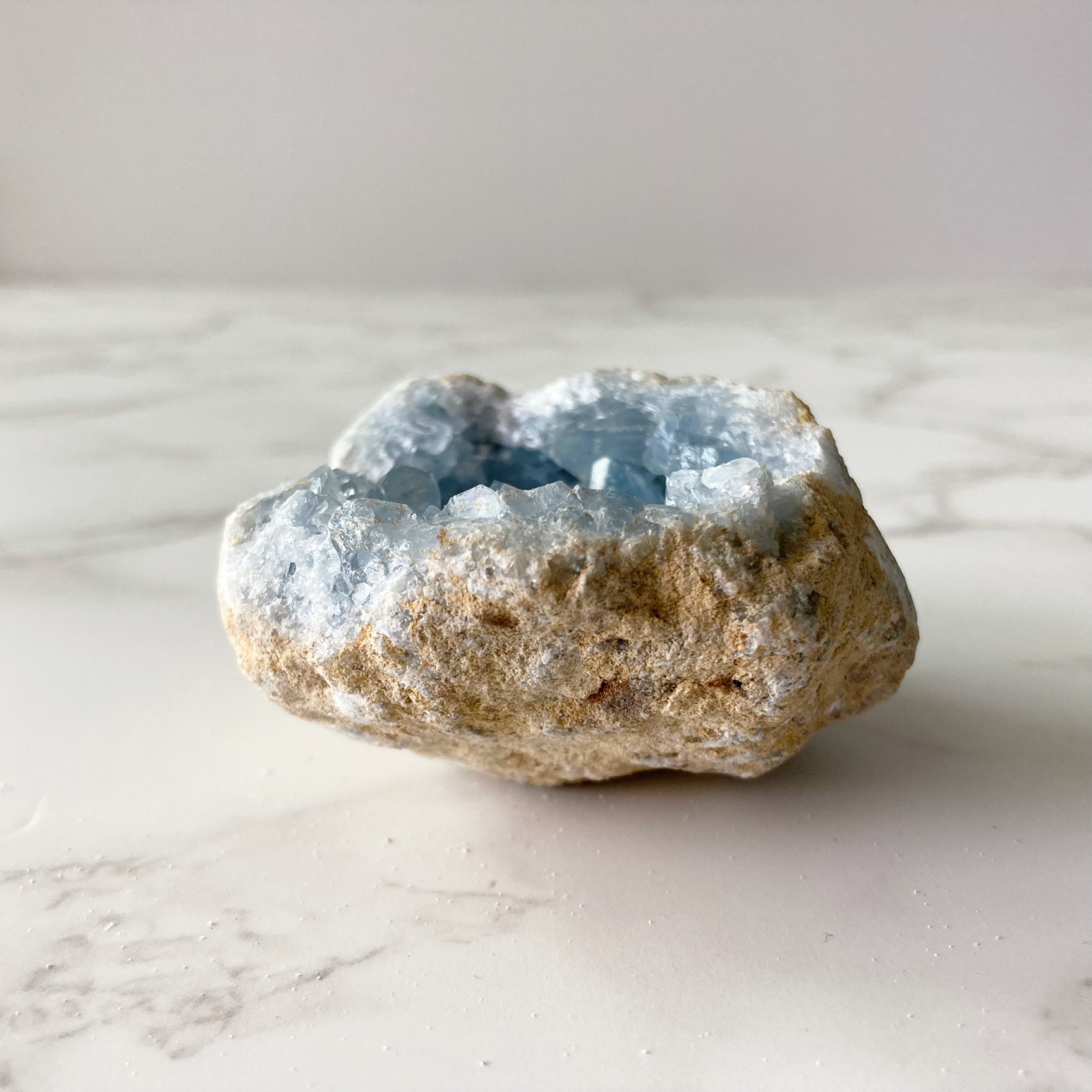 テリ艶が美しく、大きく濃いめのブルーの結晶とハートの形にも見えるジオードタイプの可愛いセレスタイトです。レインボーも見られます。