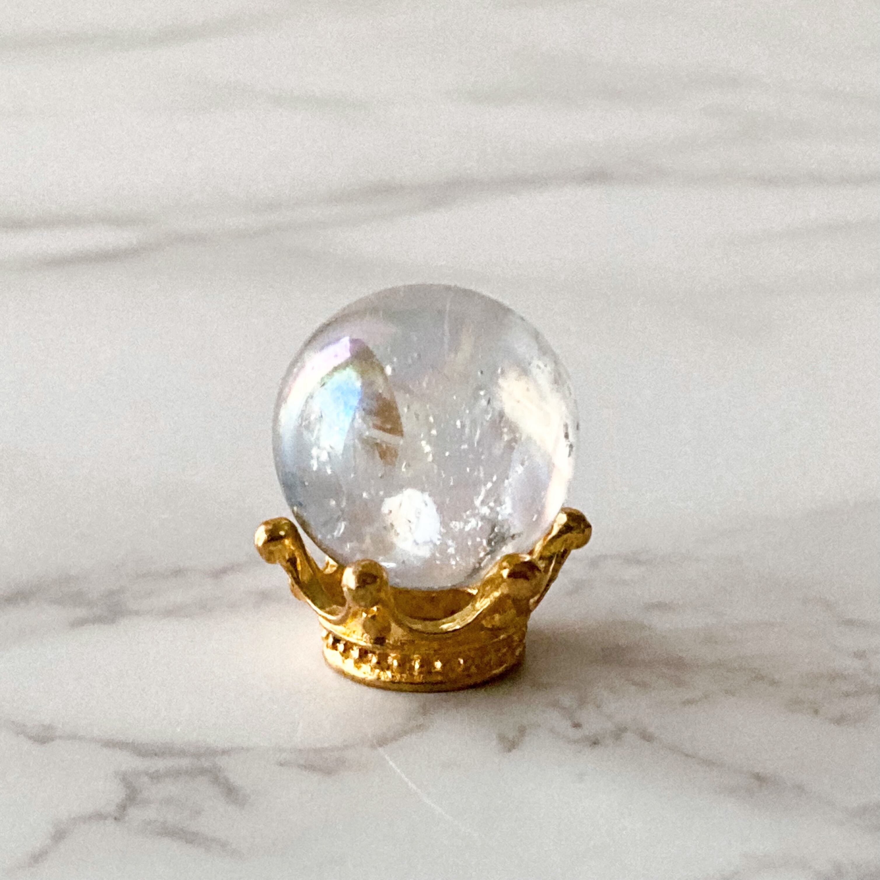 透明感のある水晶にエンジェルオーラ加工を施したミニサイズのスフィアです。王冠のデザインのスフィアスタンドをお付けします。