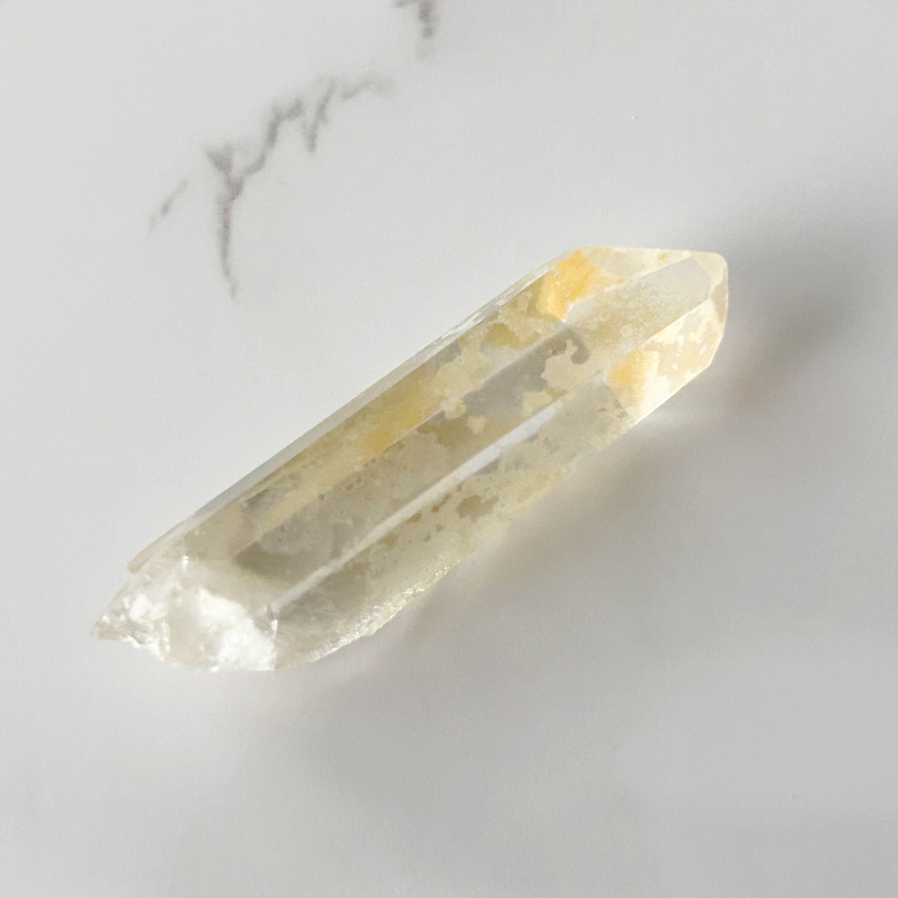 透明感とシャンパンゴールドカラーが美しい、アーカンソー州産ゴールデンヒーラーのポイントです。フューチャータイムリンクとパストタイムリンクが見られるマスタークリスタルです。