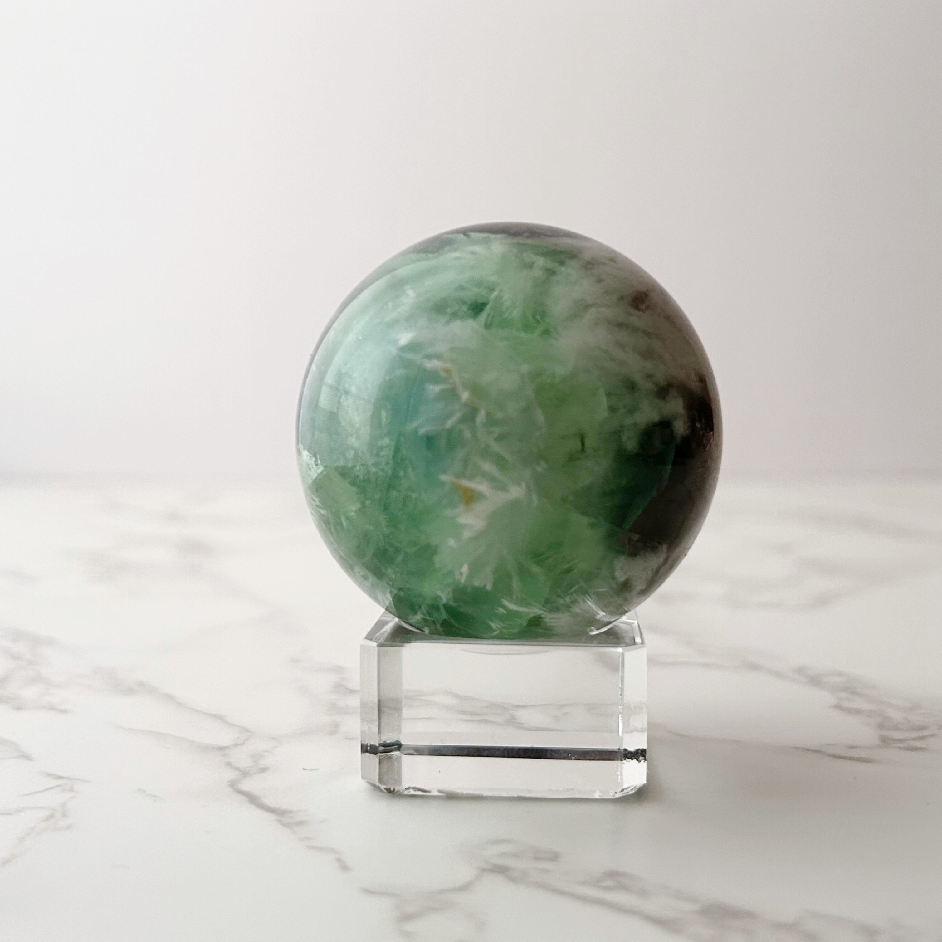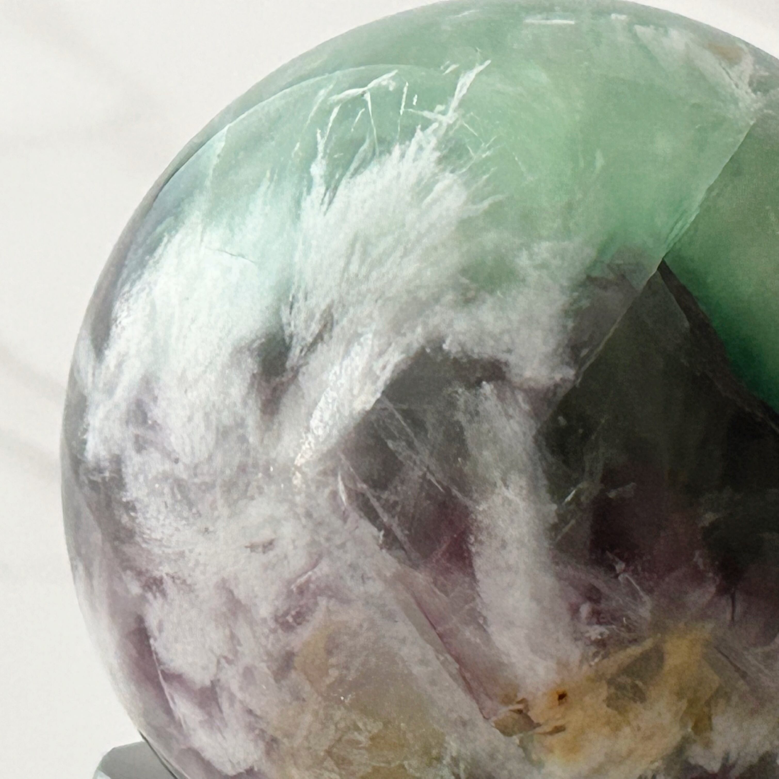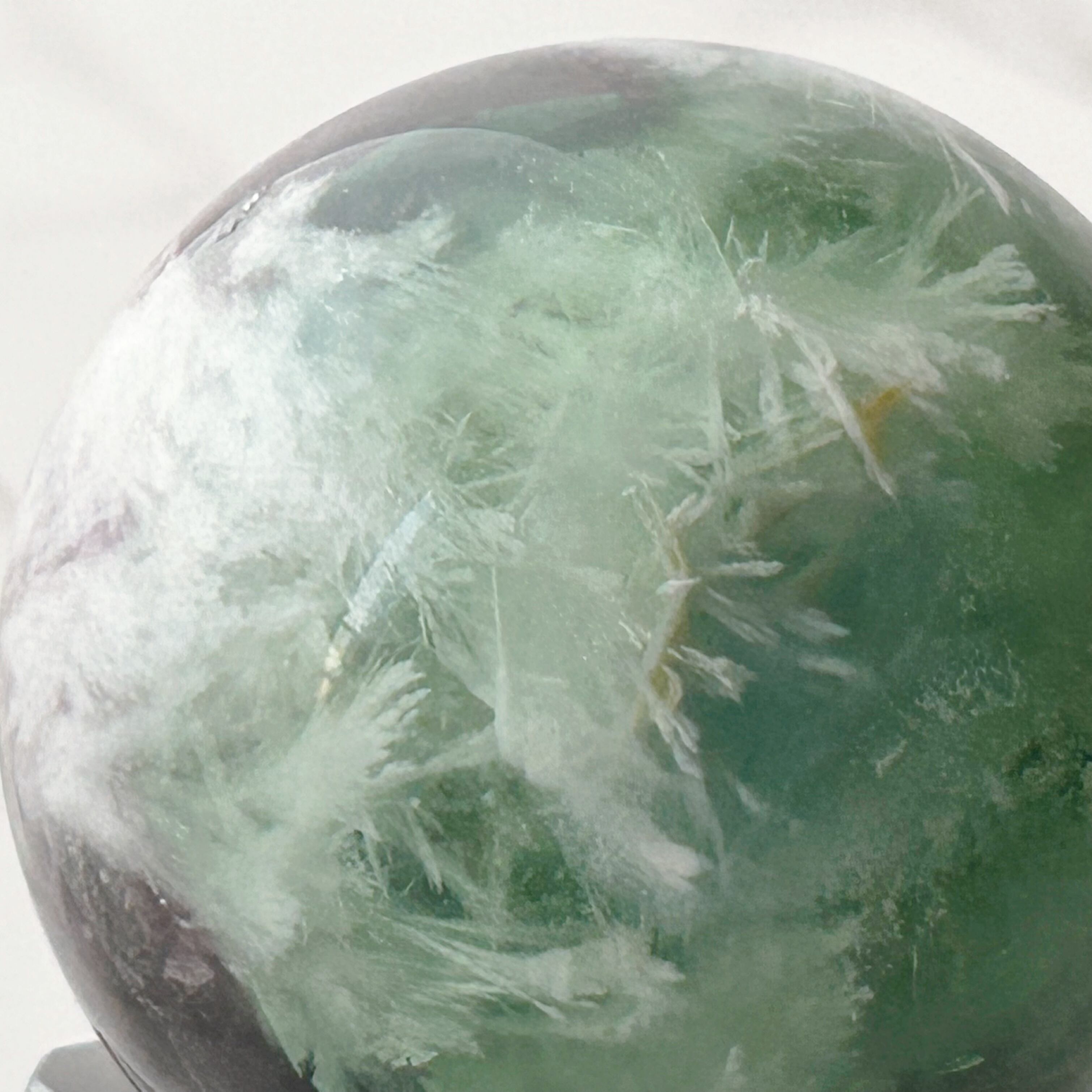 濃いめのグリーンとパープルに、真っ白なエンジェルフェザーが入ったフローライトのスフィアです。レインボーも見られます。