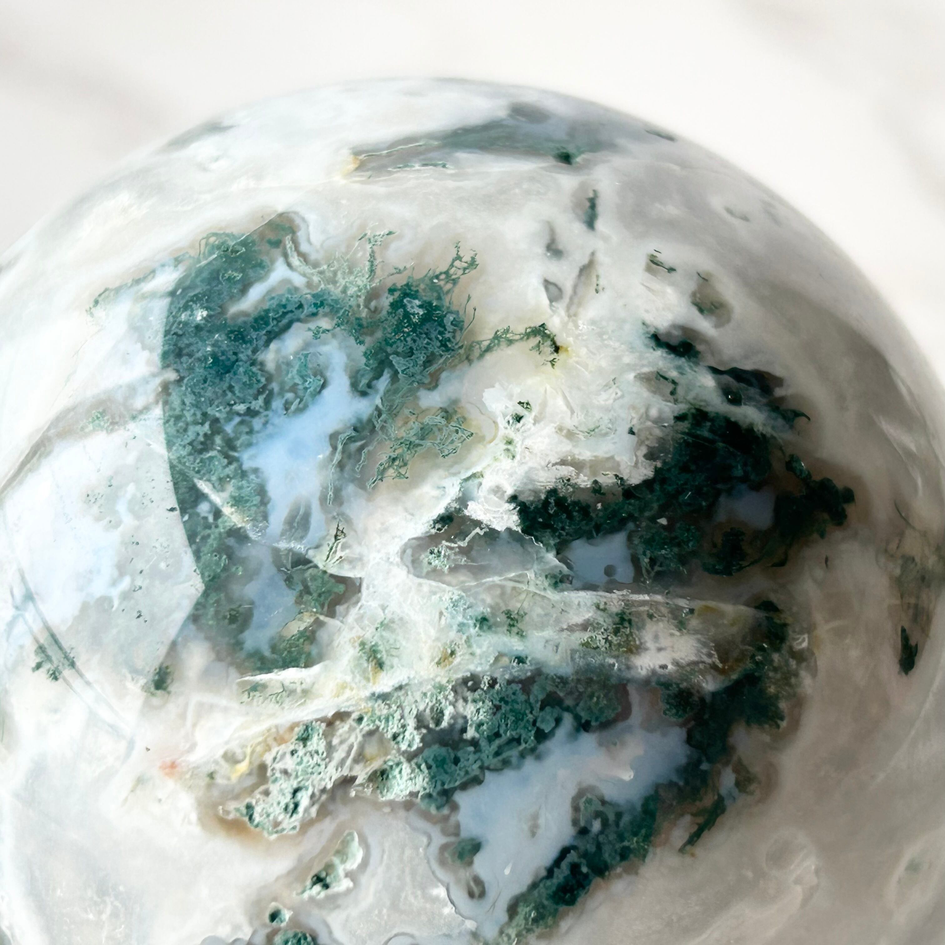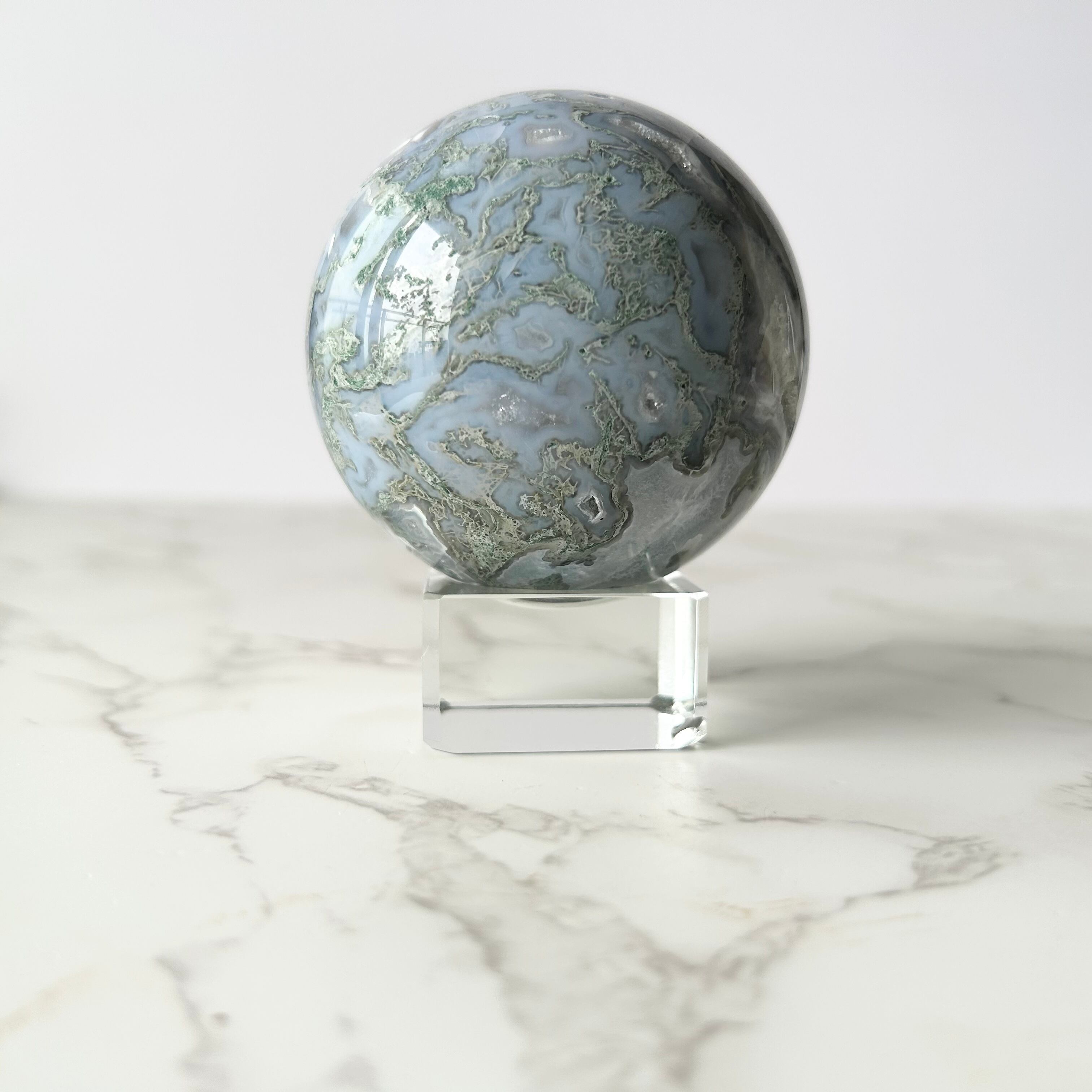 モスアゲートのスフィアです。クリアガラスのスタンドをお付けします。
