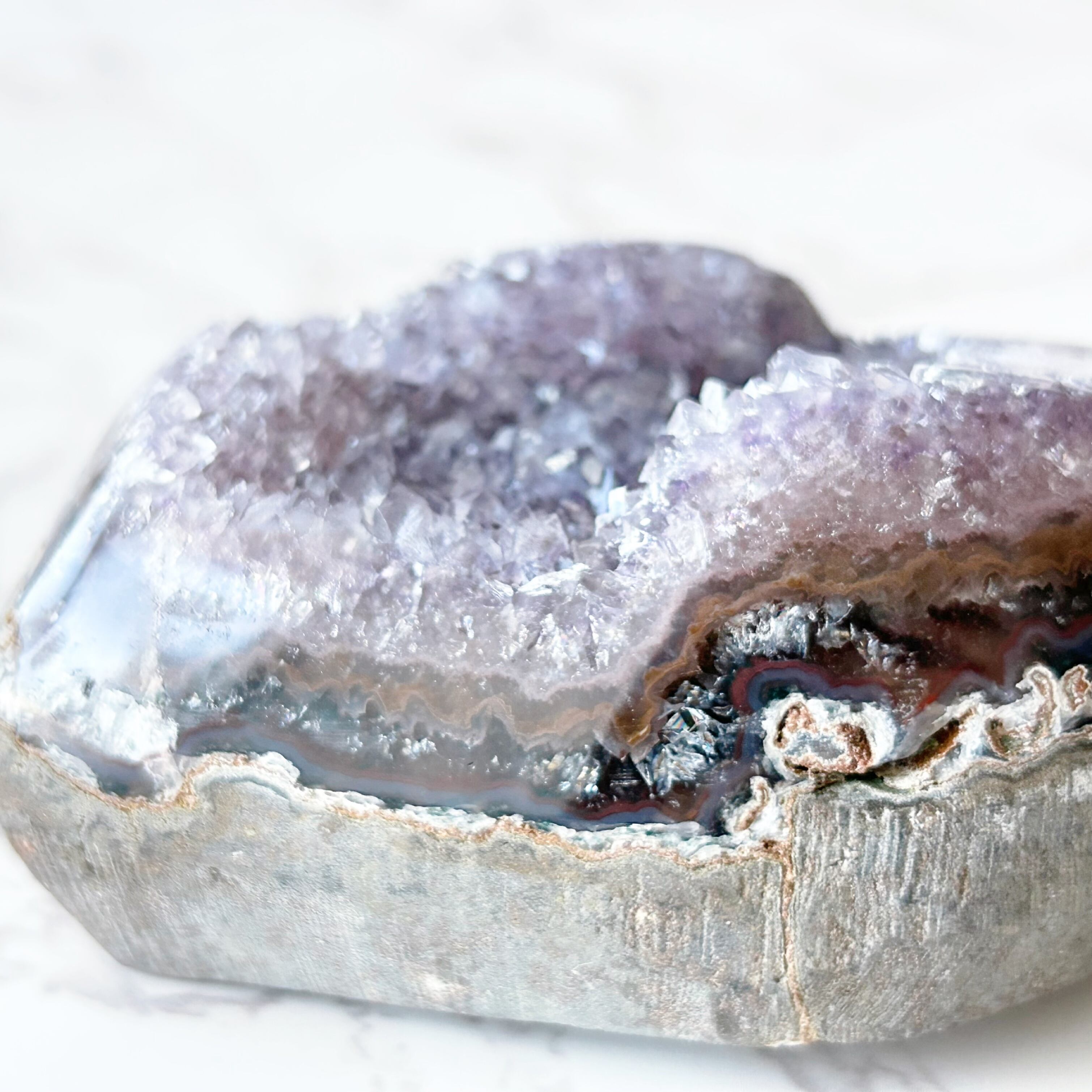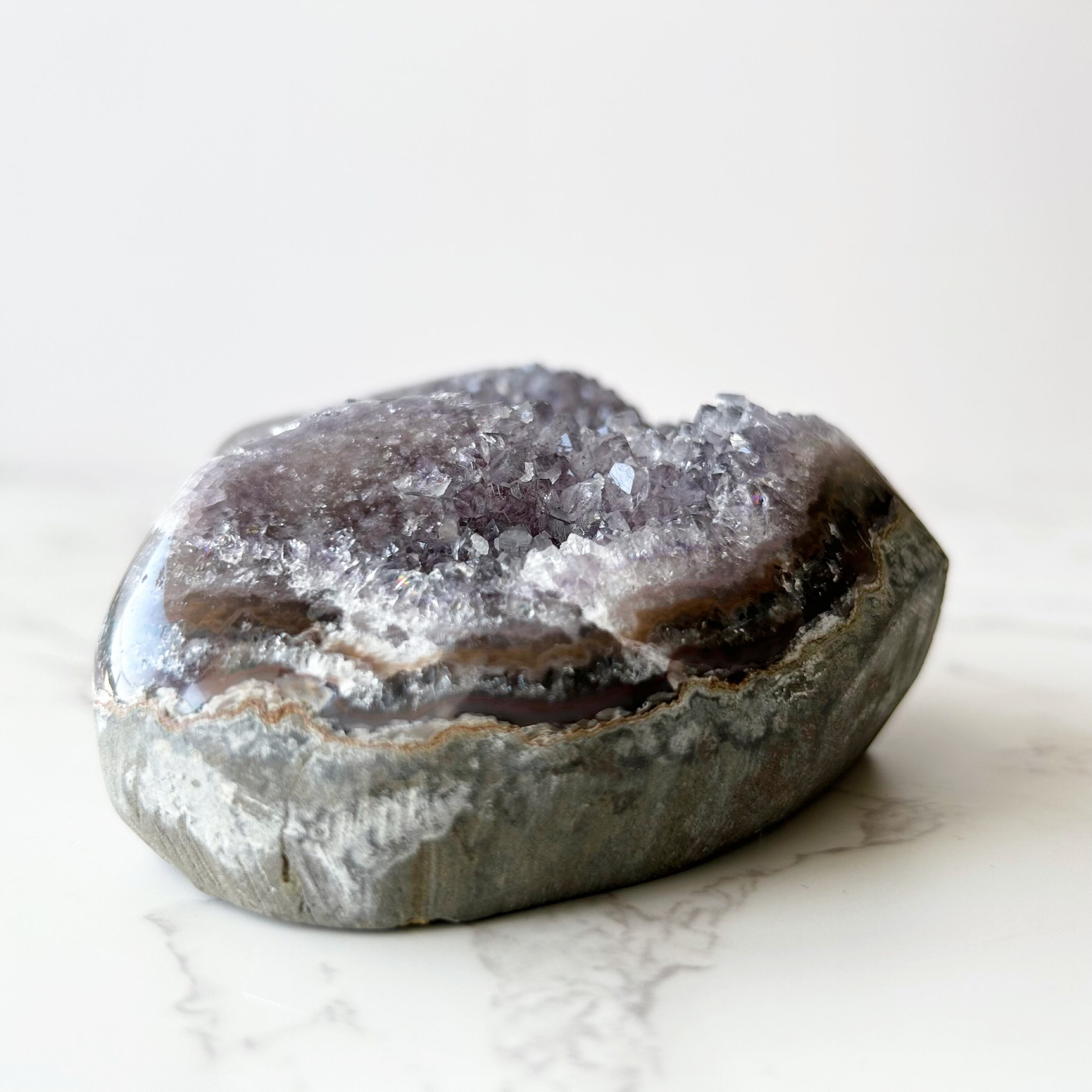 ハート形のラベンダーアメジスト・アゲート・クラスターです。アクセサリーや天然石の浄化にお使いいただけます。ラベンダーカラーのアメジストの結晶と、アゲート部分の縞模様、ぷっくりしたハートの形がステキです。