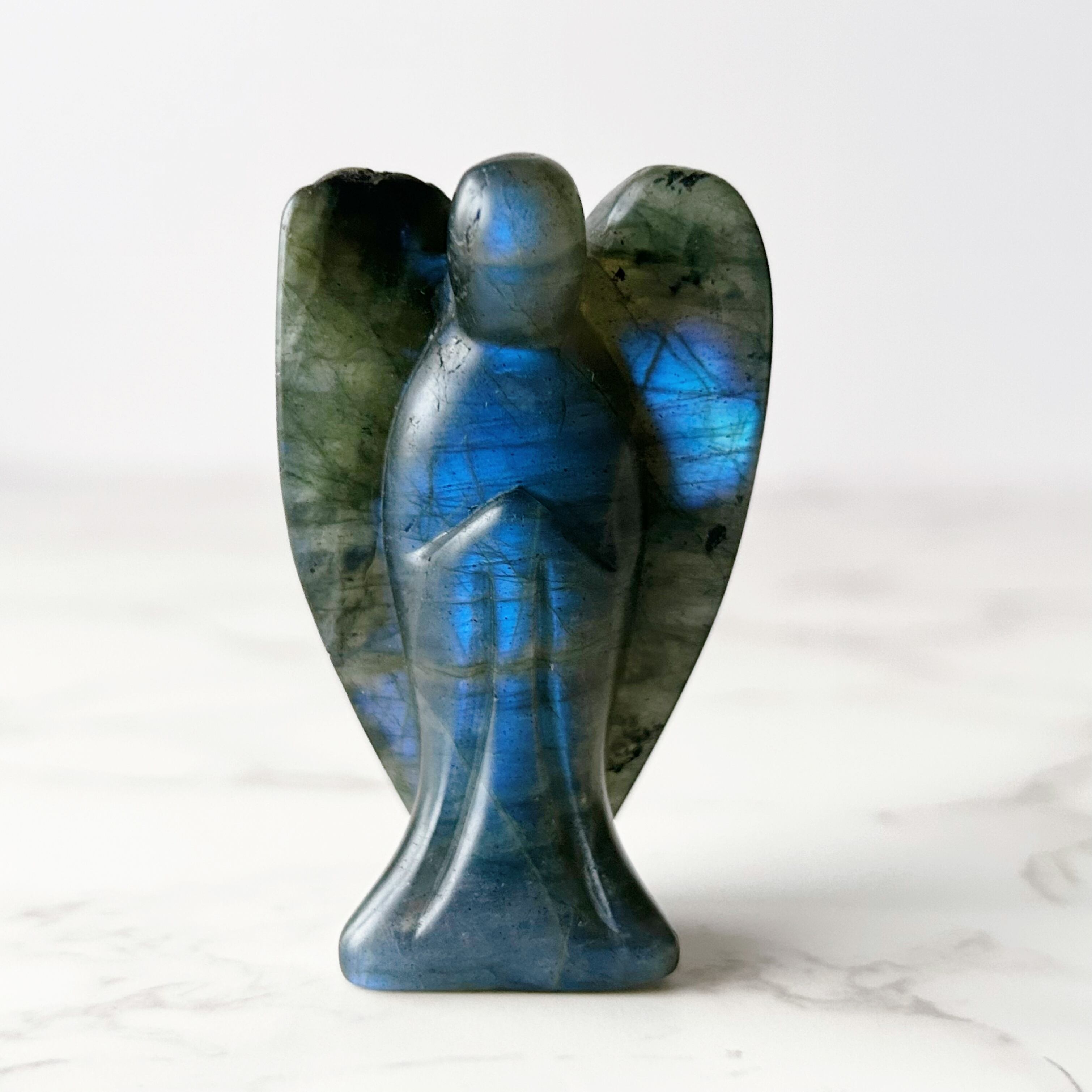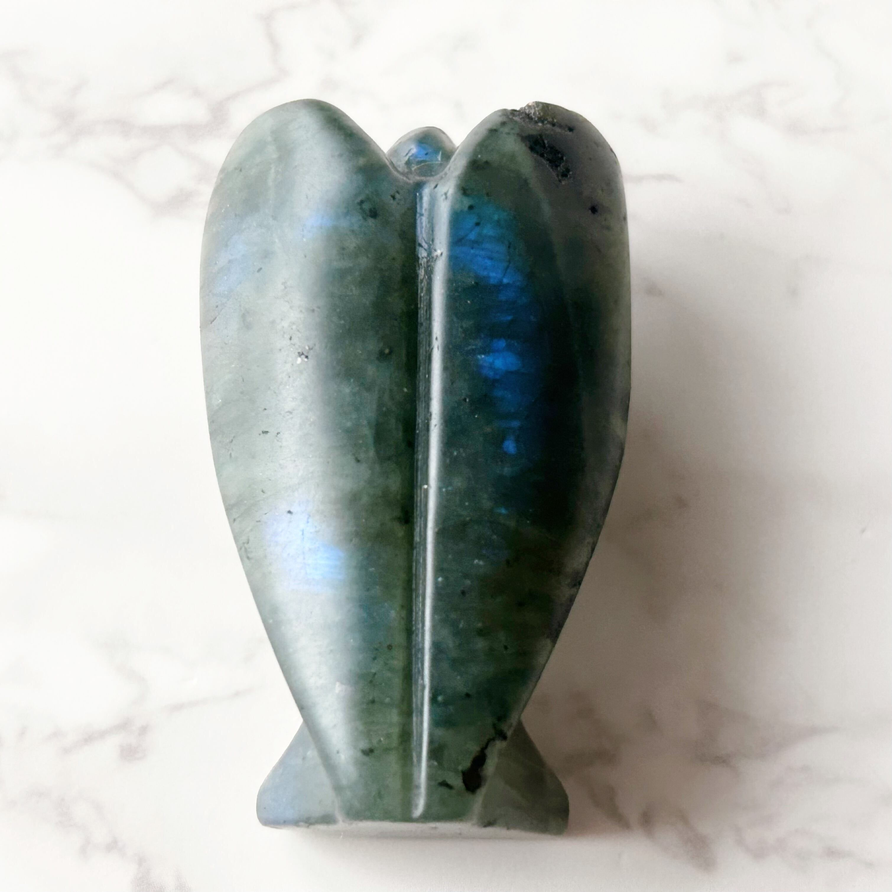 天使の形のラブラドライトです。濃いブルーのシラーがとてもキレイです。右の羽の上の部分に凹みがありますが天然のものです。画像でご確認ください。