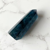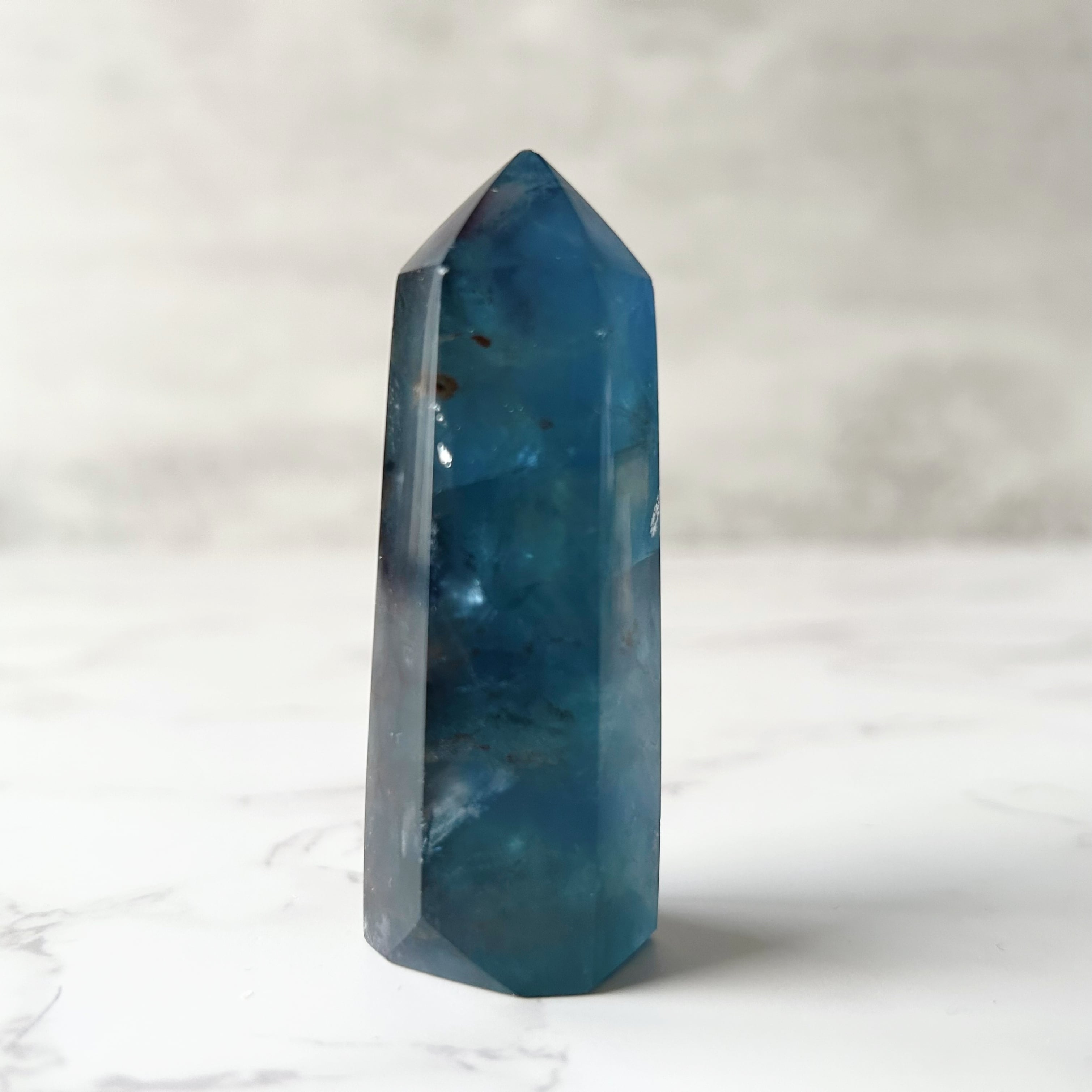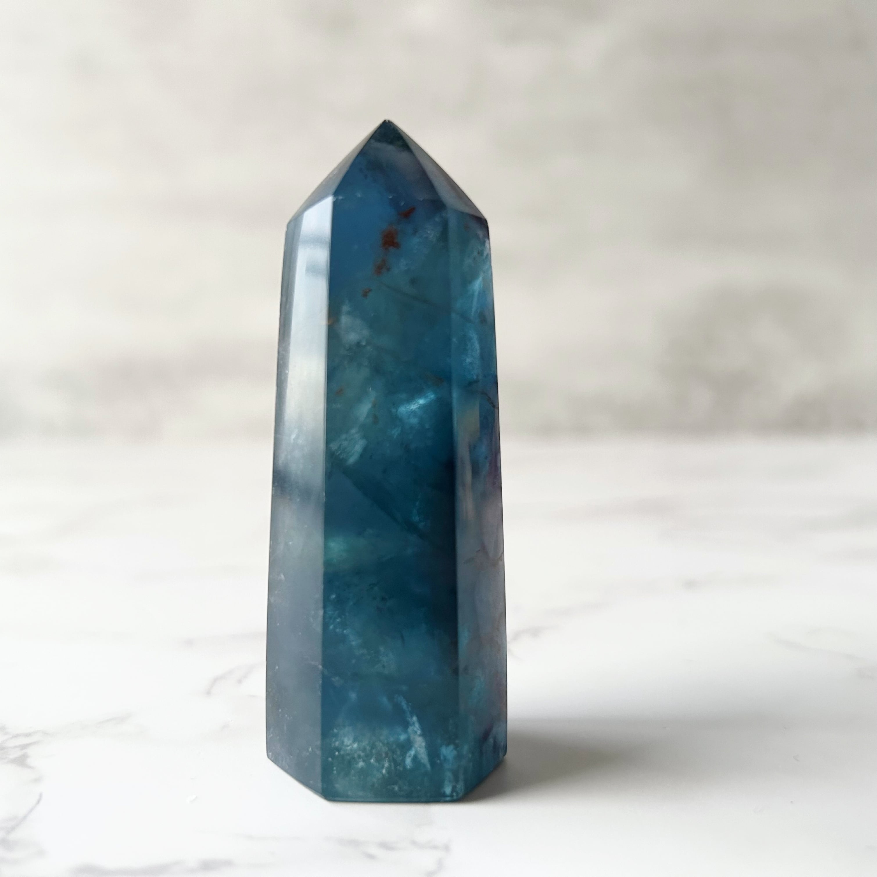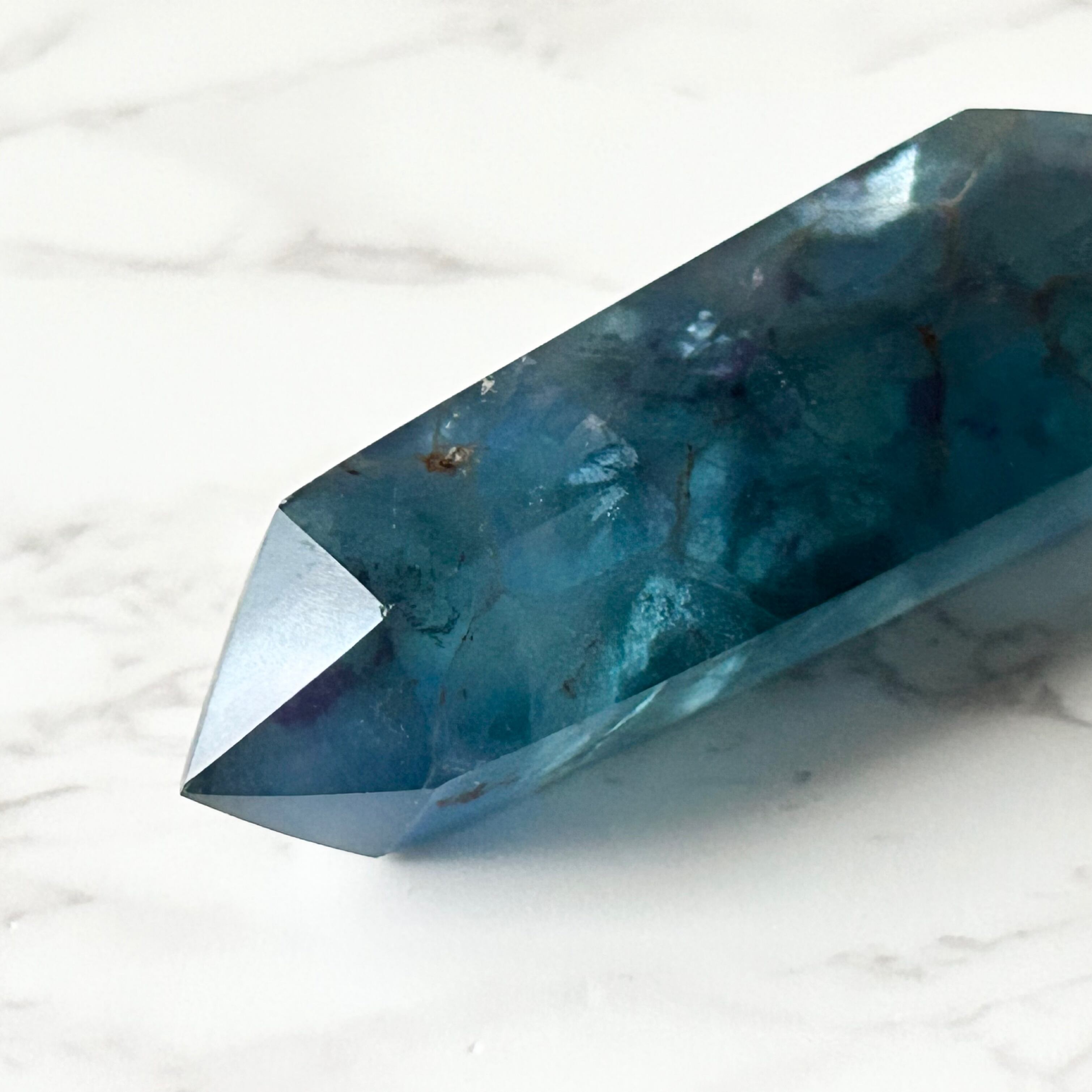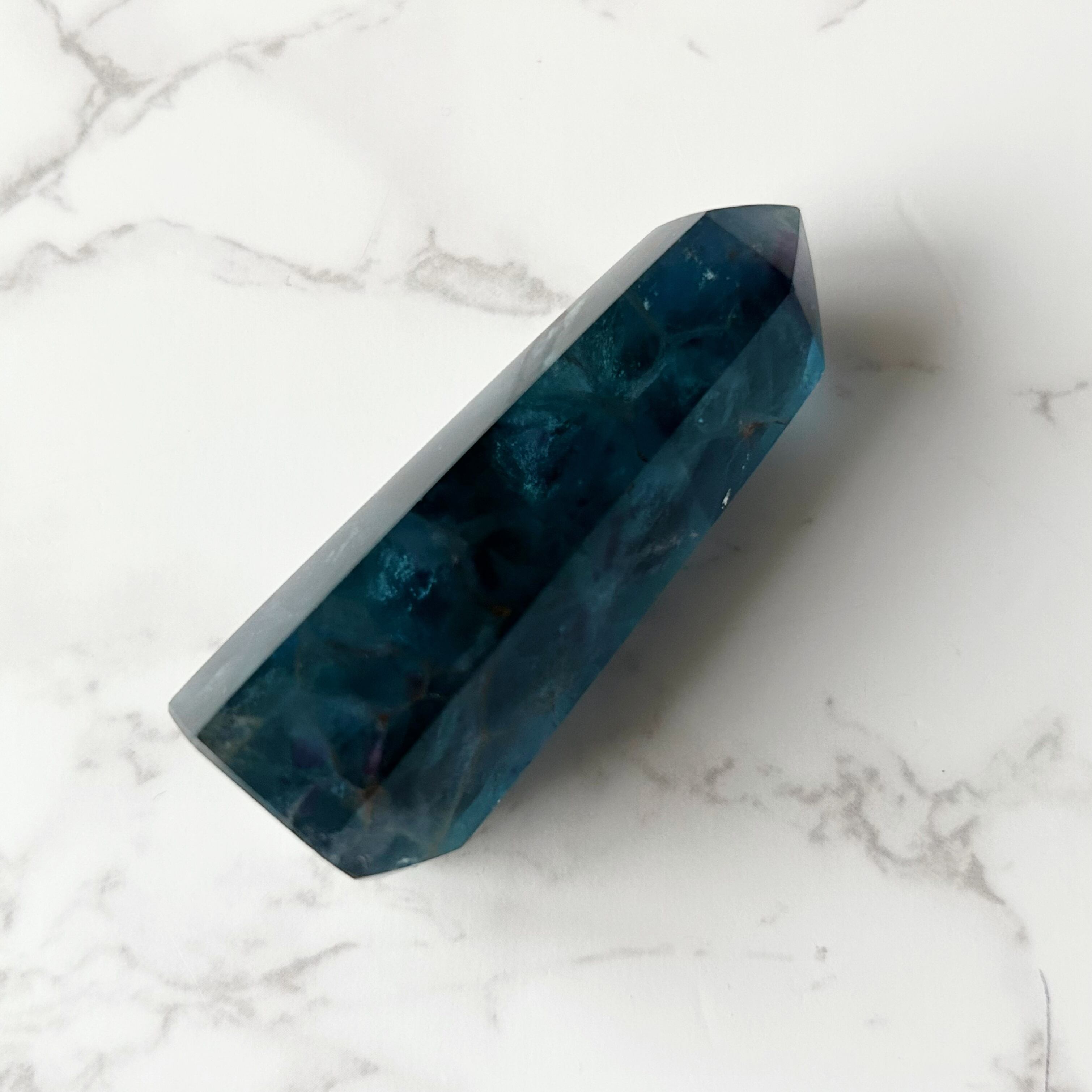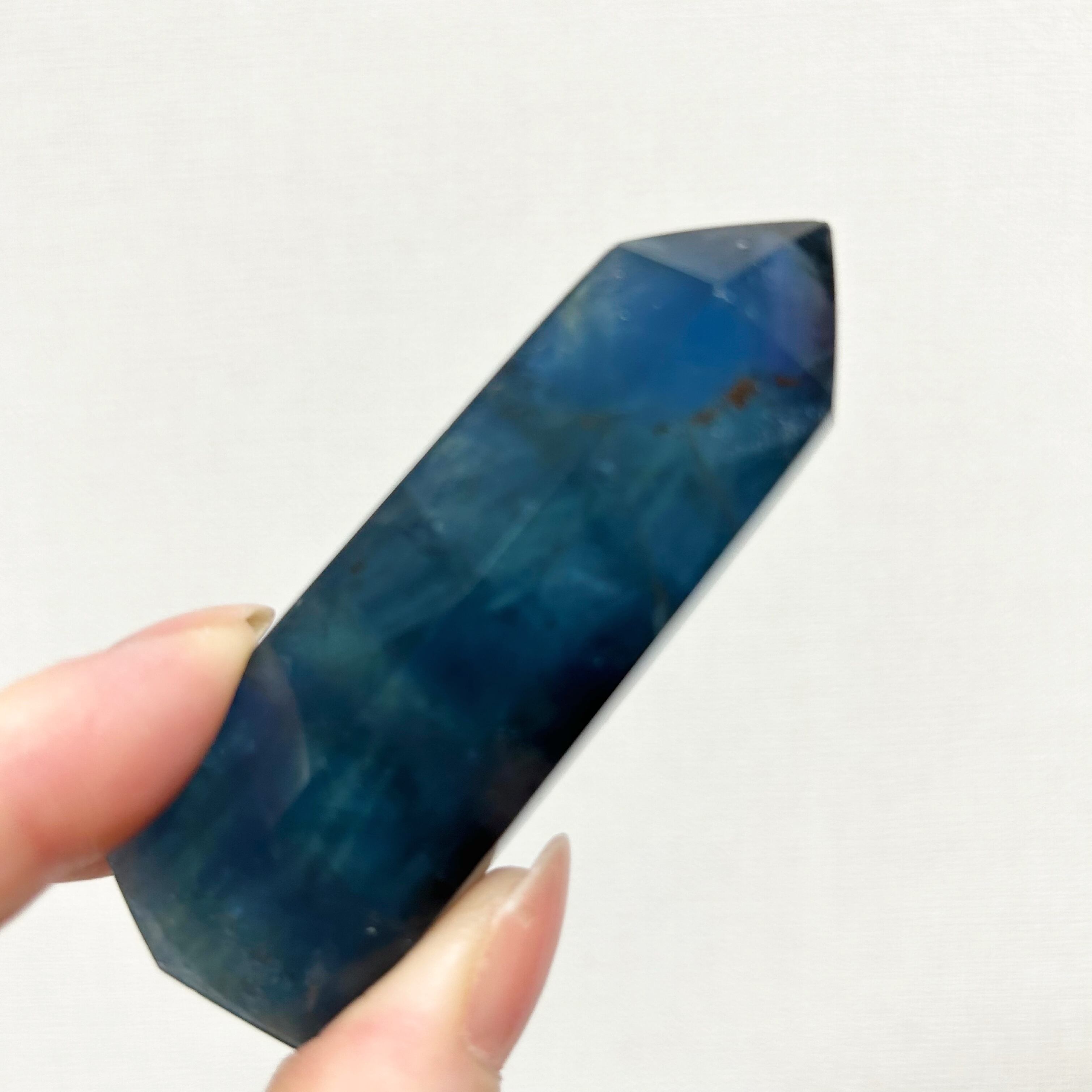 深いブルーと虹がキレイなフローライトのポイントです。底面が一部、斜めにカットされたデザインです。画像でご確認ください。